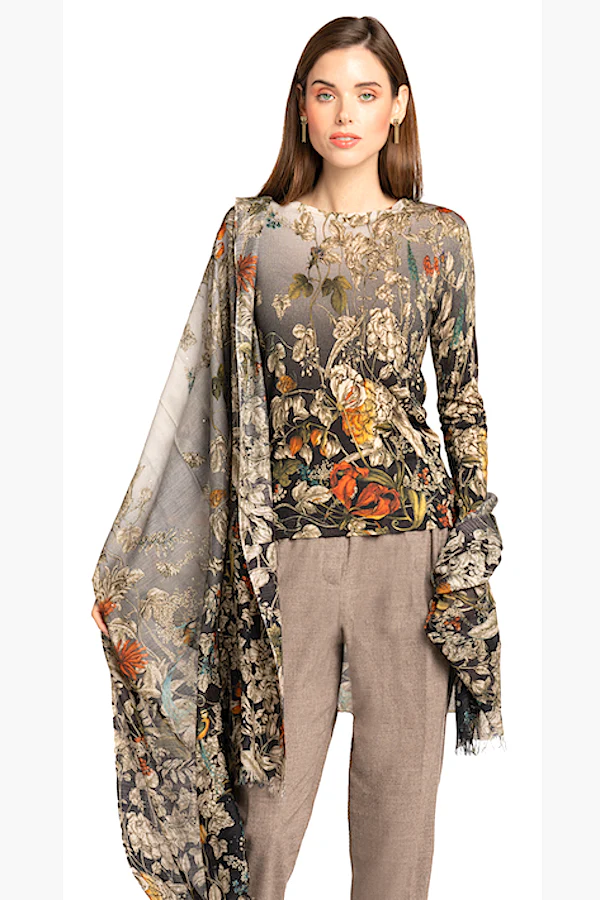 80% Cashmere 20% Silk Superfine Printed Stole. Floral Print on Dark Grey/Brown Background. One Size (TU). 70 x 200 cm. Entirely manufactured in Italy In our own workshops.