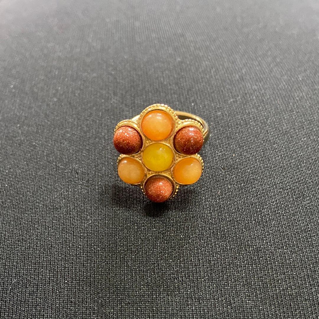 Bague ajustable plaqué or avec 7 pierres semi-précieuses multicolores en forme de fleur, dans les tons jaune orange, de la marque Shabada.