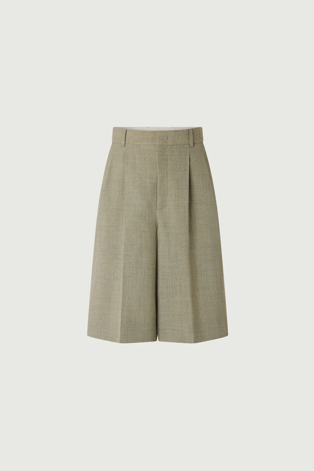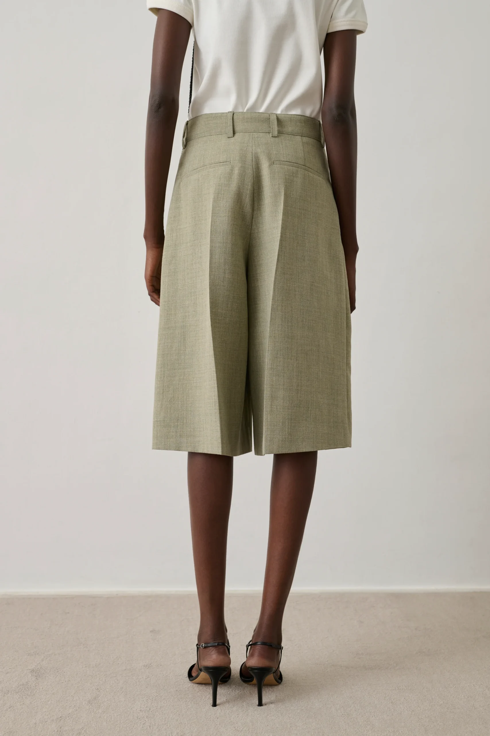 – Jambes larges – Longueur genoux – Ouverture avec crochet intérieur, bouton de renfort et zip – Deux poches italiennes devant – Plis marqués le long de la jambe devant et dos – Toile de polyester et lin chinée