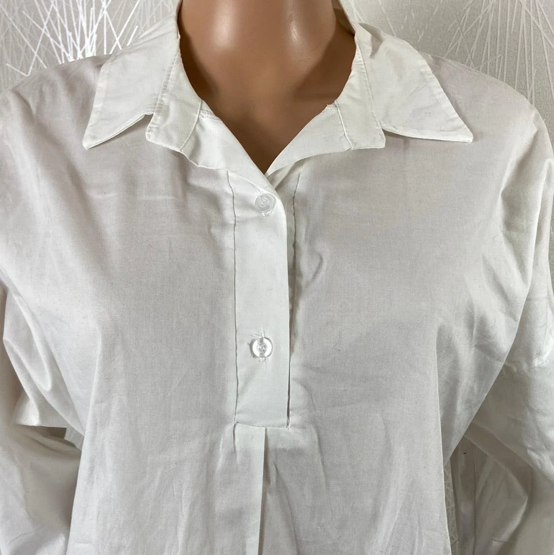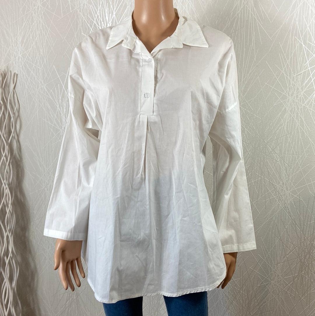 Blouse blanche pour femme de la marque New Collection. Manches longues, col chemise, coupe ample, encolure boutonnée et légèrement transparente. Matière : 95% coton – 5% spandex Couleur : Blanc Marque : New Collection Taille Unique – Réf : TUQB4390 Dimensions : Tour de poitrine : 110 cm ; longueur : 73 cm.