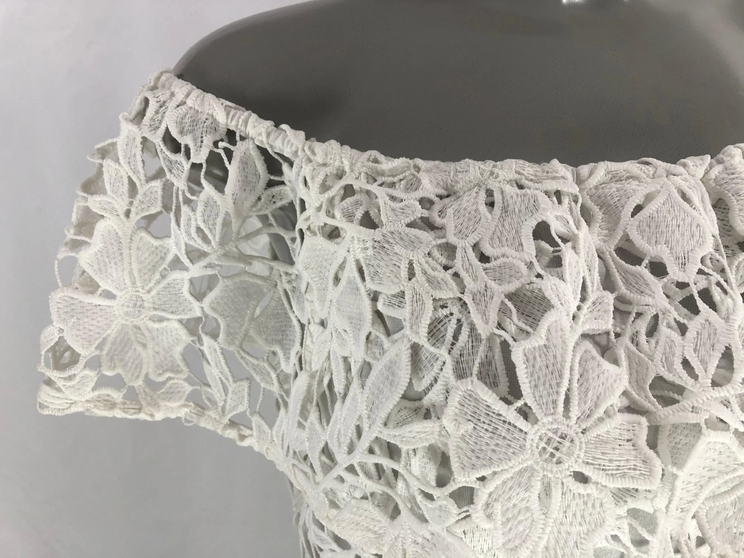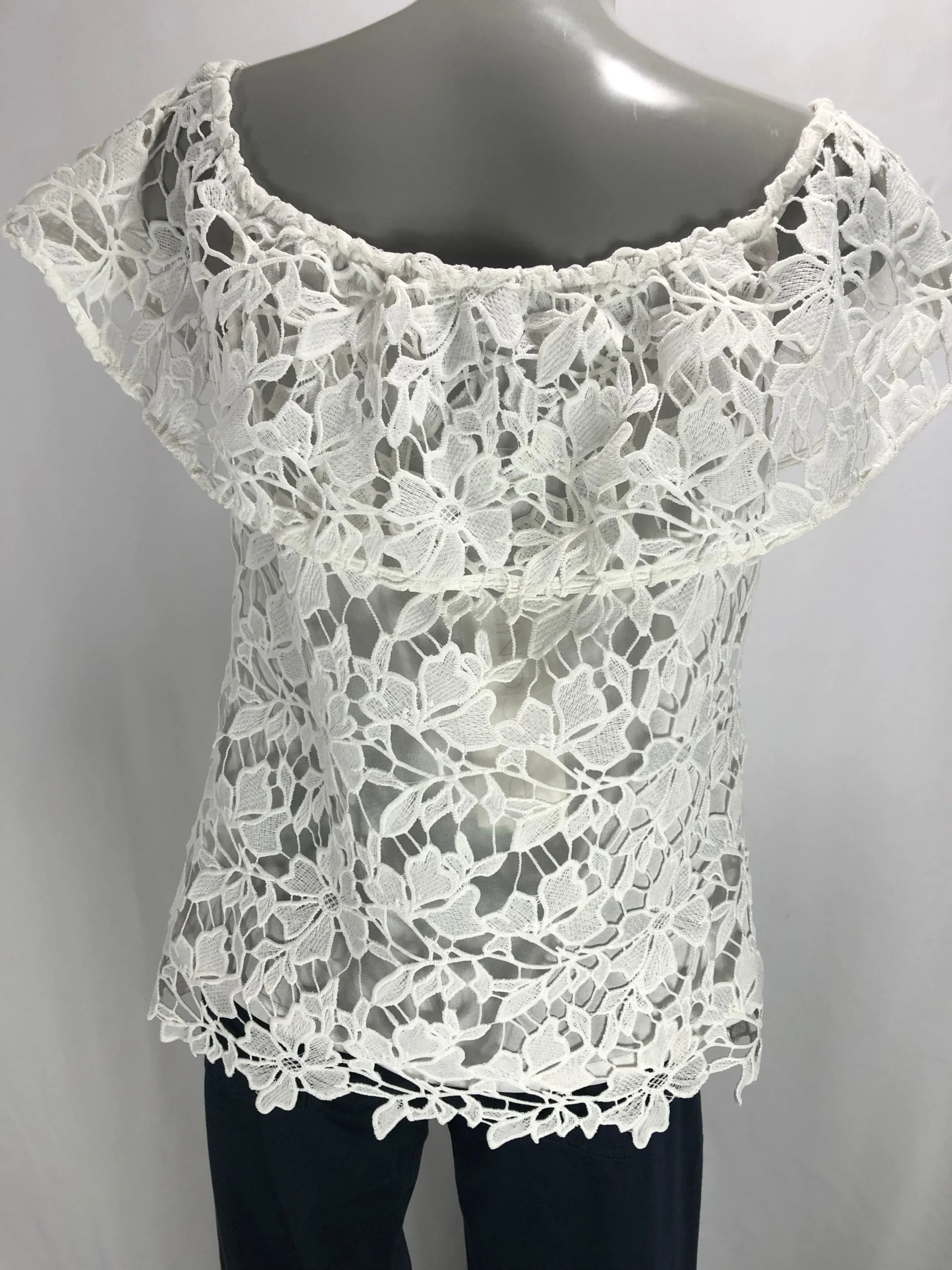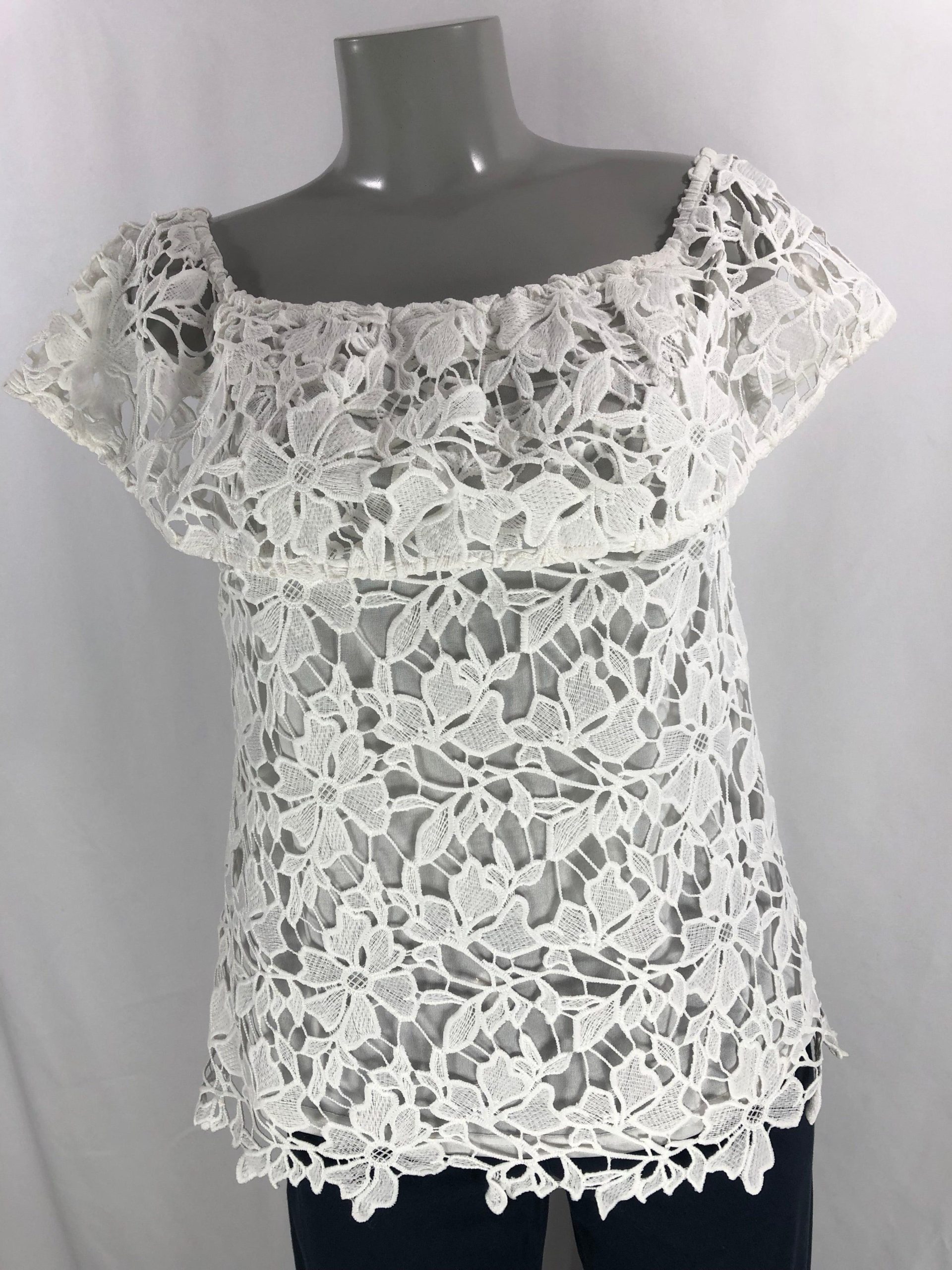 Jolie blouse en dentelle à épaules dénudées. Une blouse pour femme de belle qualité,très stylée, tout en dentelle doublée. Belle fabrication haut de gamme de la marque Passioni. 100% polyester Couleur : Blanc Taille 36 Réf : 36AB973 Taille 40 Réf : 40AB972 Valeur en boutique 95 €