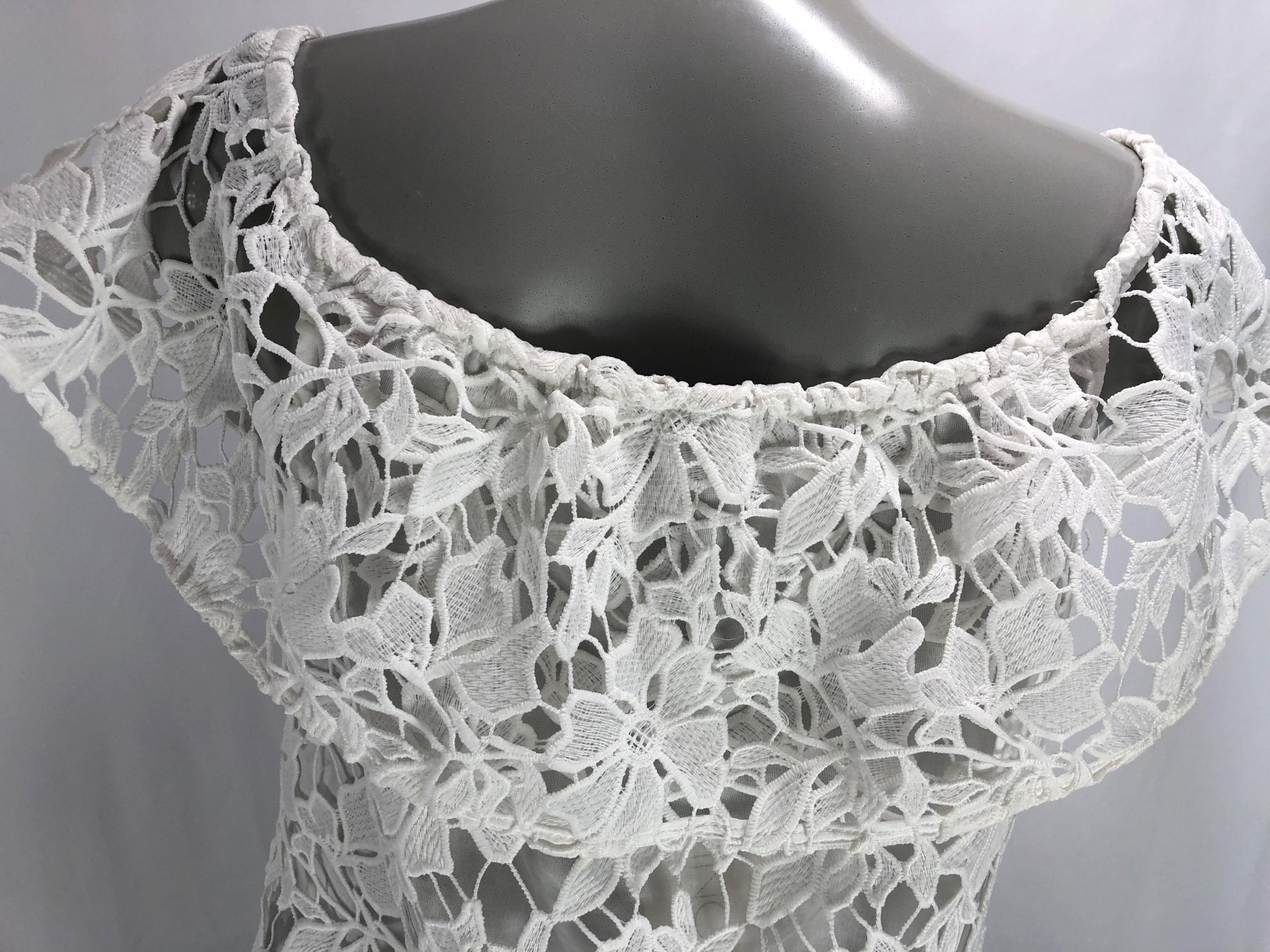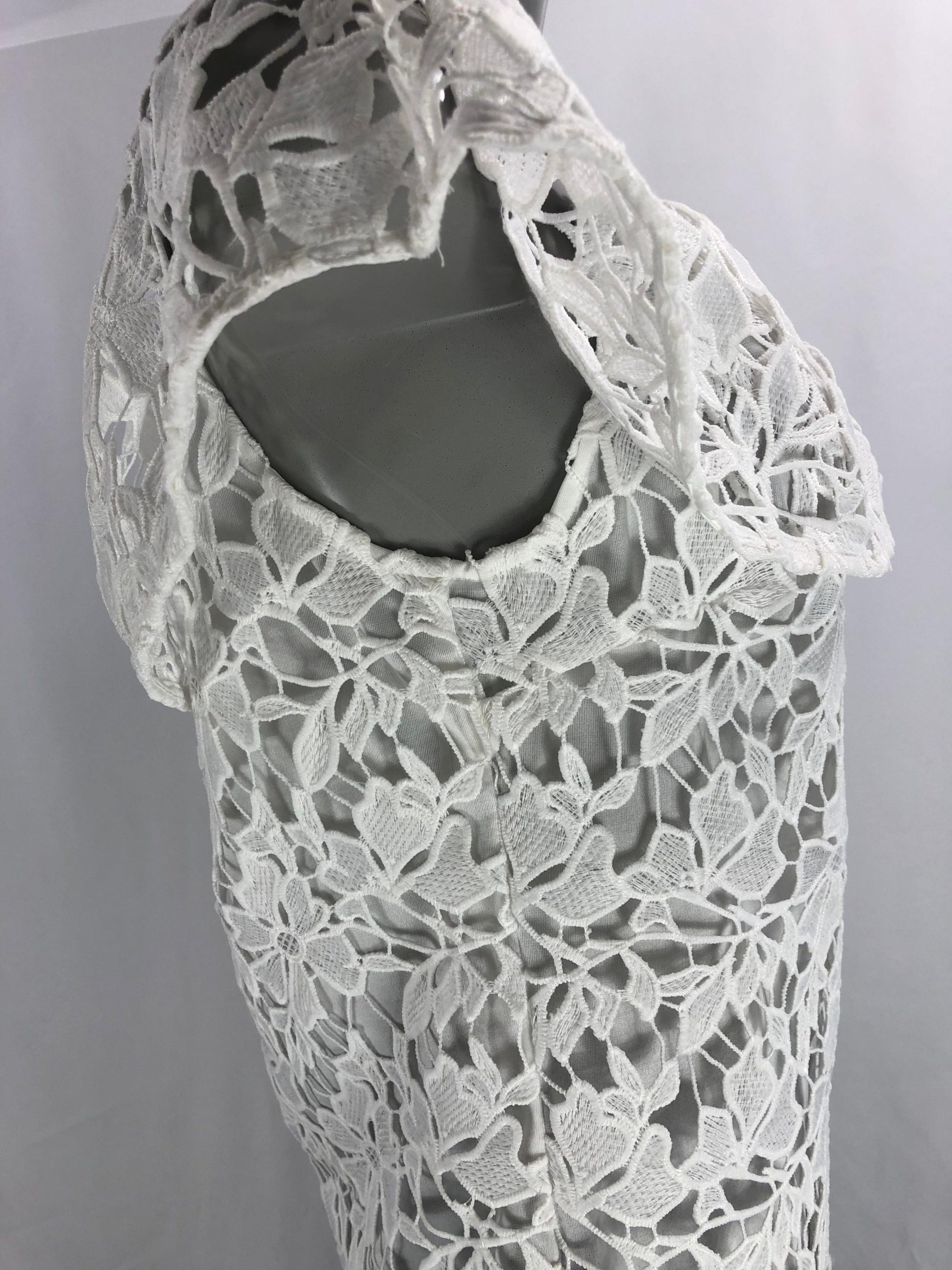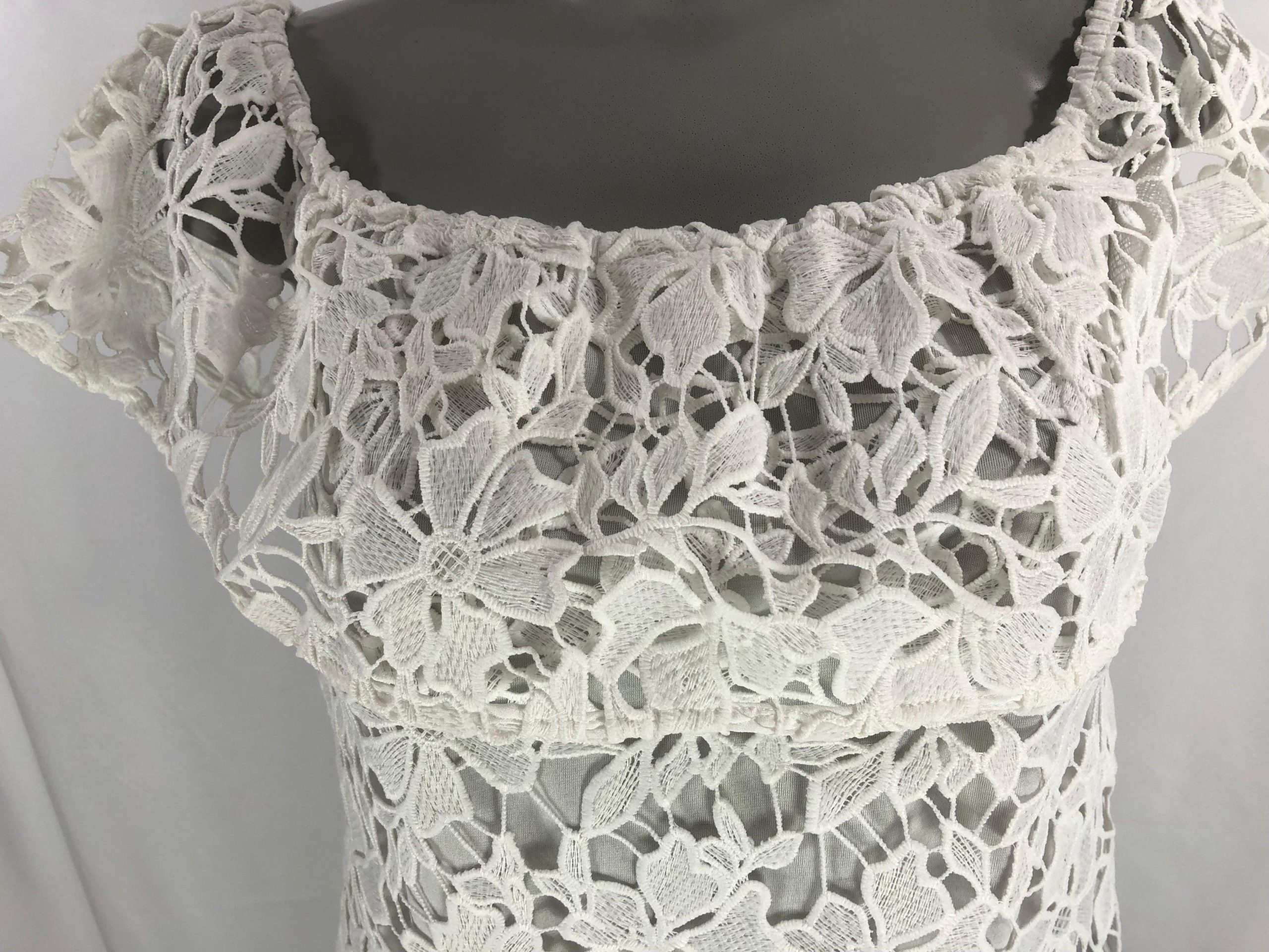 Jolie blouse en dentelle à épaules dénudées. Une blouse pour femme de belle qualité,très stylée, tout en dentelle doublée. Belle fabrication haut de gamme de la marque Passioni. 100% polyester Couleur : Blanc Taille 36 Réf : 36AB973 Taille 40 Réf : 40AB972 Valeur en boutique 95 €