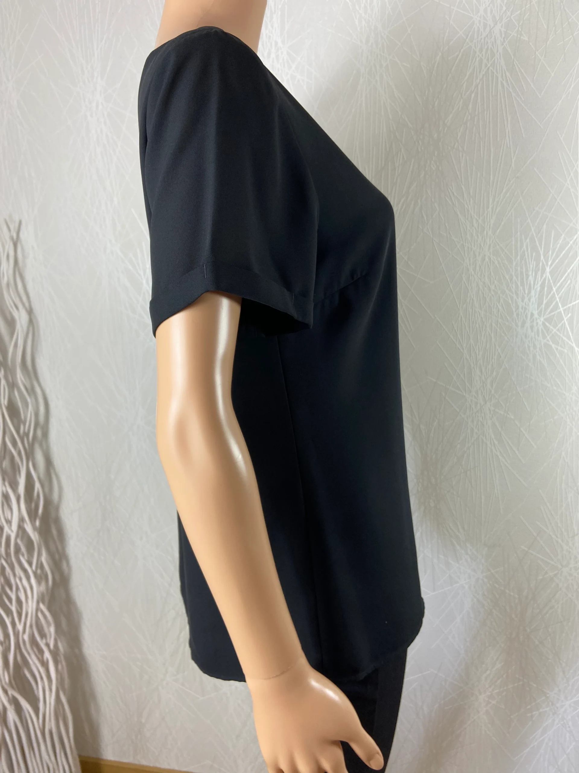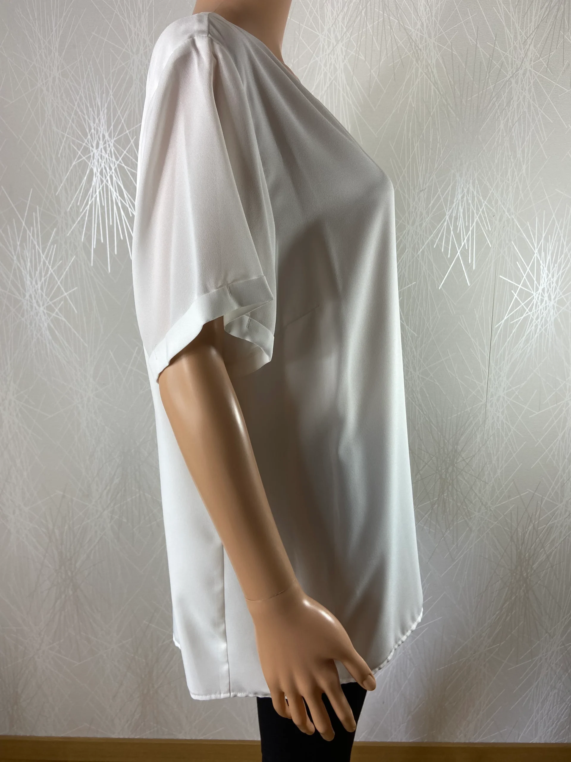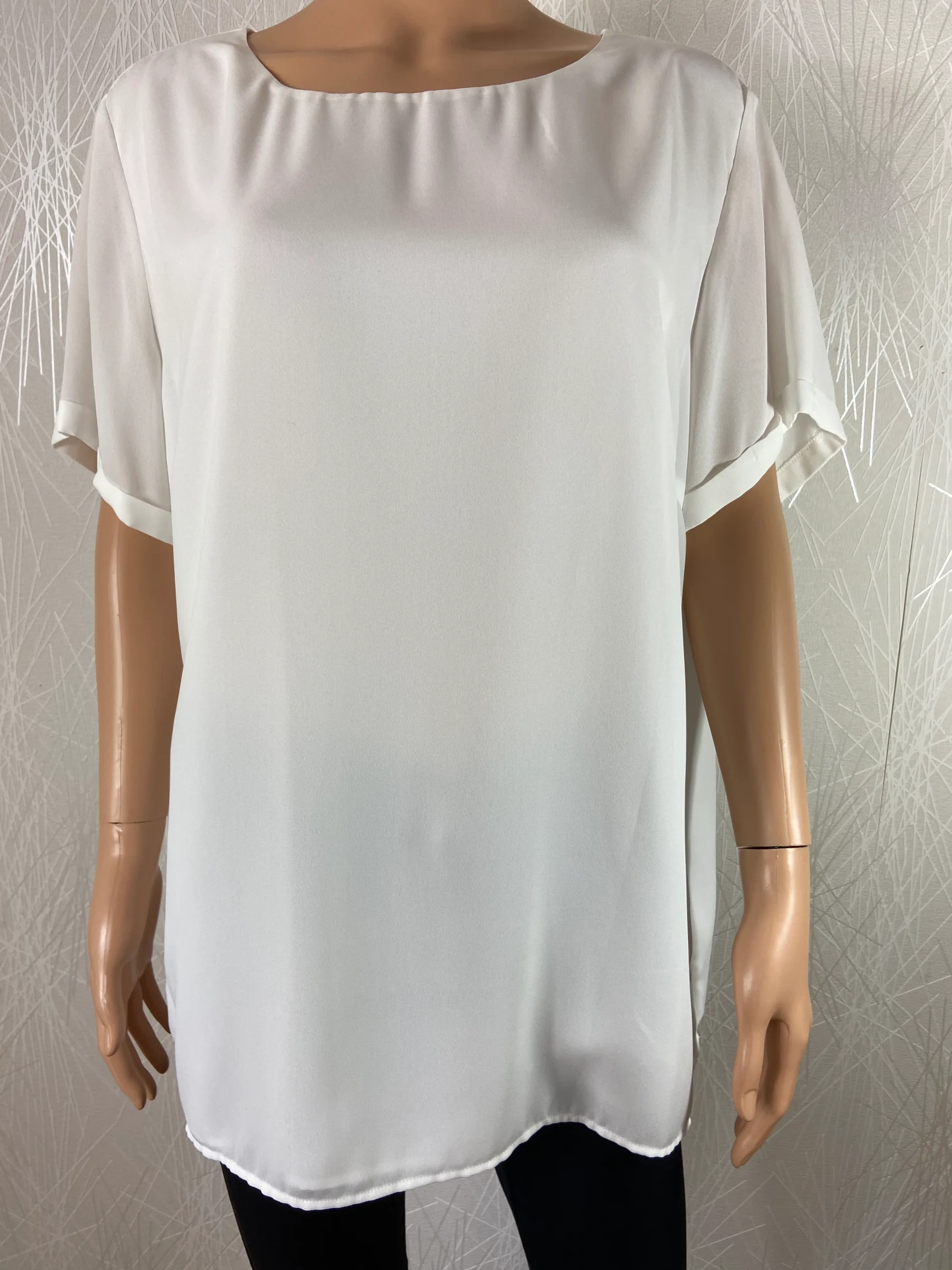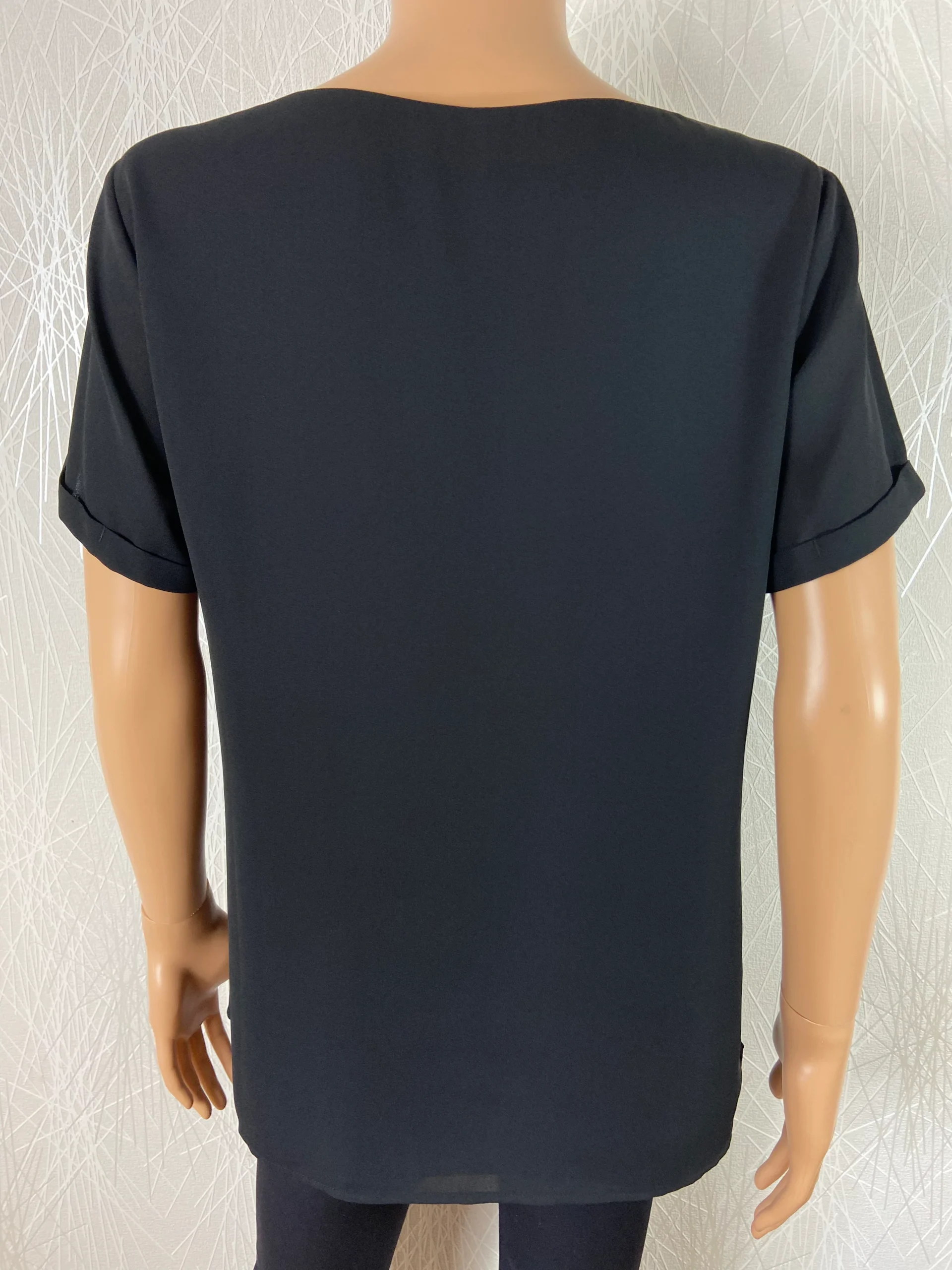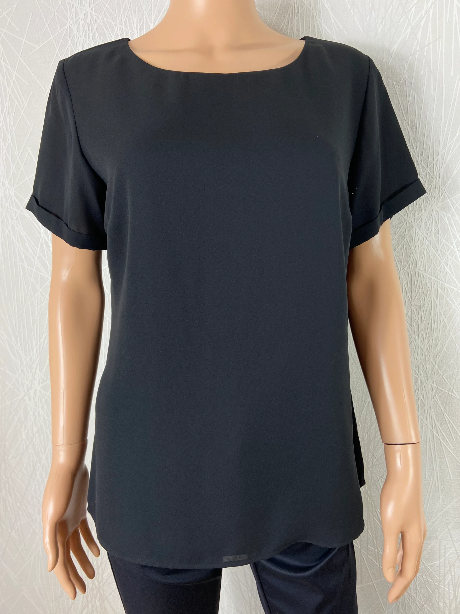 Blouse doublée, manches courtes avec revers, encolure arrondie et coupe droite.
