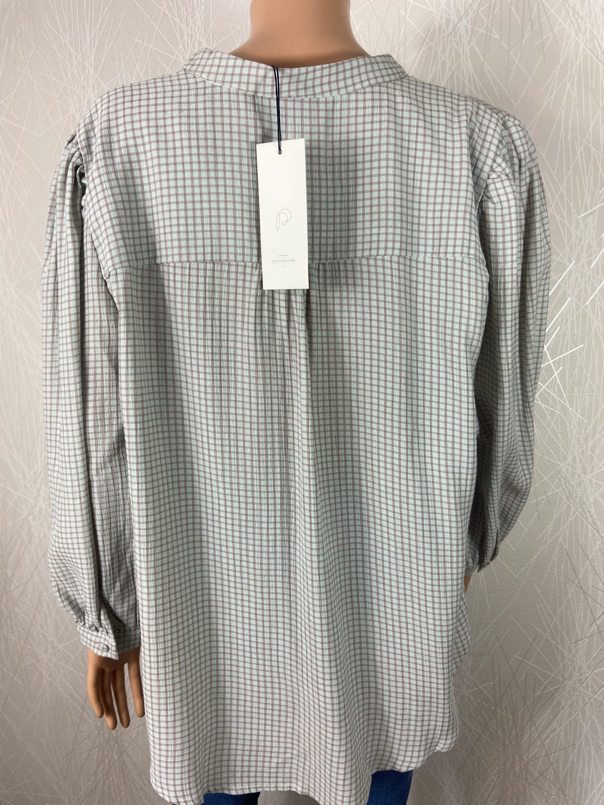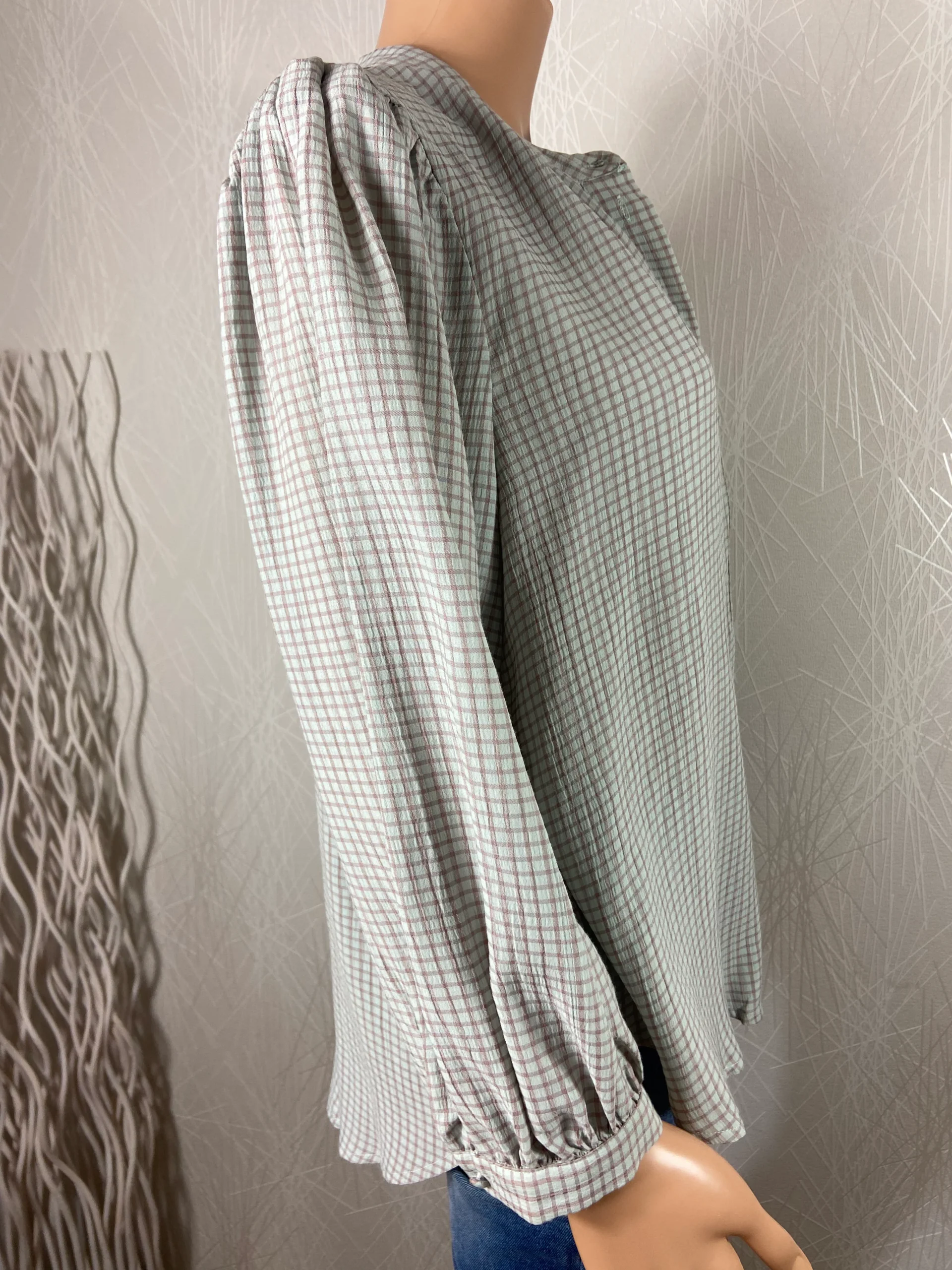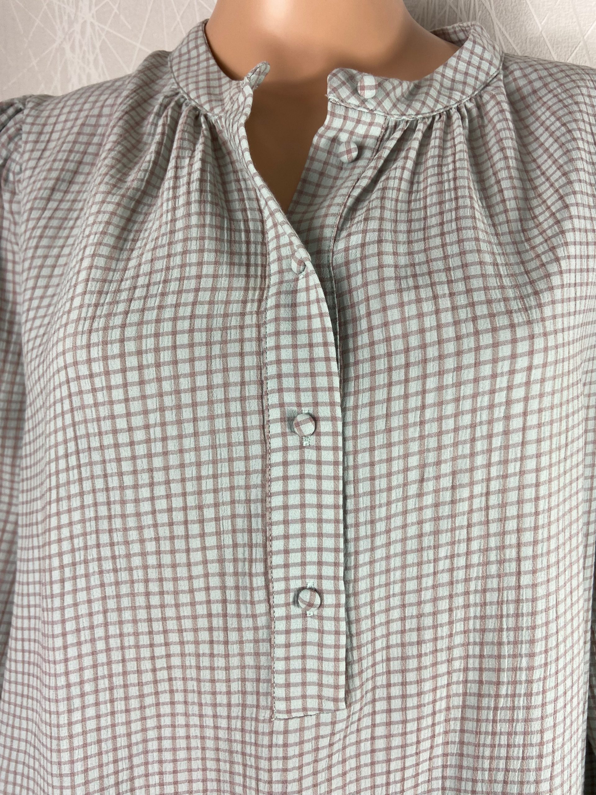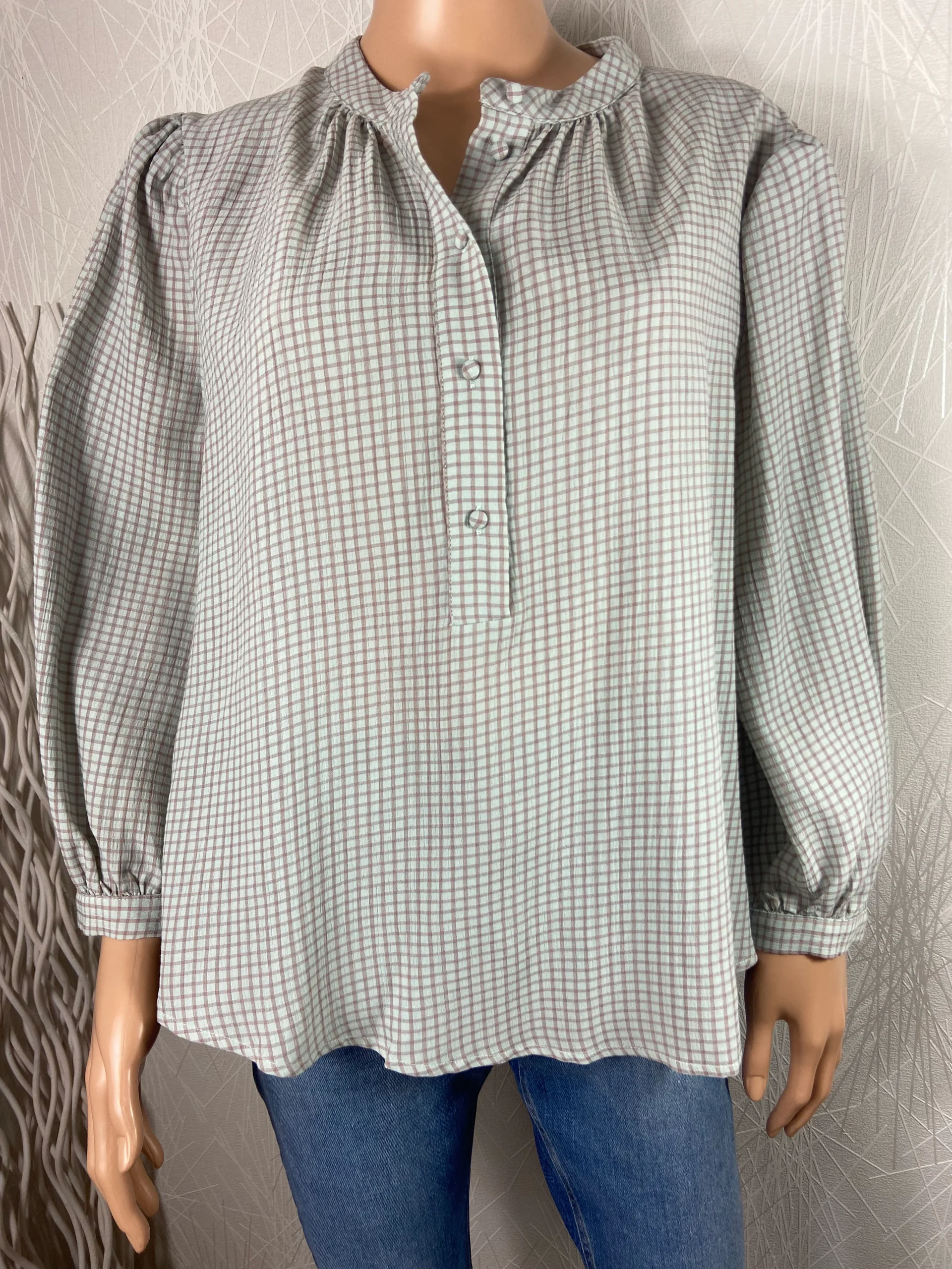 Une jolie blouse de bonne facture, à motifs de carreaux, couleur vert pastel et brun, de l’excellente marque Peppercorn, à prix sympa de déstockage.