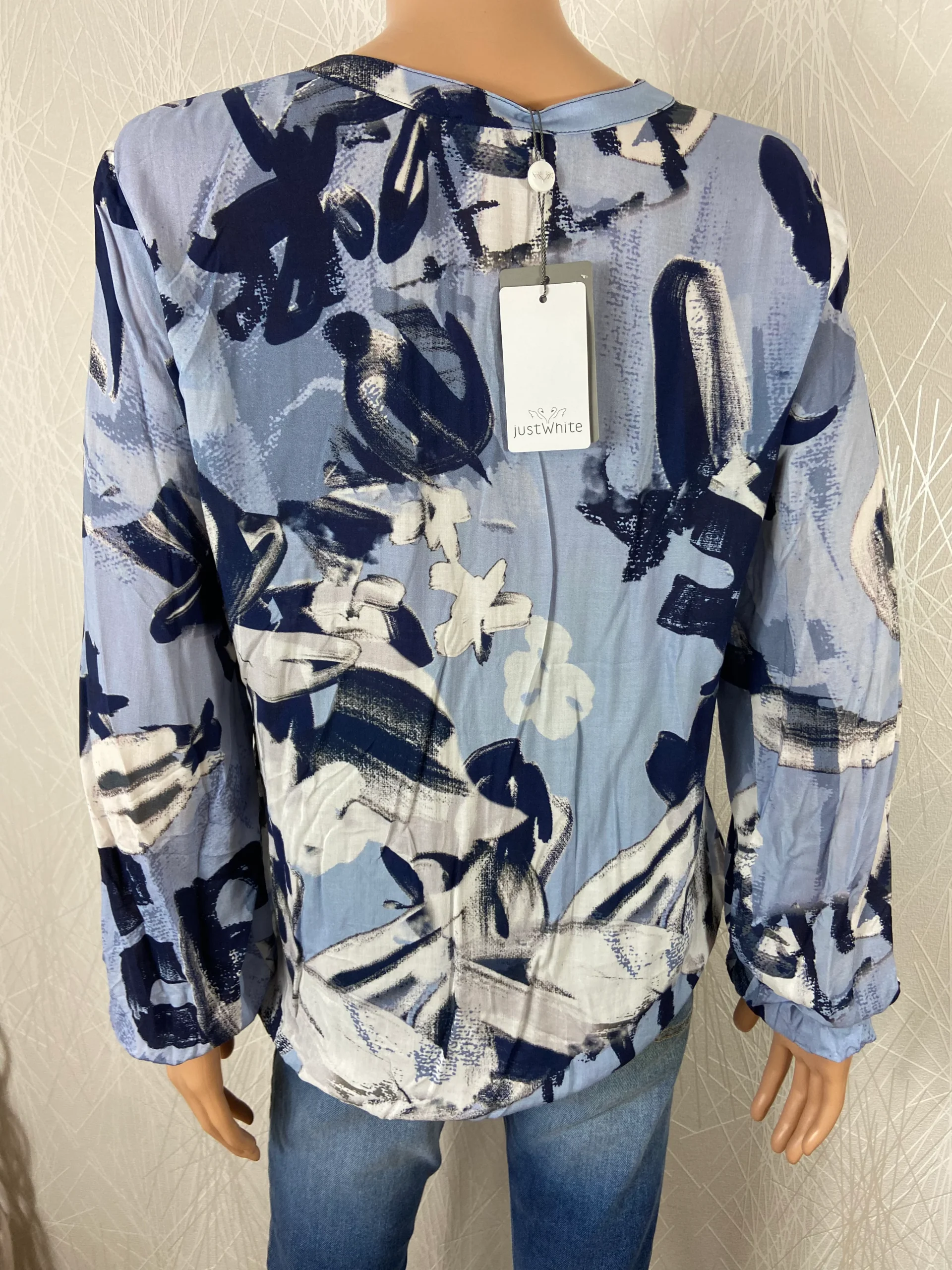 Cette blouse est à manches longues volumineuses avec des poignets élastiqués, le bas de la blouse est également élastiqué et a un cordon en décoration.