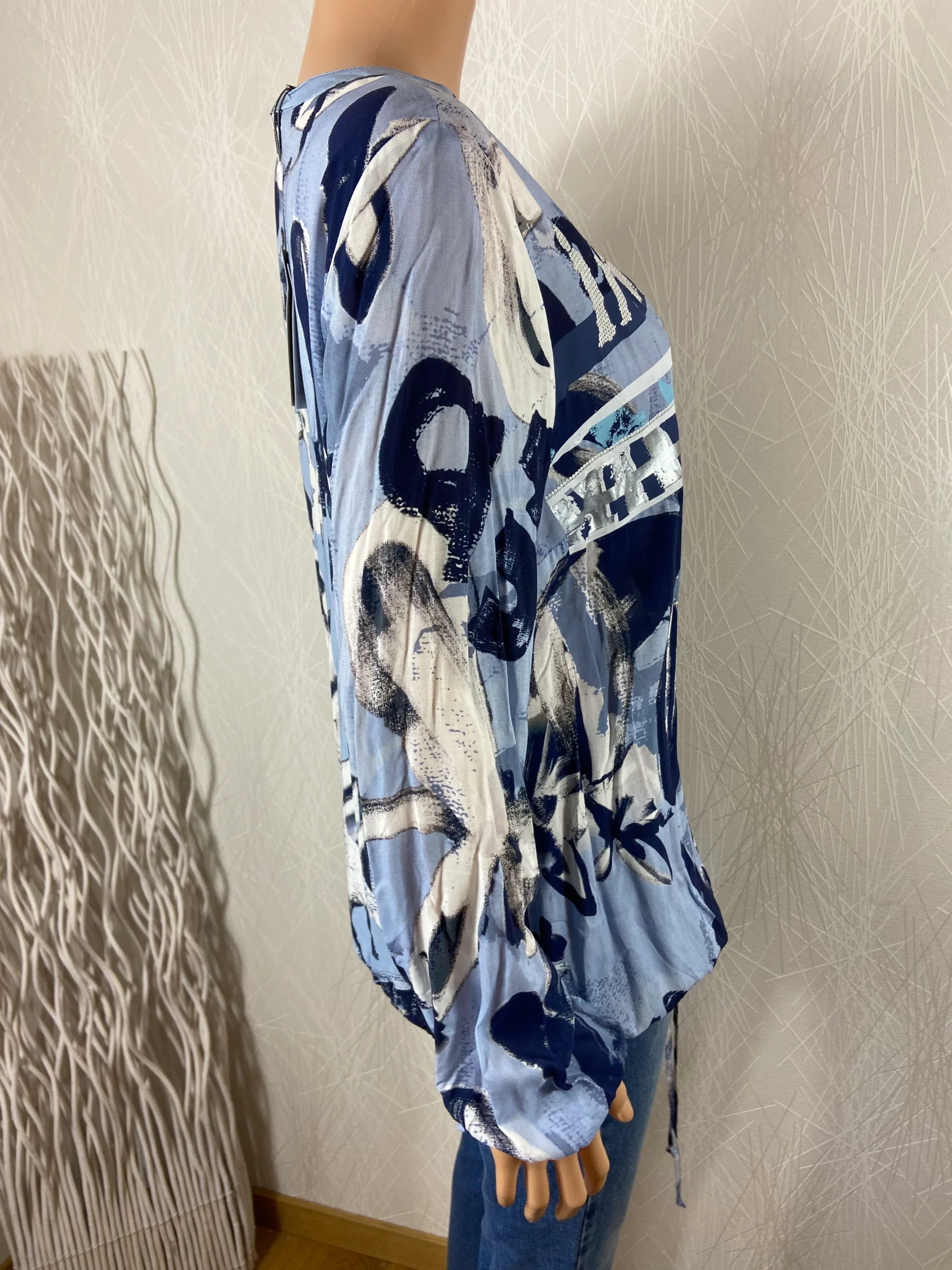 Blouse pour femme, coupe décontractée chic, un joli imprimé sur toute la surface avec des touches argentées, col mandarin encolure en V ouvert. Cette blouse est à manches longues volumineuses avec des poignets élastiqués, le bas de la blouse est également élastiqué et a un cordon en décoration. Matière : 100% viscose Couleur : Bleu […]
