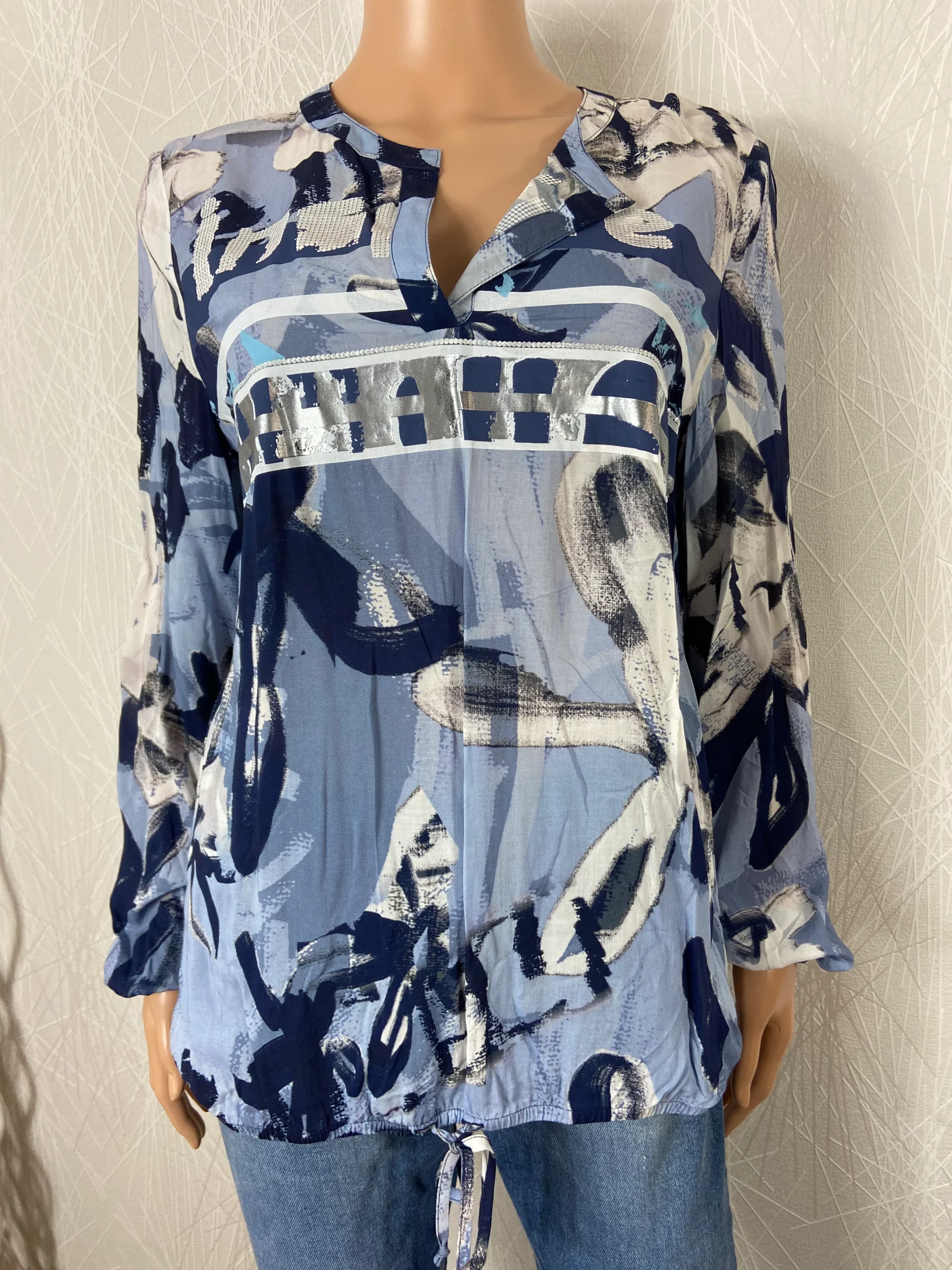 Blouse pour femme, coupe décontractée chic, un joli imprimé sur toute la surface avec des touches argentées, col mandarin encolure en V ouvert.