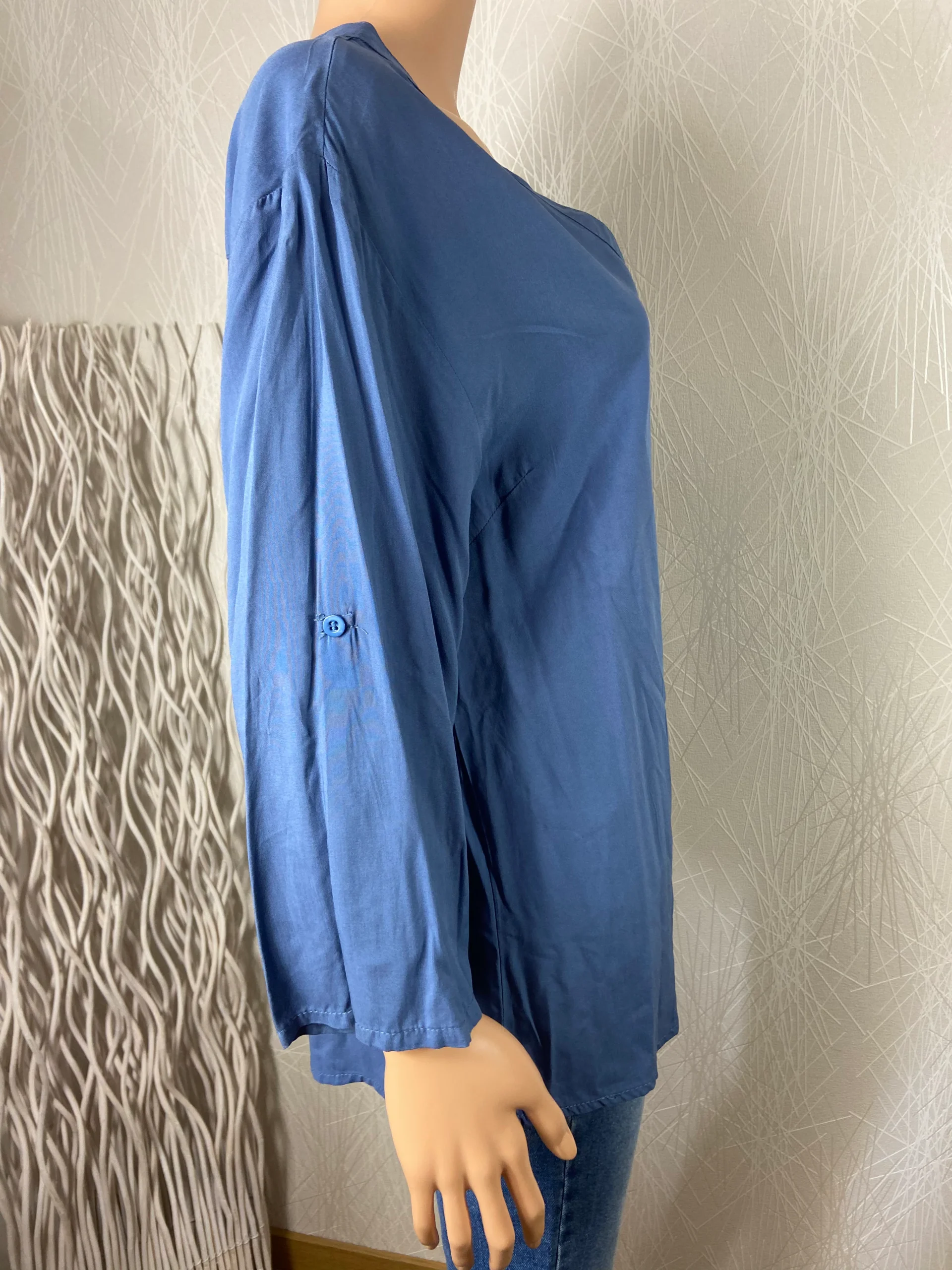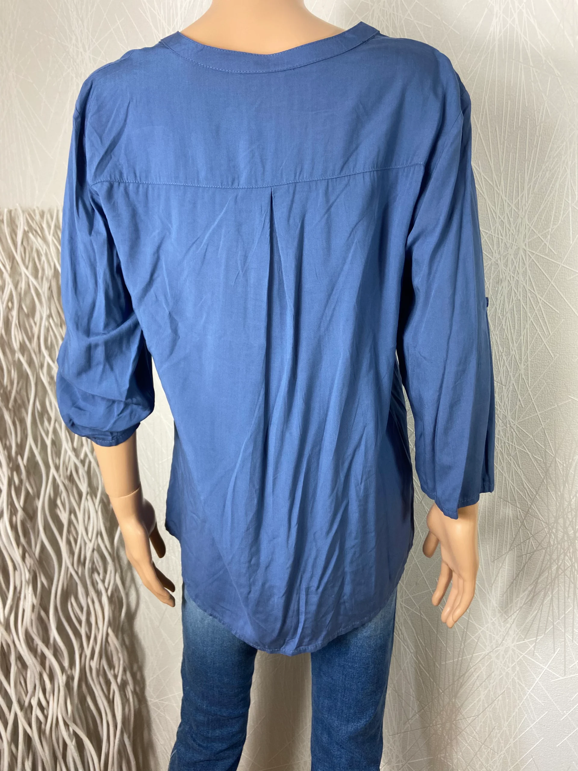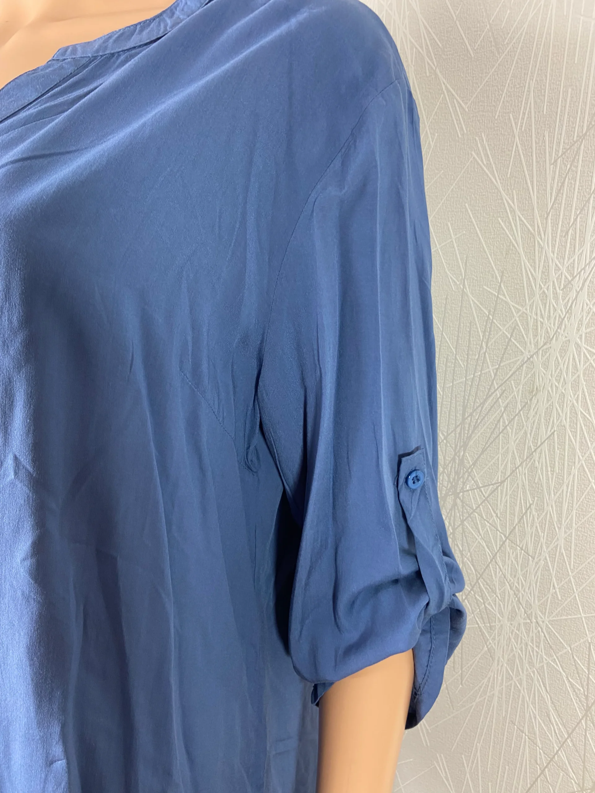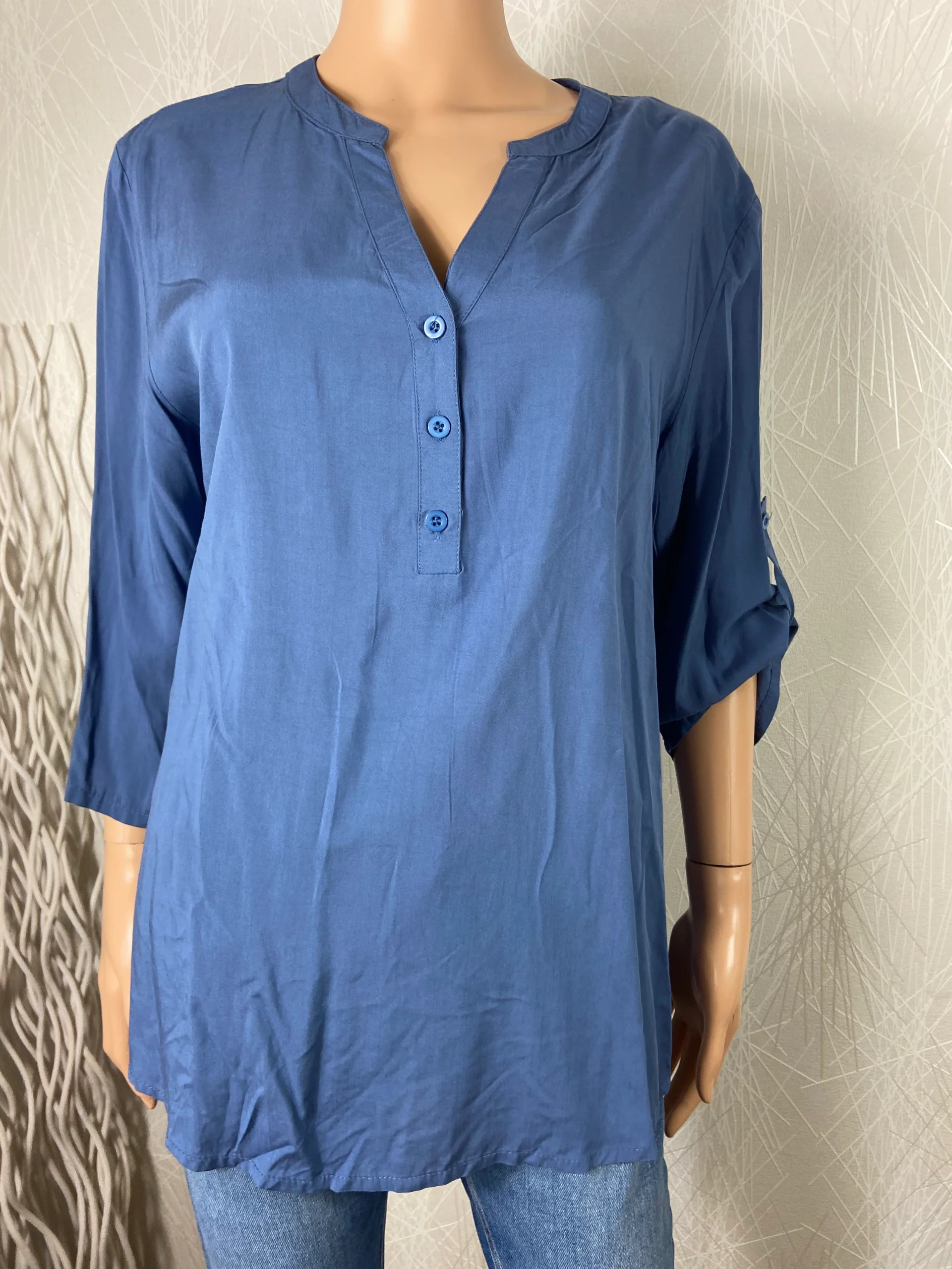 Blouse pour femme fluide, tissu très agréable, des manches 3/4 qui sont munies de languettes retroussables, encolure ronde ouverte en V sur 3 boutons.