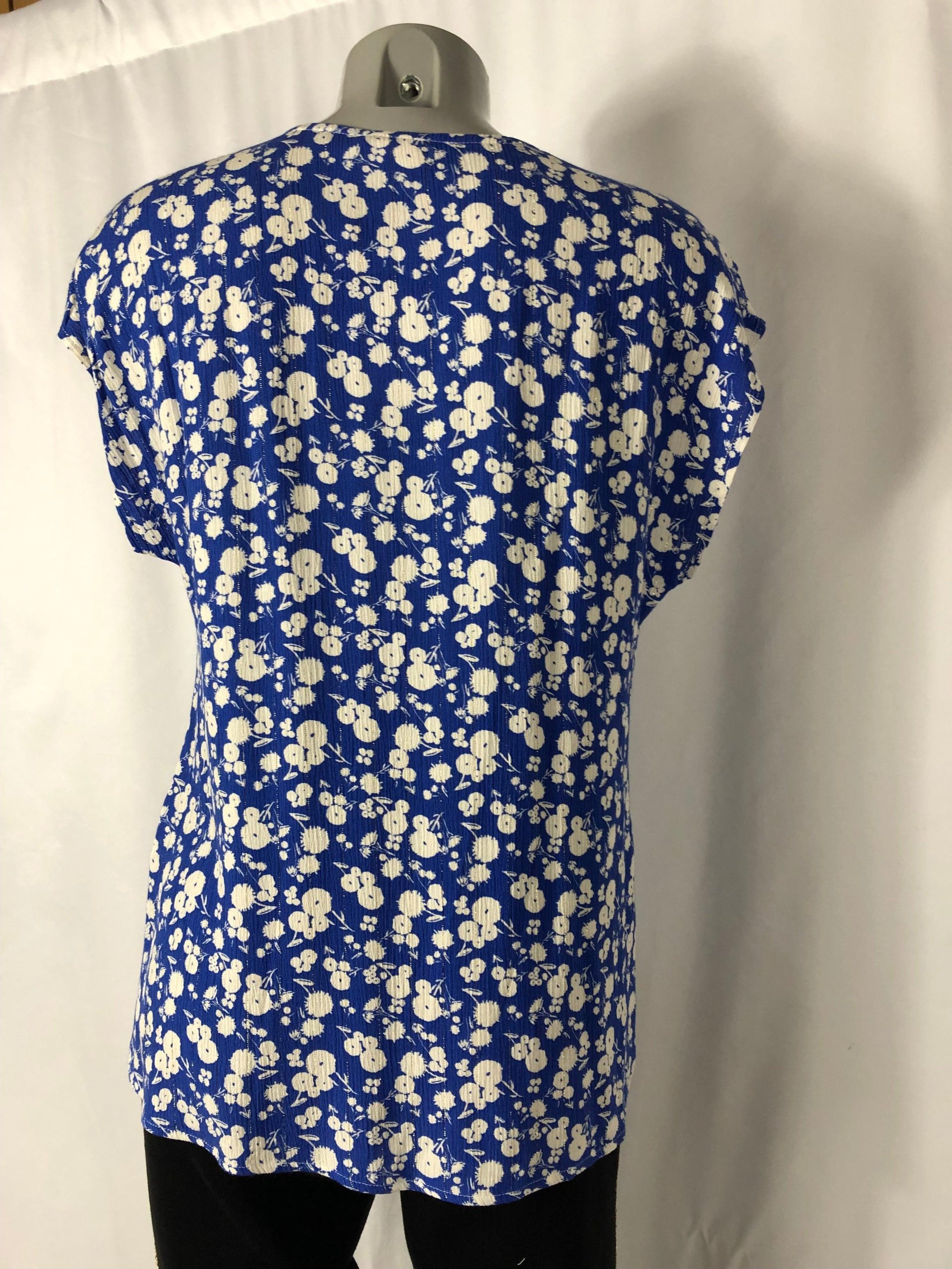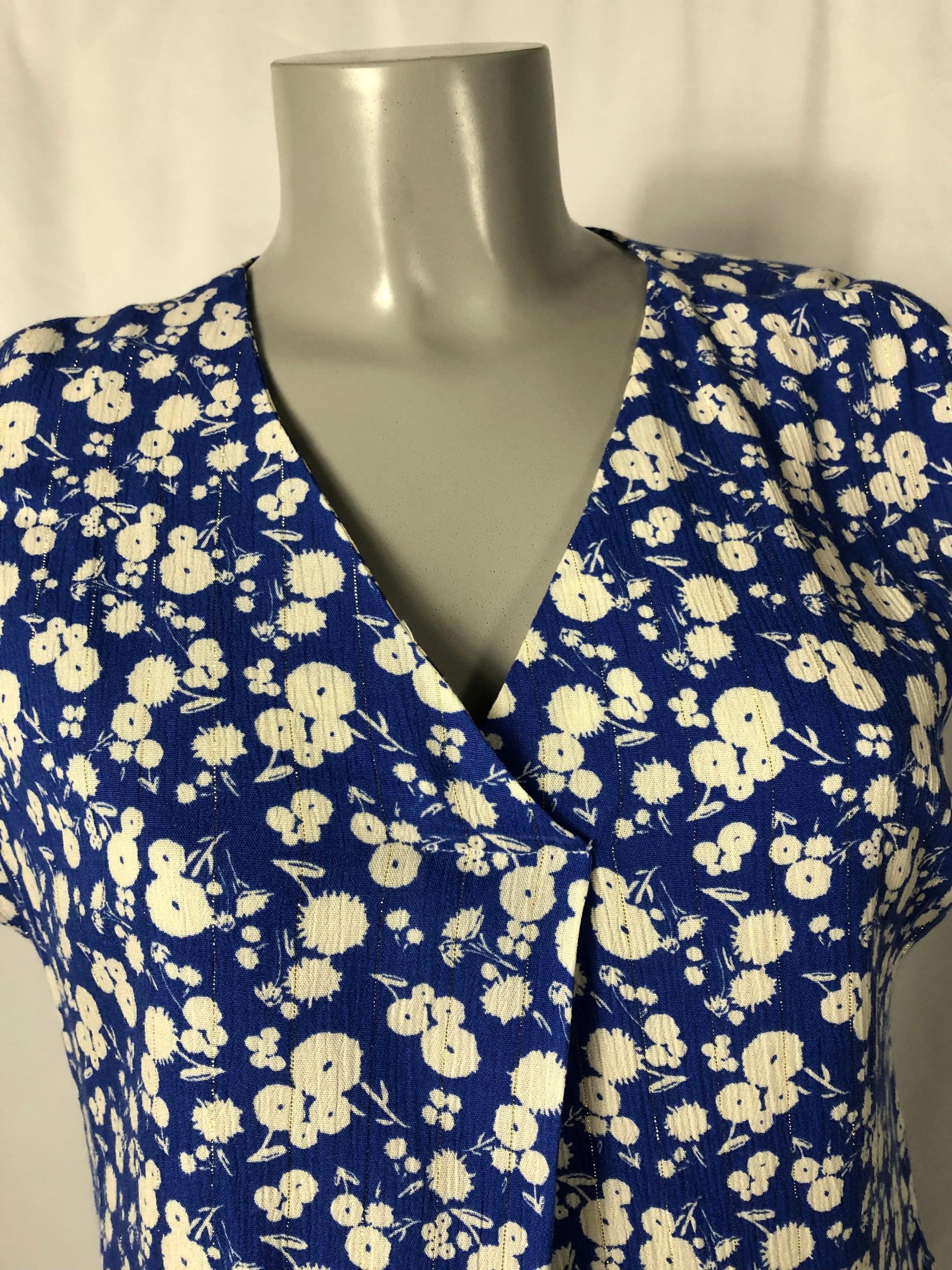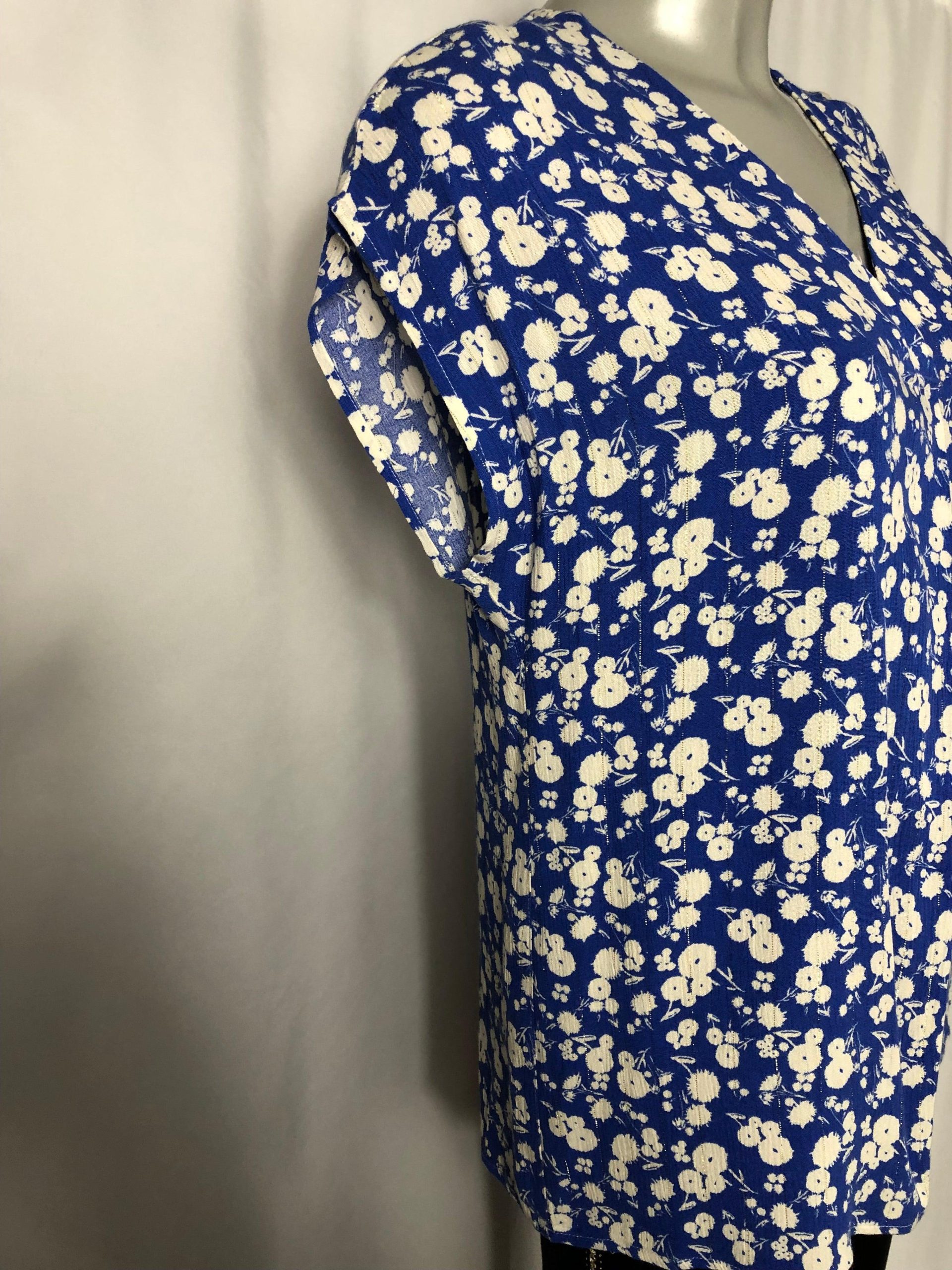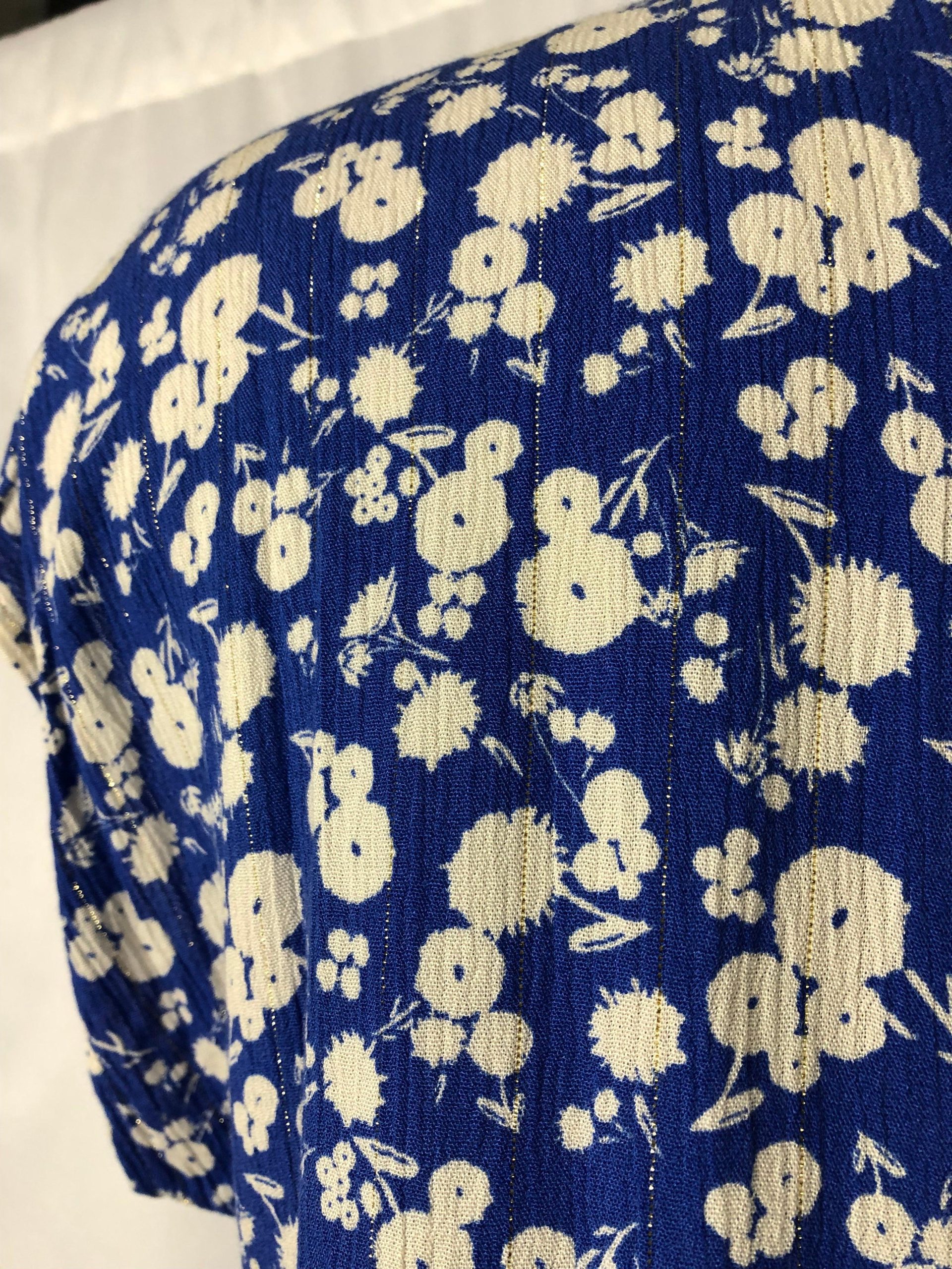 Jolie blouse pour femme imprimée de fleurs monochromes et tissées de fines rayures verticales argentées. Coupe ample, mancherons kimono, pli couché devant, base droite et encolure en V. Belle fabrication française Couleur : bleu Composition : 99 % Viscose – 1 % Fibre Métallique Valeur en boutique : 48 € Taille XS / 34 – […]