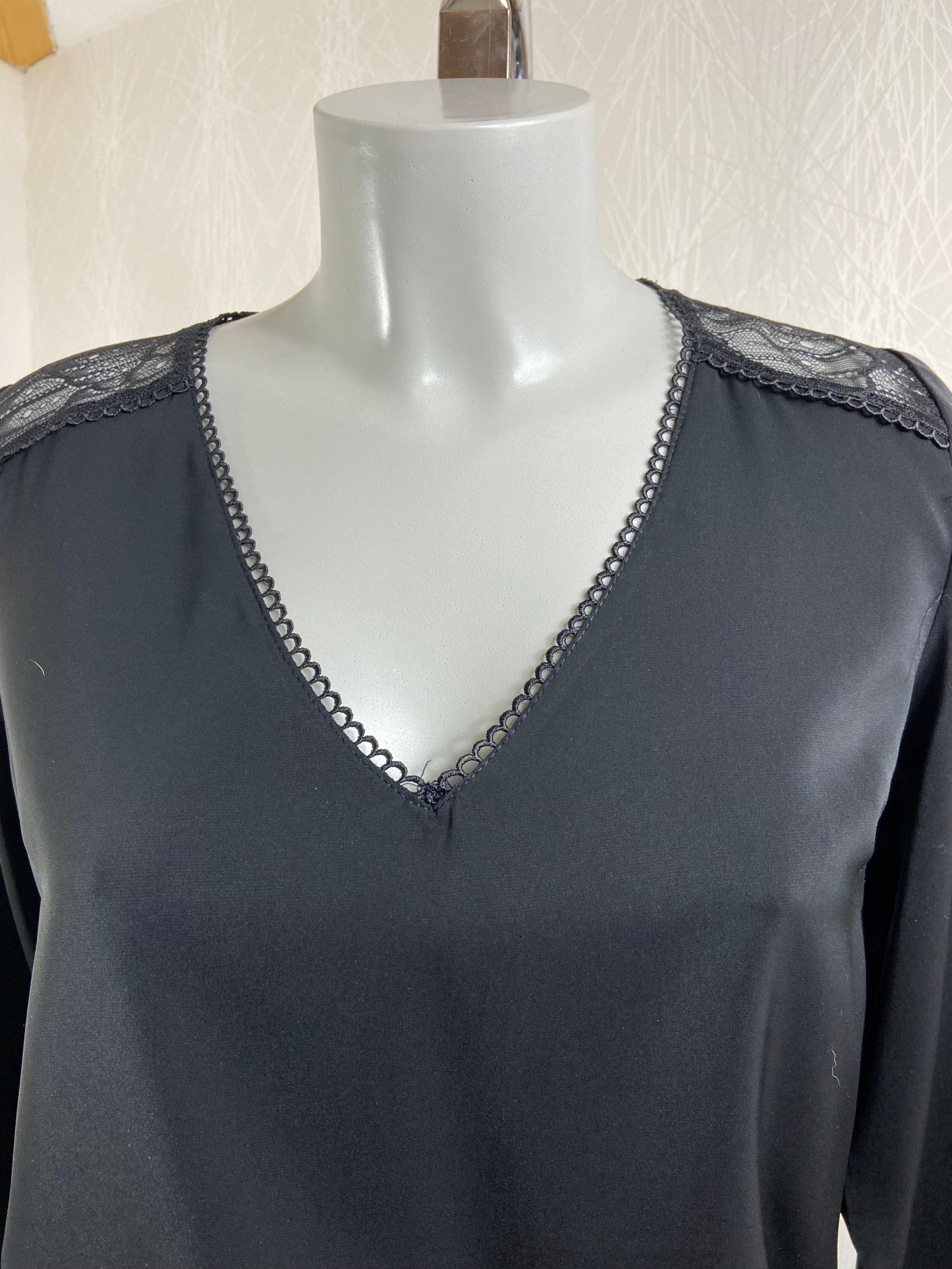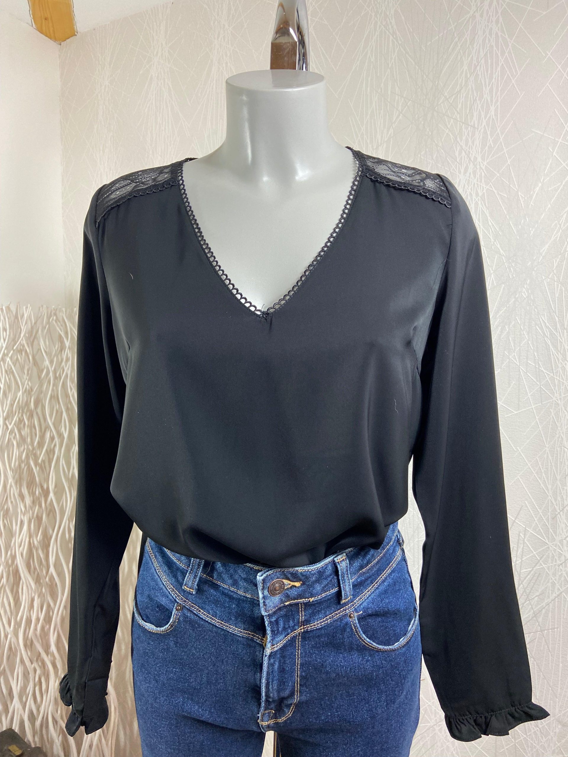 Jolie blouse stylée avec un décolleté en V, des empiècements dans le dos et sur les épaules en dentelle dévoilant la peau par transparence et les poignets avec volants.