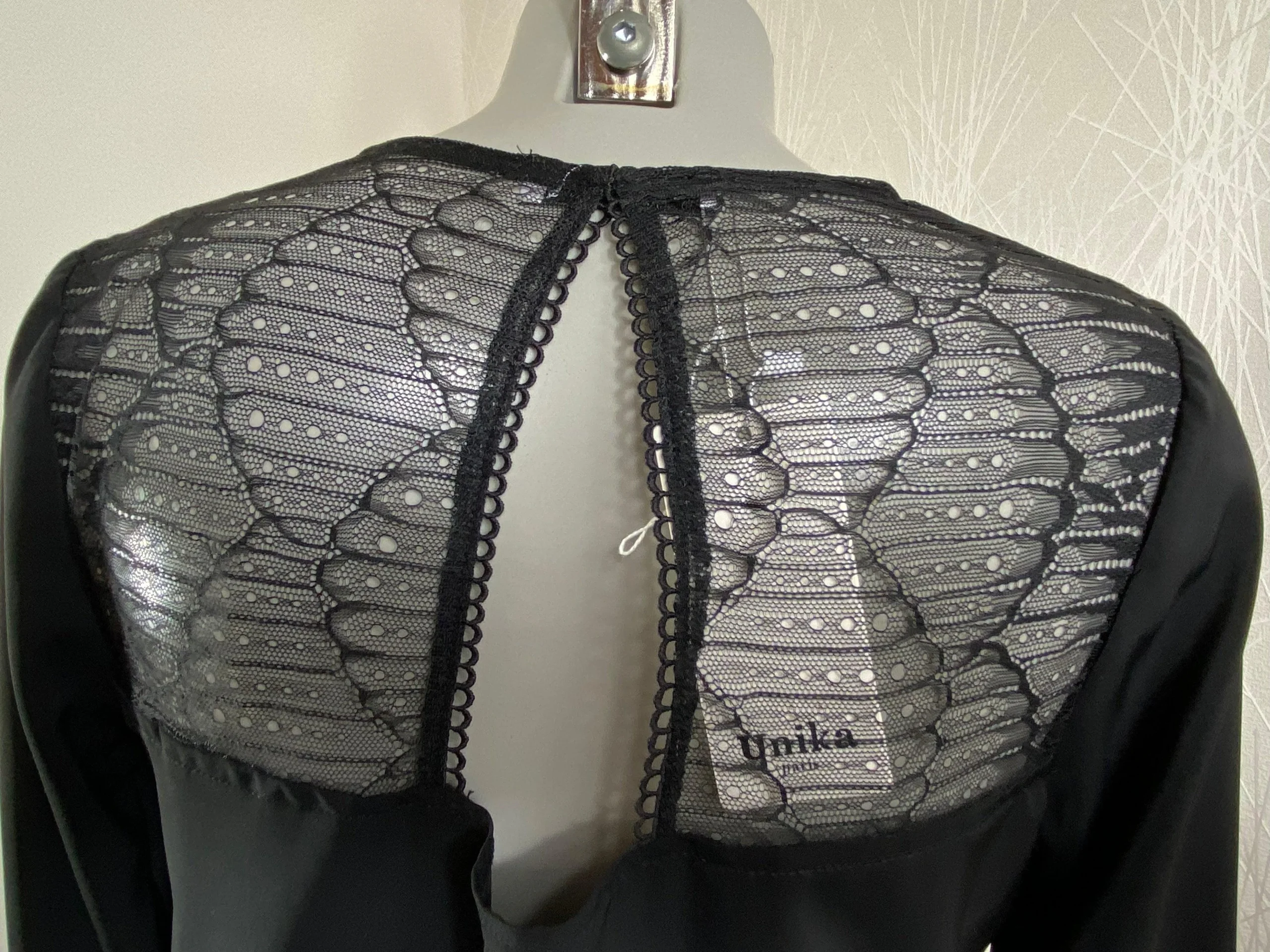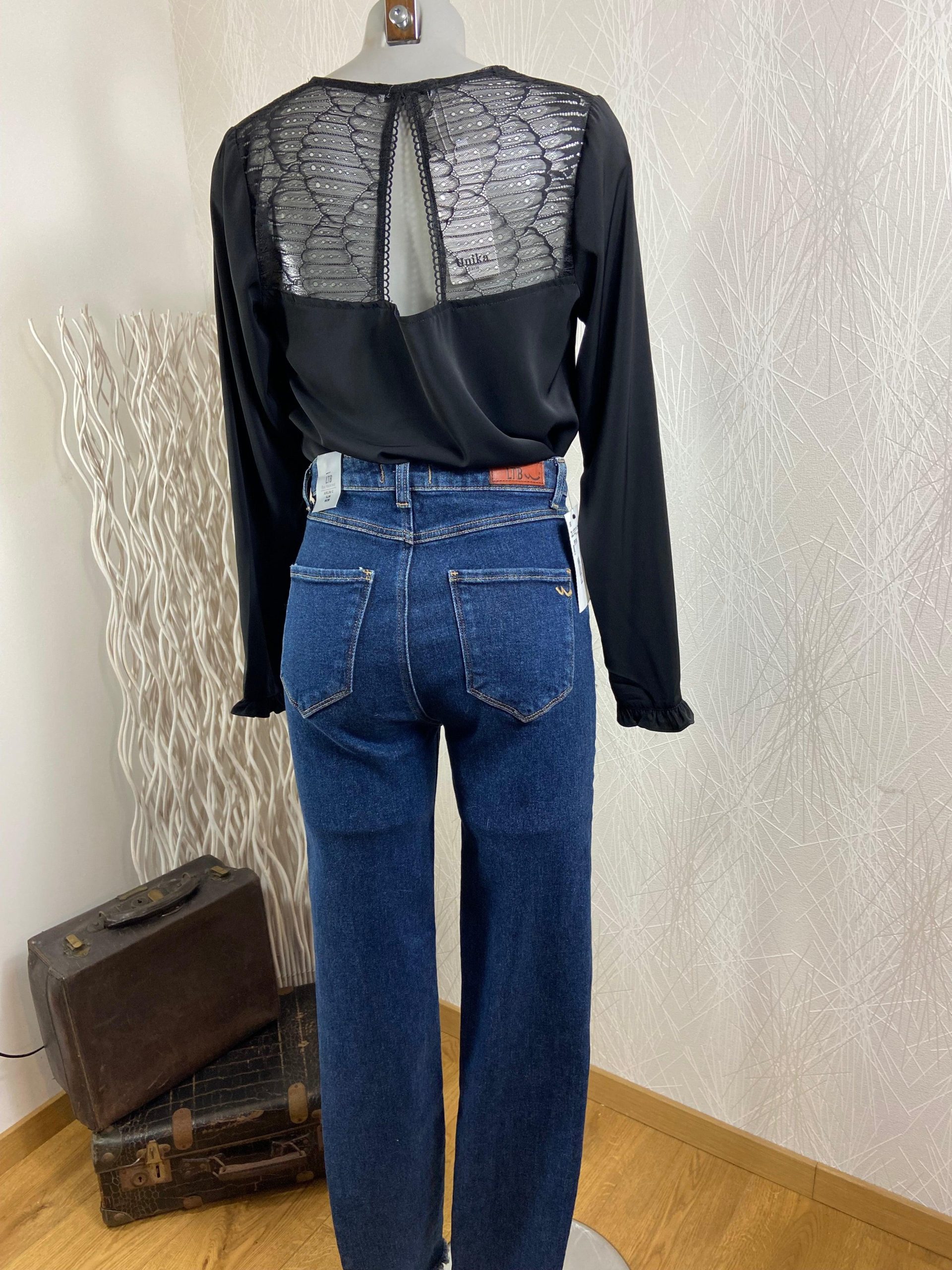 Blouse noire fluide pour femme de la marque Unika Paris. Jolie blouse stylée avec un décolleté en V, des empiècements dans le dos et sur les épaules en dentelle dévoilant la peau par transparence et les poignets avec volants. Cette blouse originale avec dentelle mettra votre dos en valeur. Couleur : Noir Matière : 100 […]