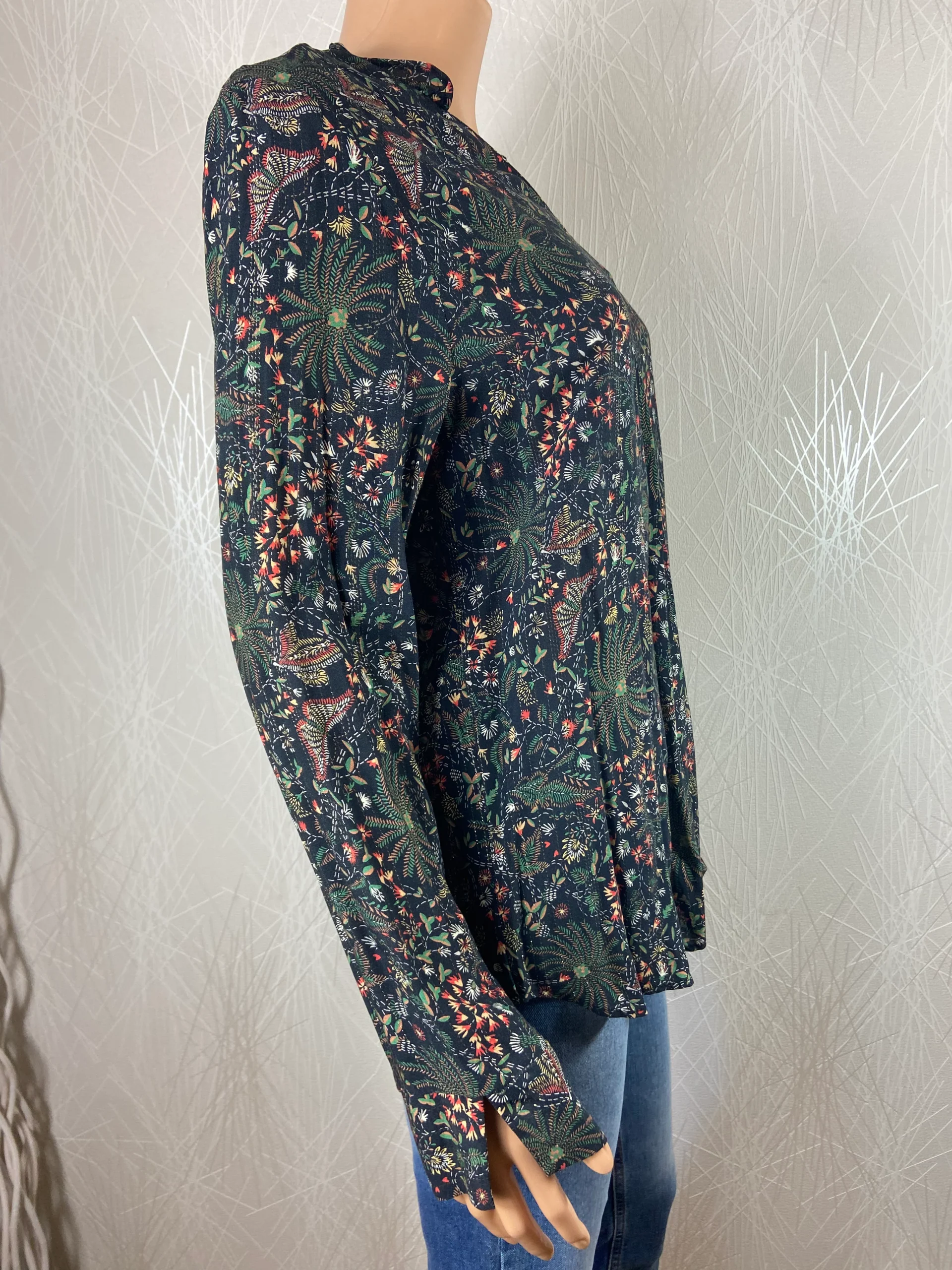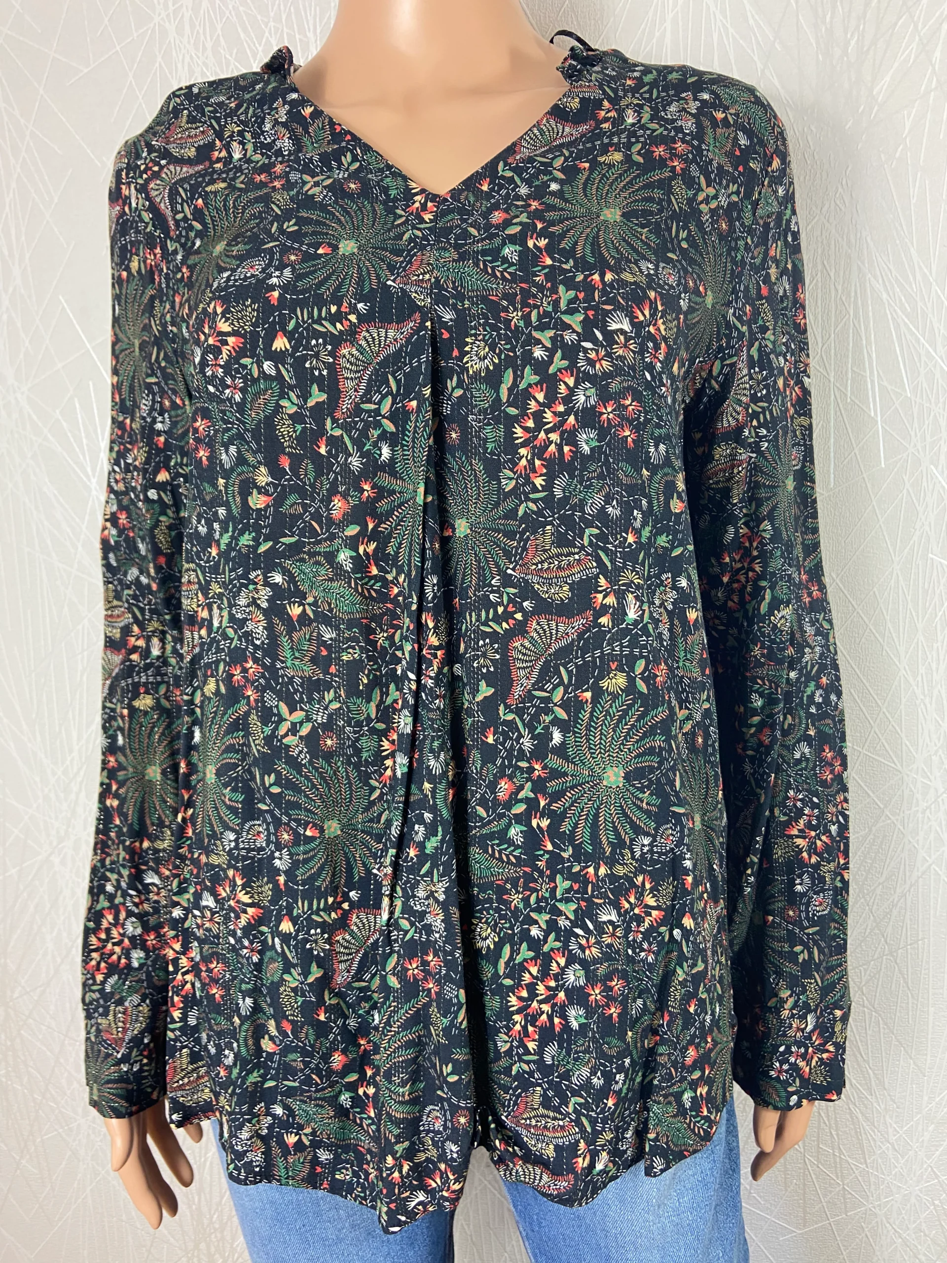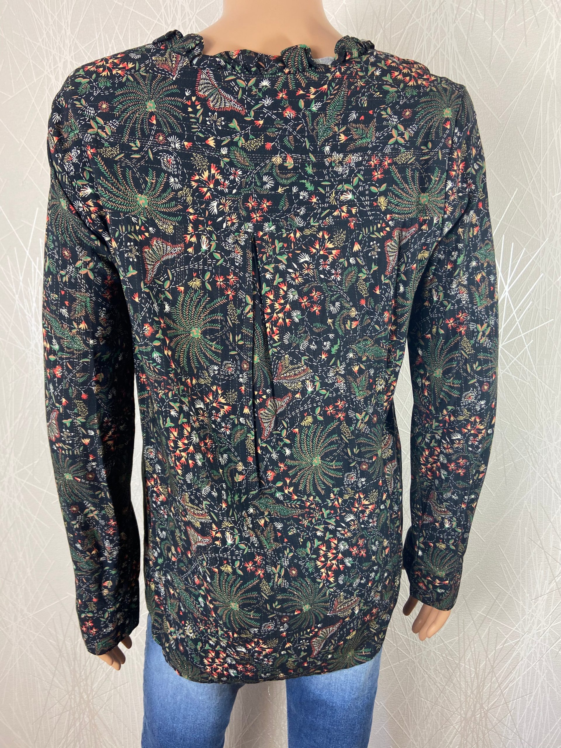 Belle blouse à coupe droite, manches longues, tissu imprimé floral tissée de fines rayures argentées. Encolure bordée d’un ruché découpe en V sur la poitrine, poignets fendus, base arrondie devant ainsi qu’au dos et pli creux au dos. Tons vert kaki avec des motifs vert émeraude, rouge brique et taupe. Une jolie blouse très stylée […]