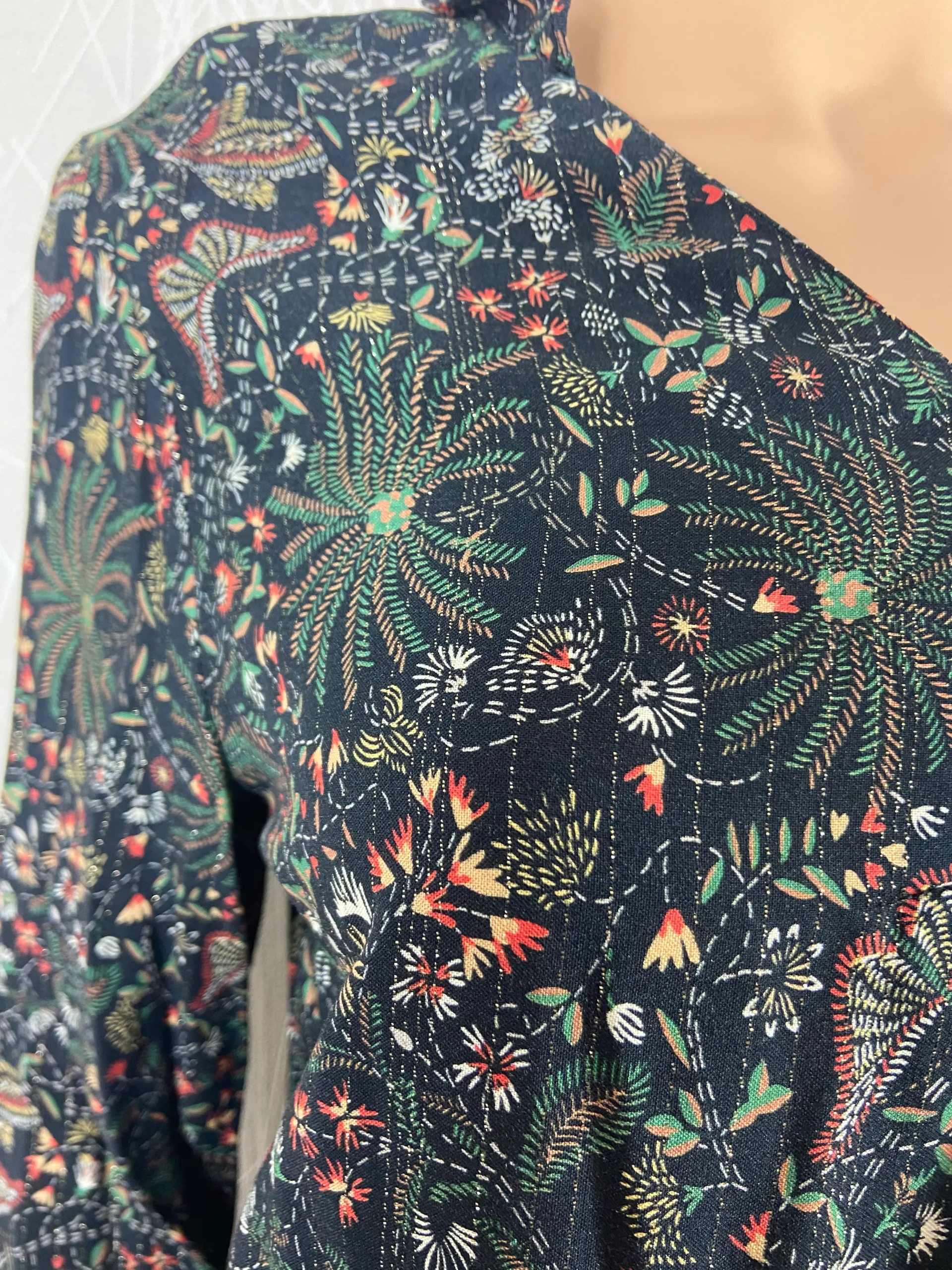 Belle blouse à coupe droite, manches longues, tissu imprimé floral tissée de fines rayures argentées.