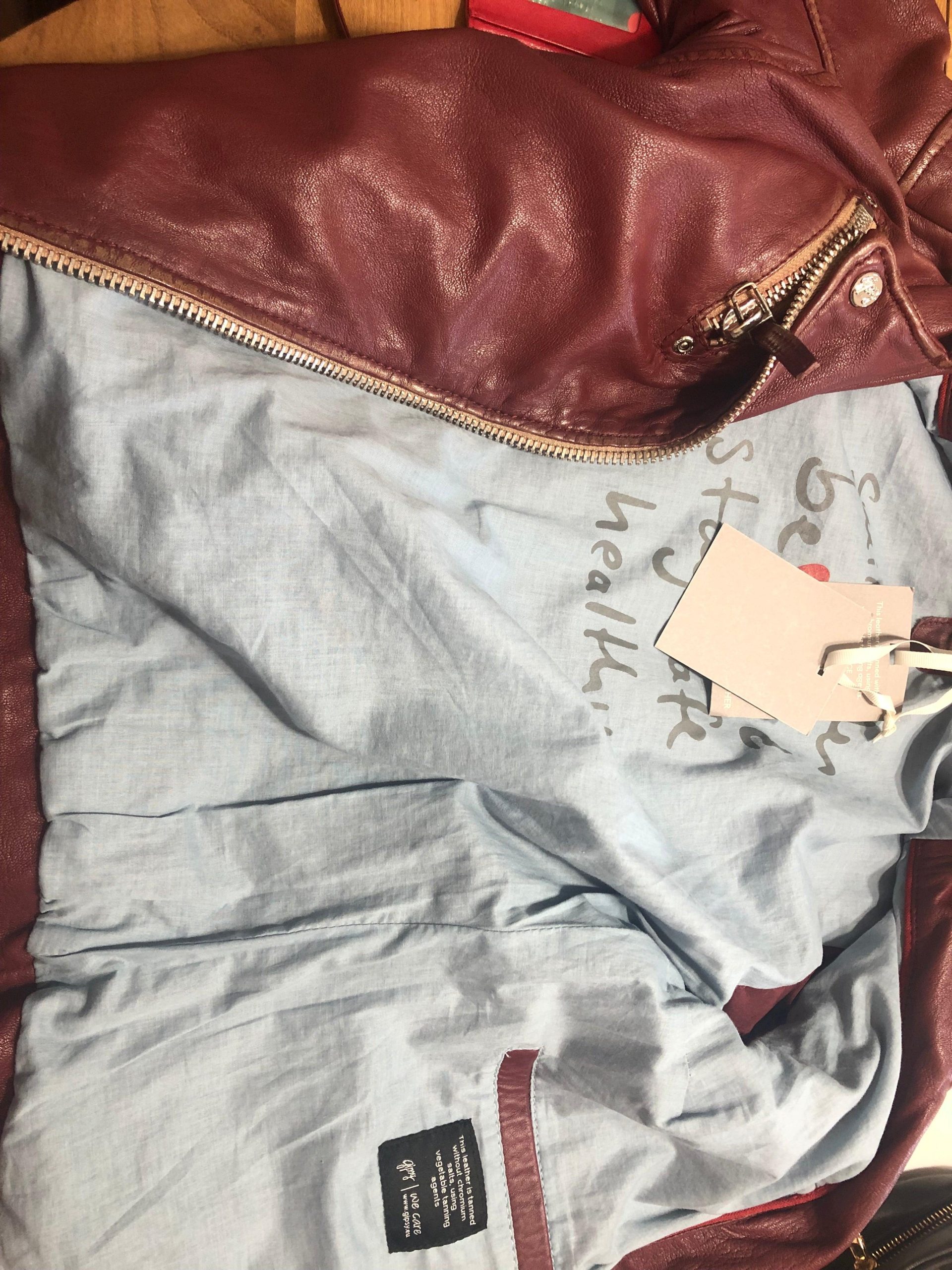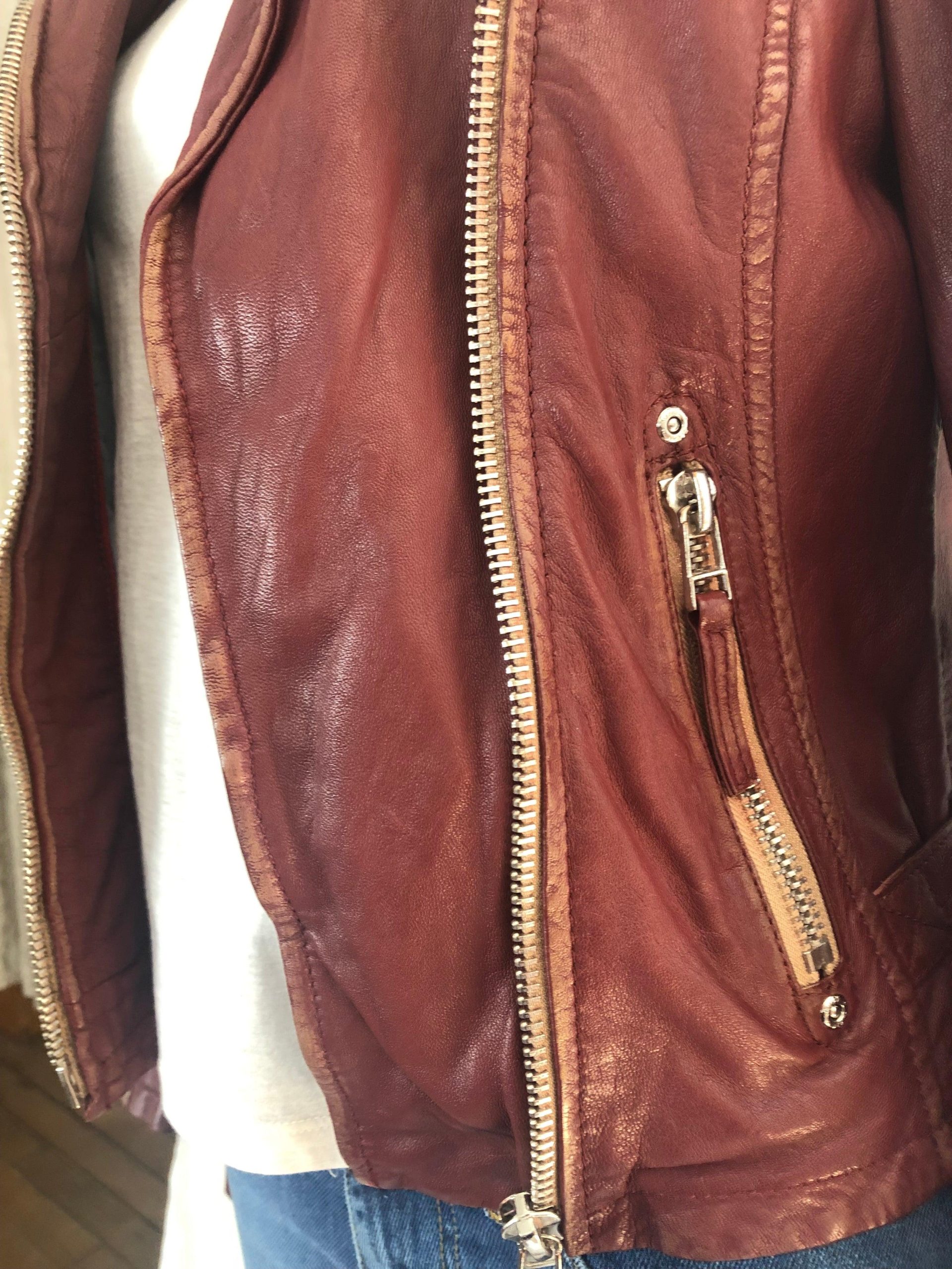 Beau blouson Perfecto en cuir rouge bordeaux pour femme, entièrement doublé avec coutures façon usées de la marque Gipsy Fermetures zippées asymétriques et poche intérieure. 2 autres poches avec fermetures zip et empiècement au niveau des coudes. Matière : 100% cuir ; Doublure 100 % coton ; Doublure des manches 100% polyester Dimensions : Largeur […]
