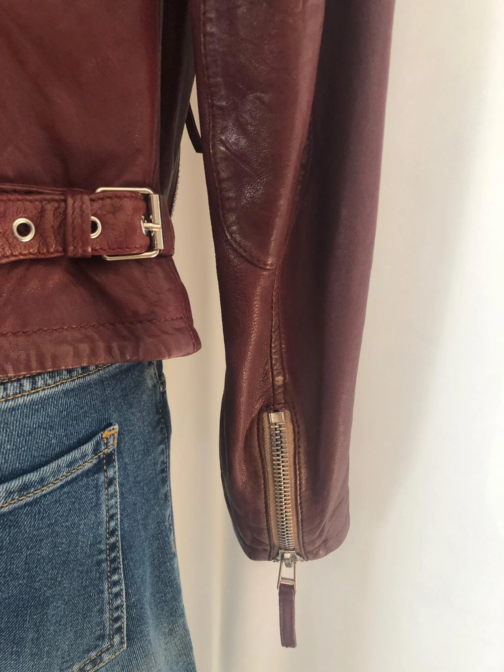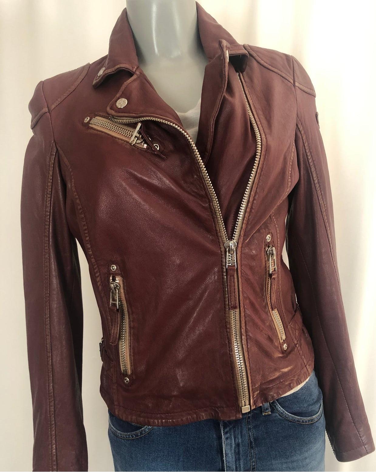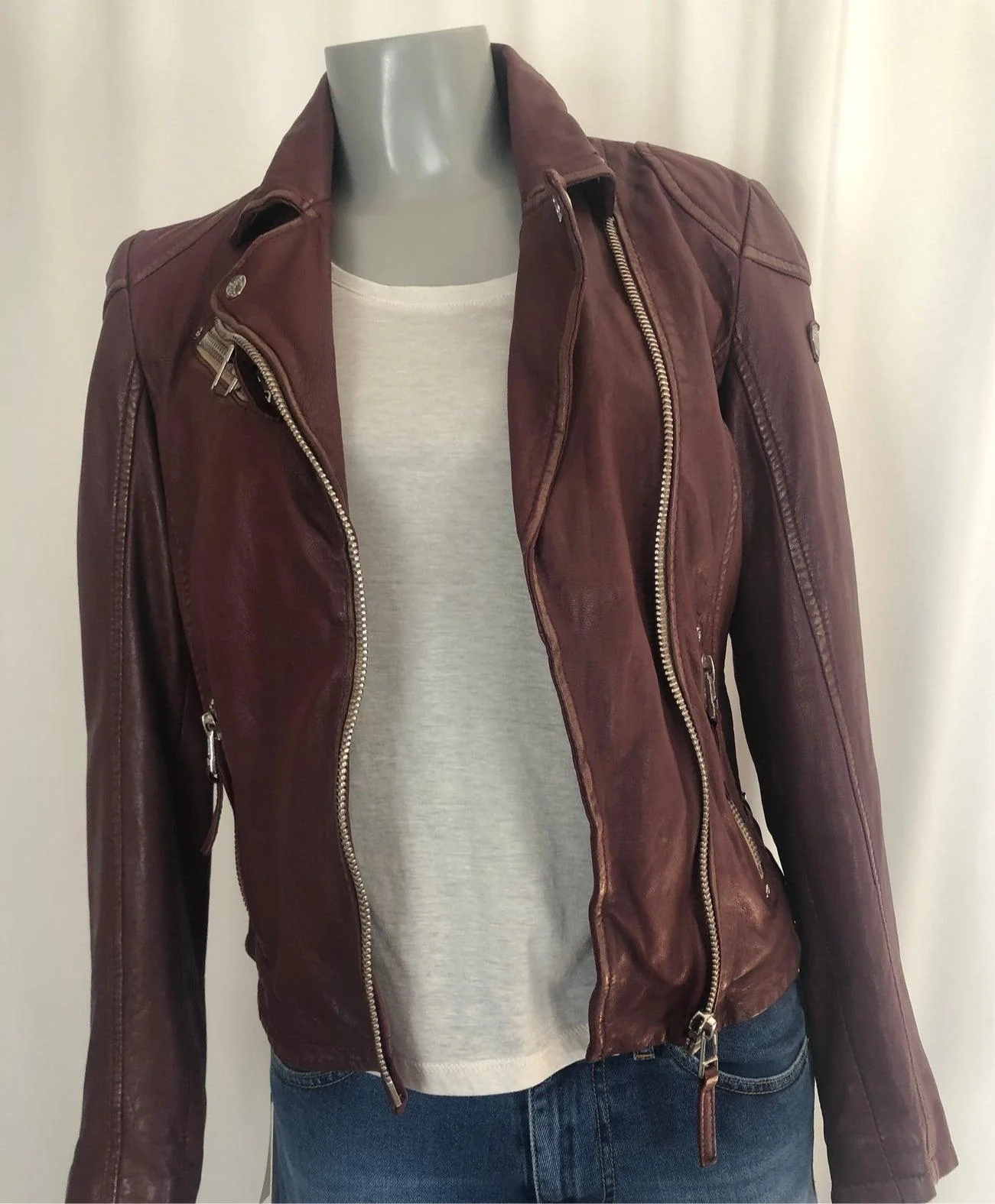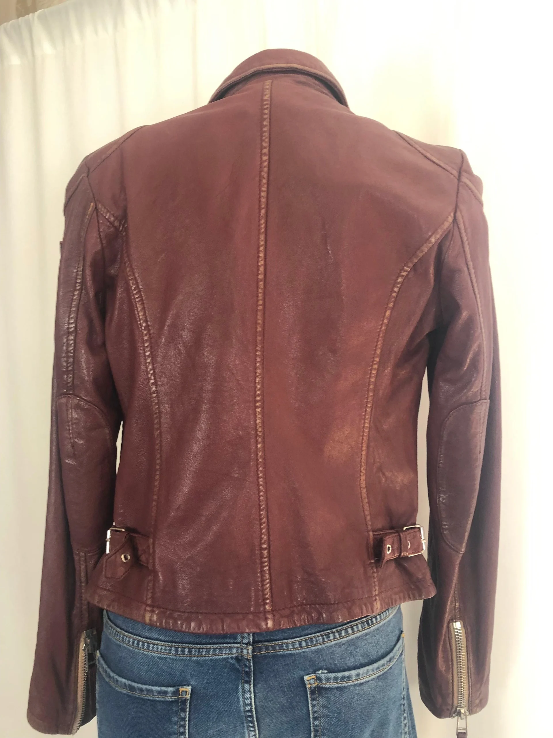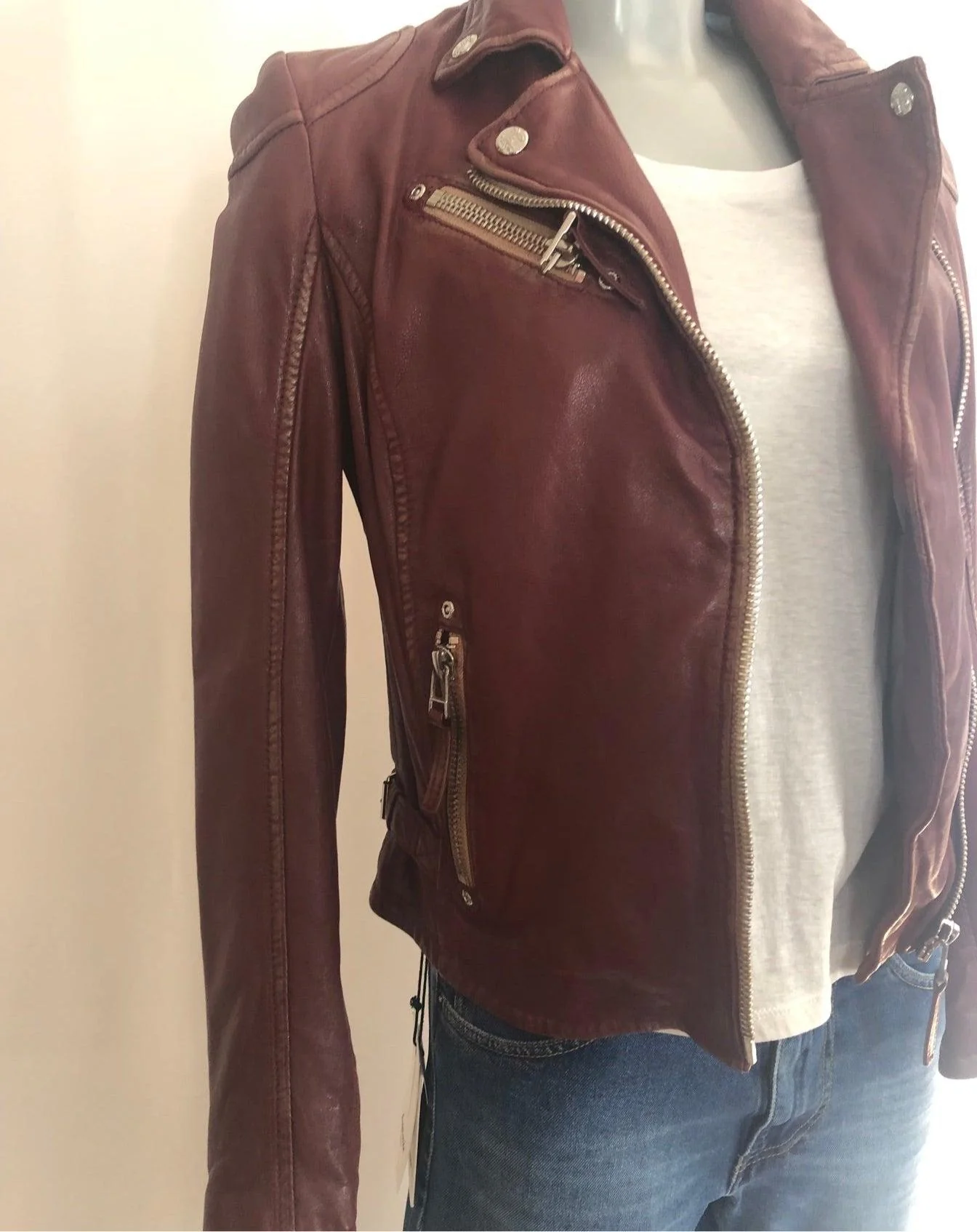 Beau blouson Perfecto en cuir rouge bordeaux pour femme, entièrement doublé avec coutures façon usées de la marque Gipsy