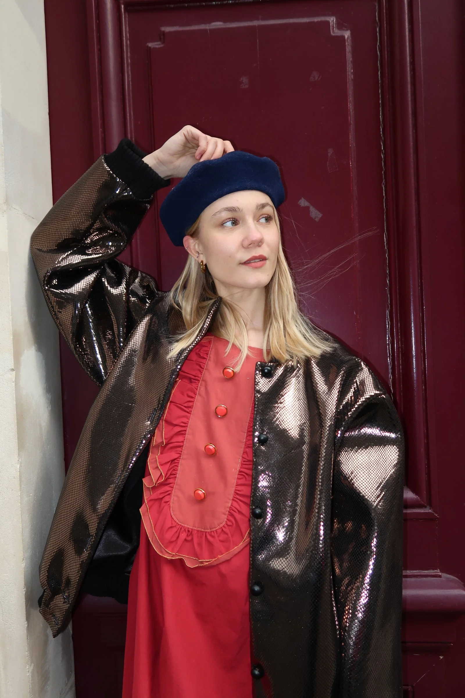 Impression lézard, coupe généreuse. Matière technique, allure audacieuse.
