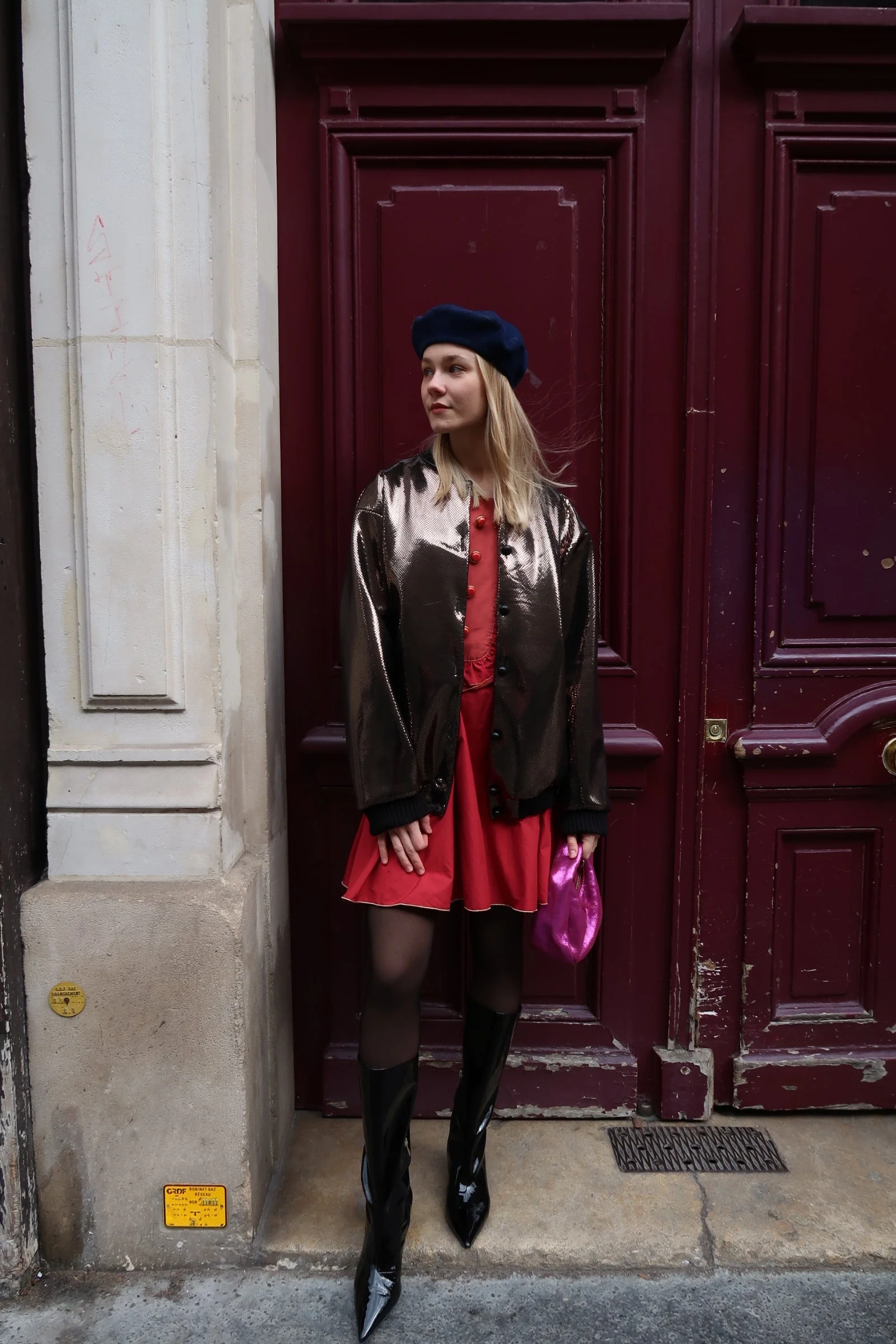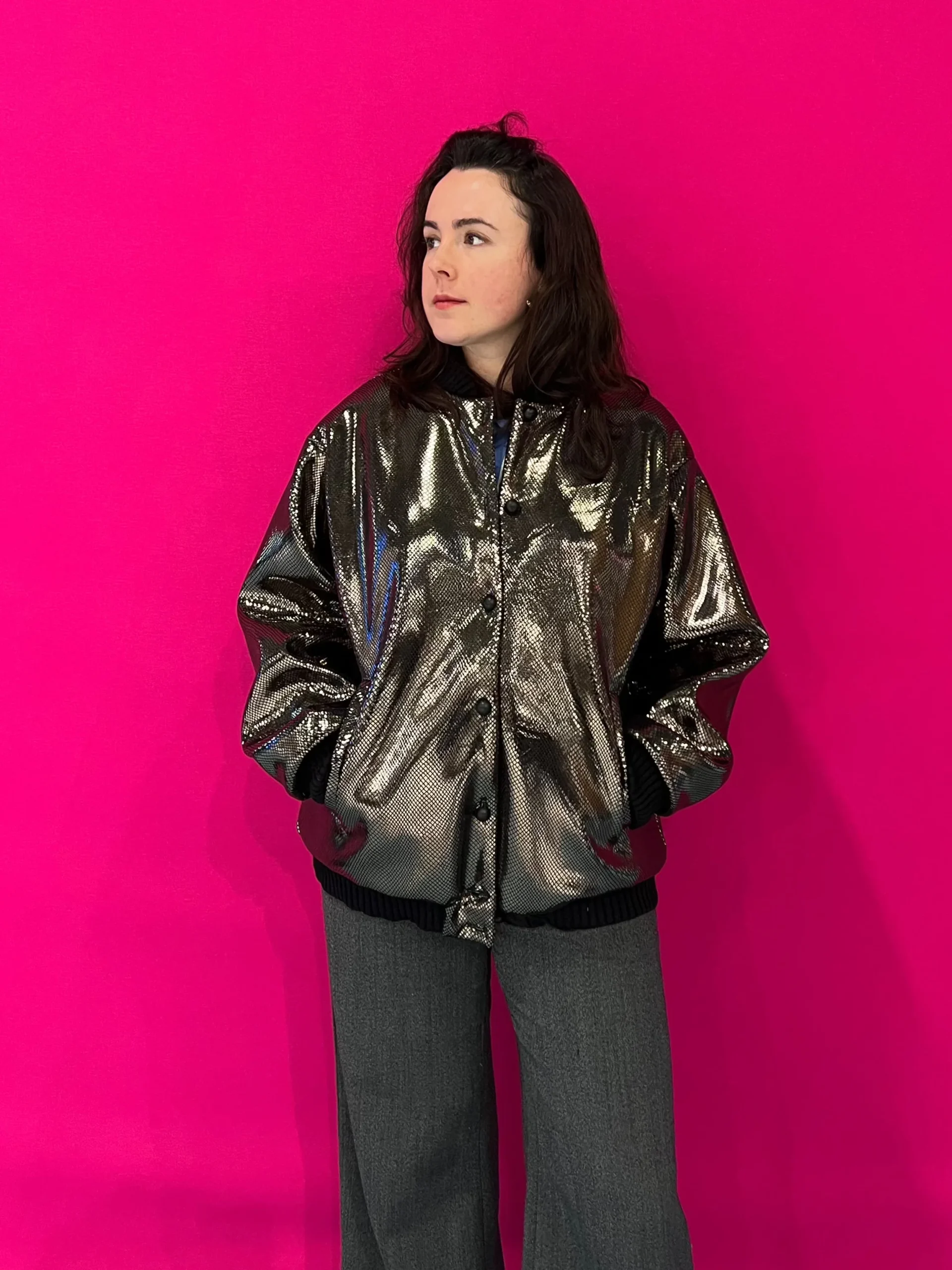 Bomber oversize en néoprène doré, confectionné en France sur commande.