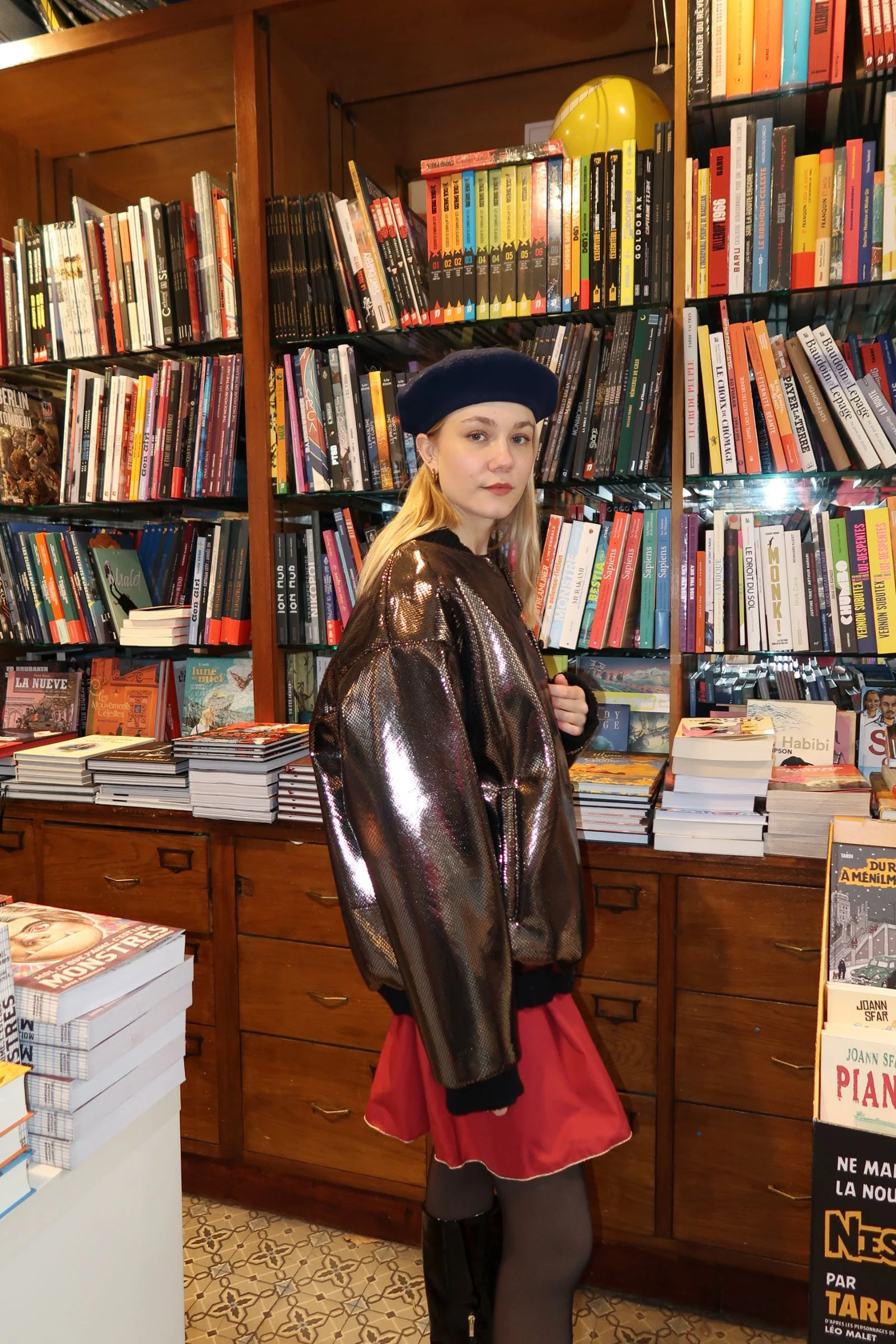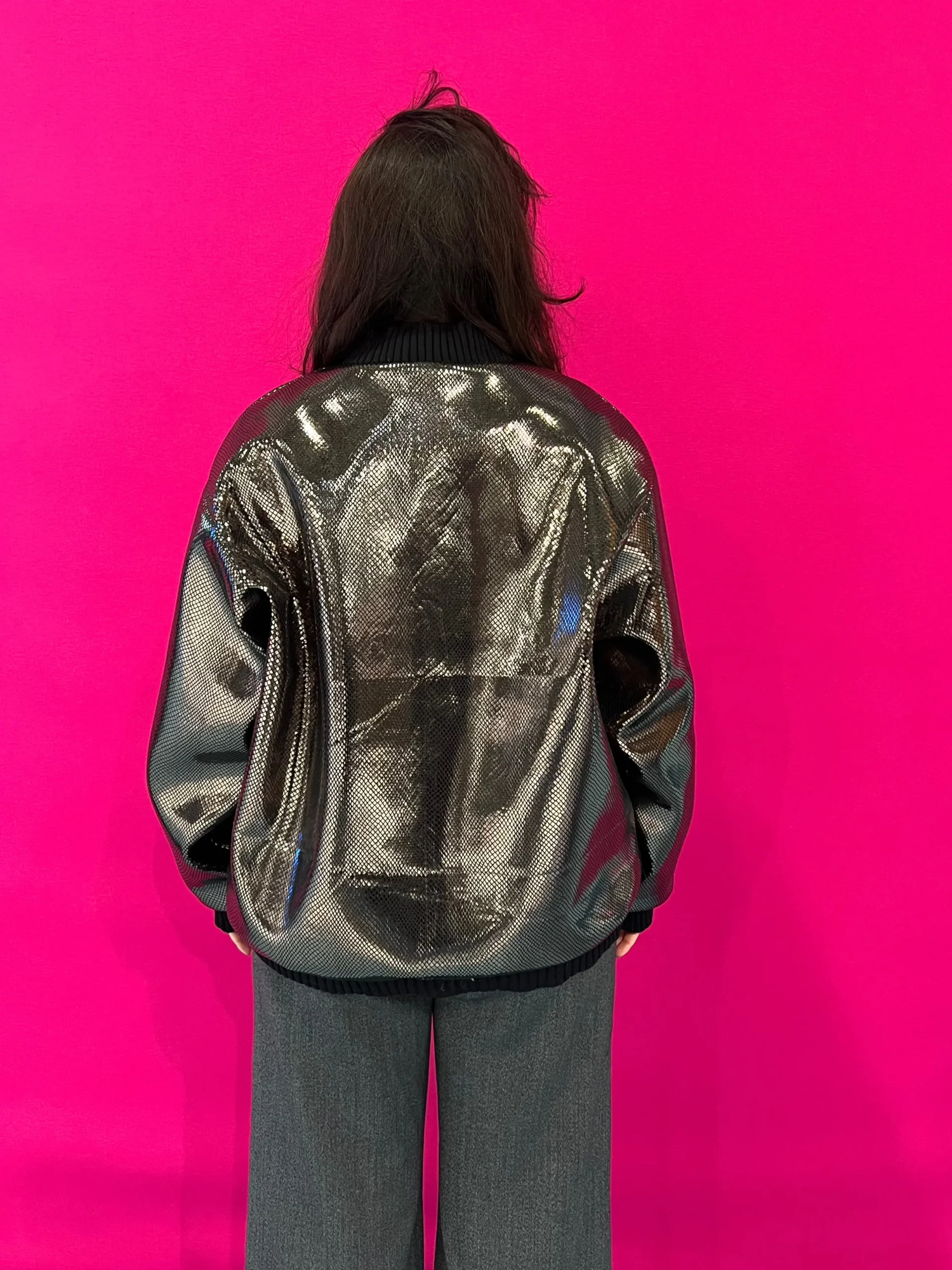 Bomber oversize en néoprène doré, confectionné en France sur commande. Impression lézard, coupe généreuse. Matière technique, allure audacieuse. Une pièce d’exception en édition limitée.