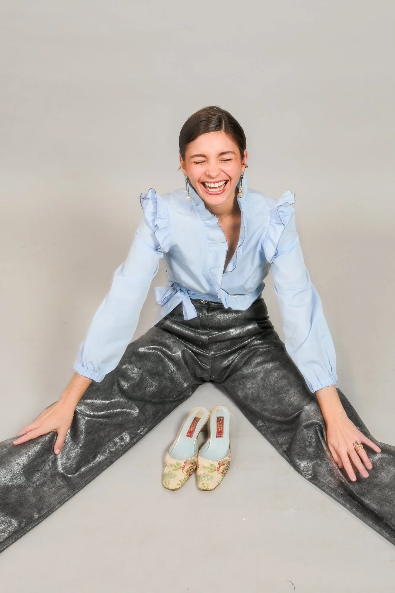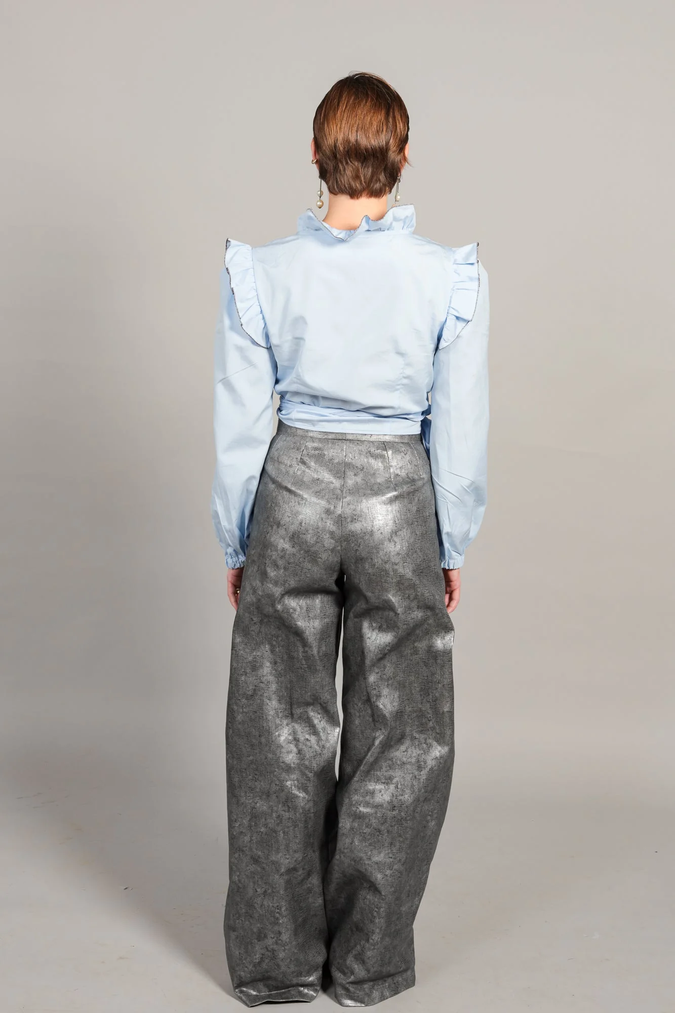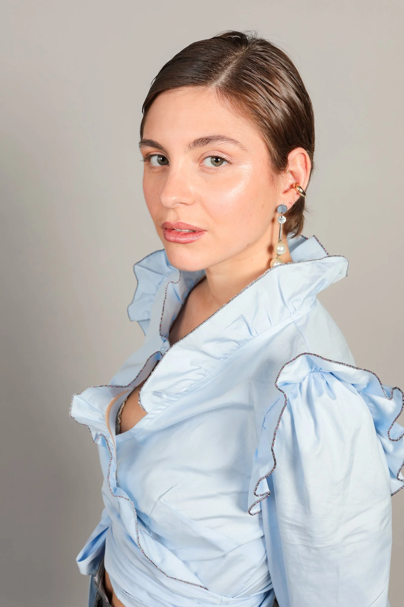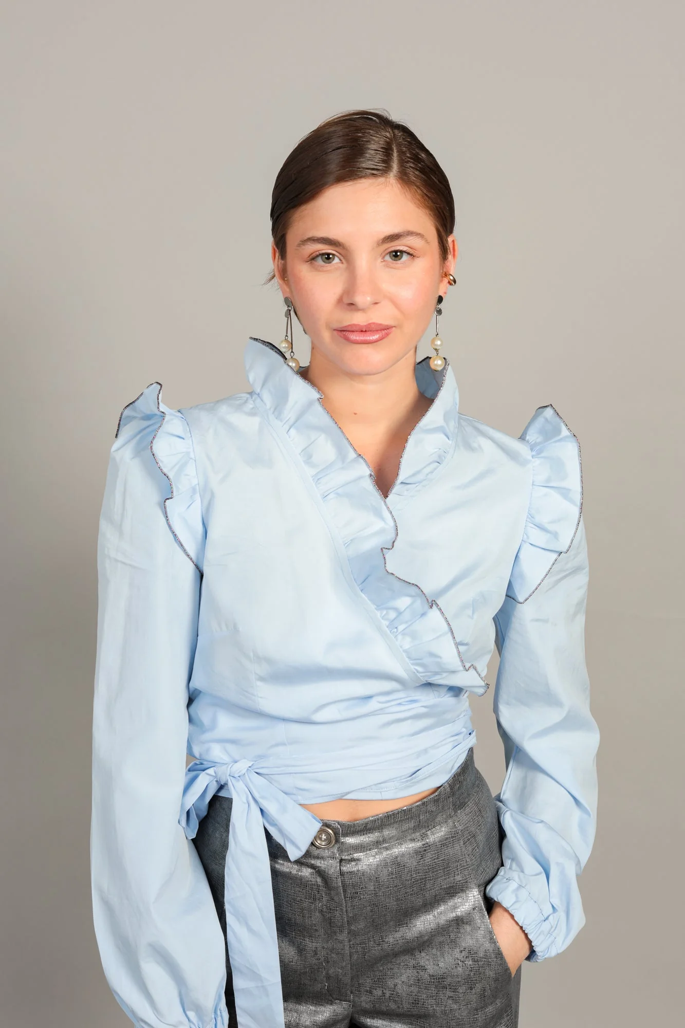 Cache-cœur en popeline de coton bleu ciel. Manches froncées, coupe raffinée. Style authentique et intemporel. Finitions fil lurex. Confectionné à la commande en France.