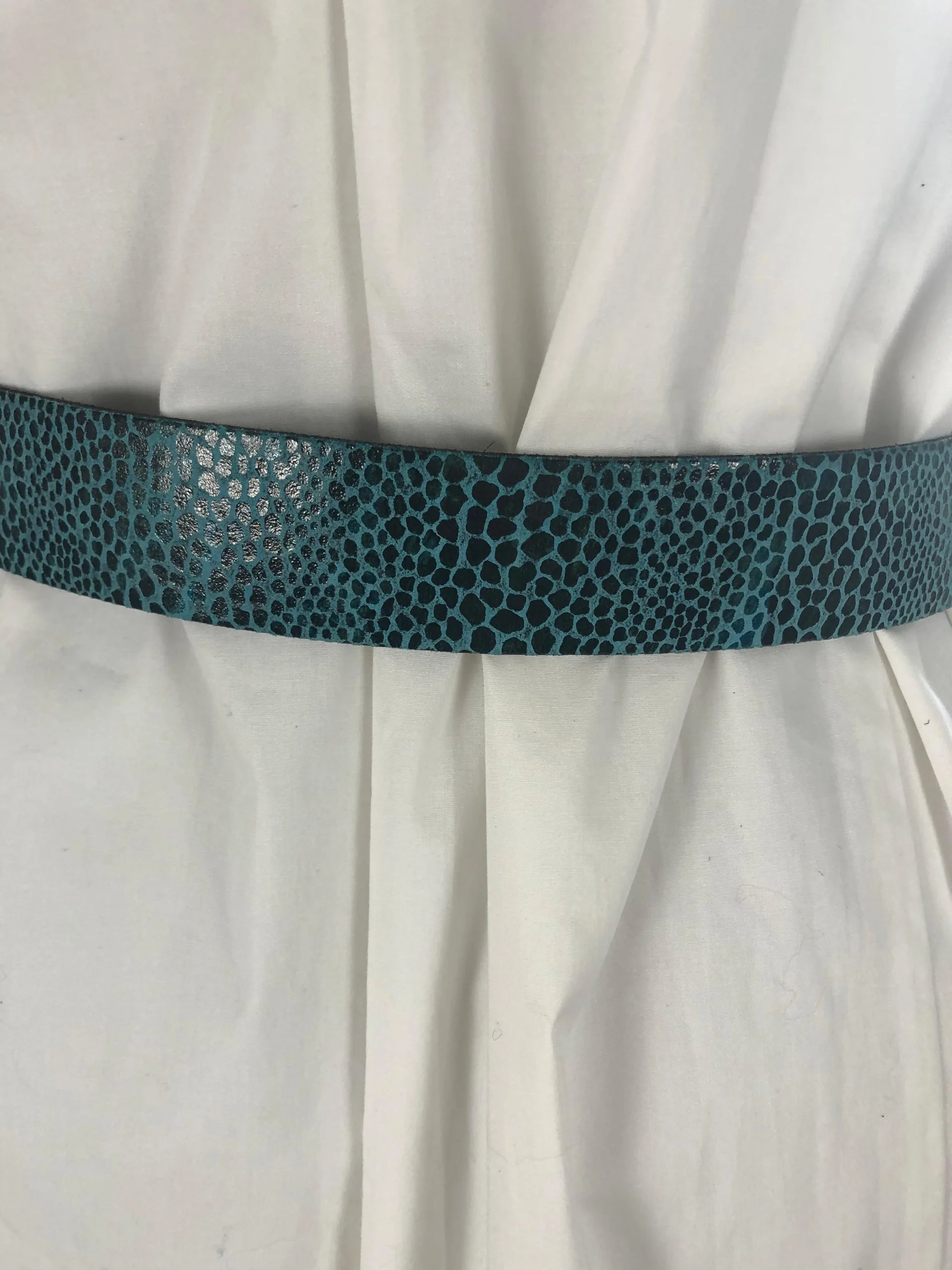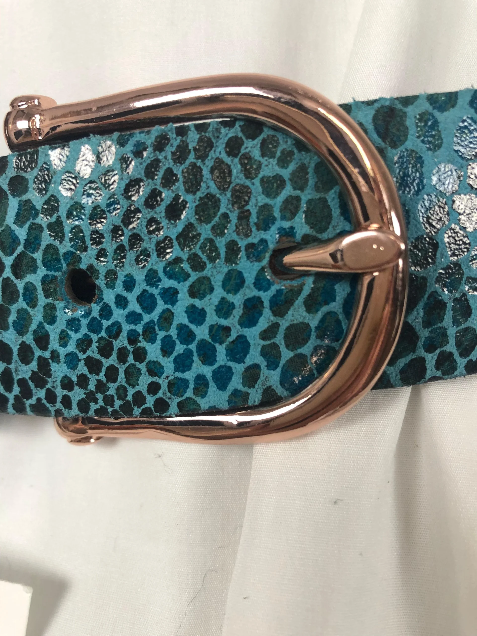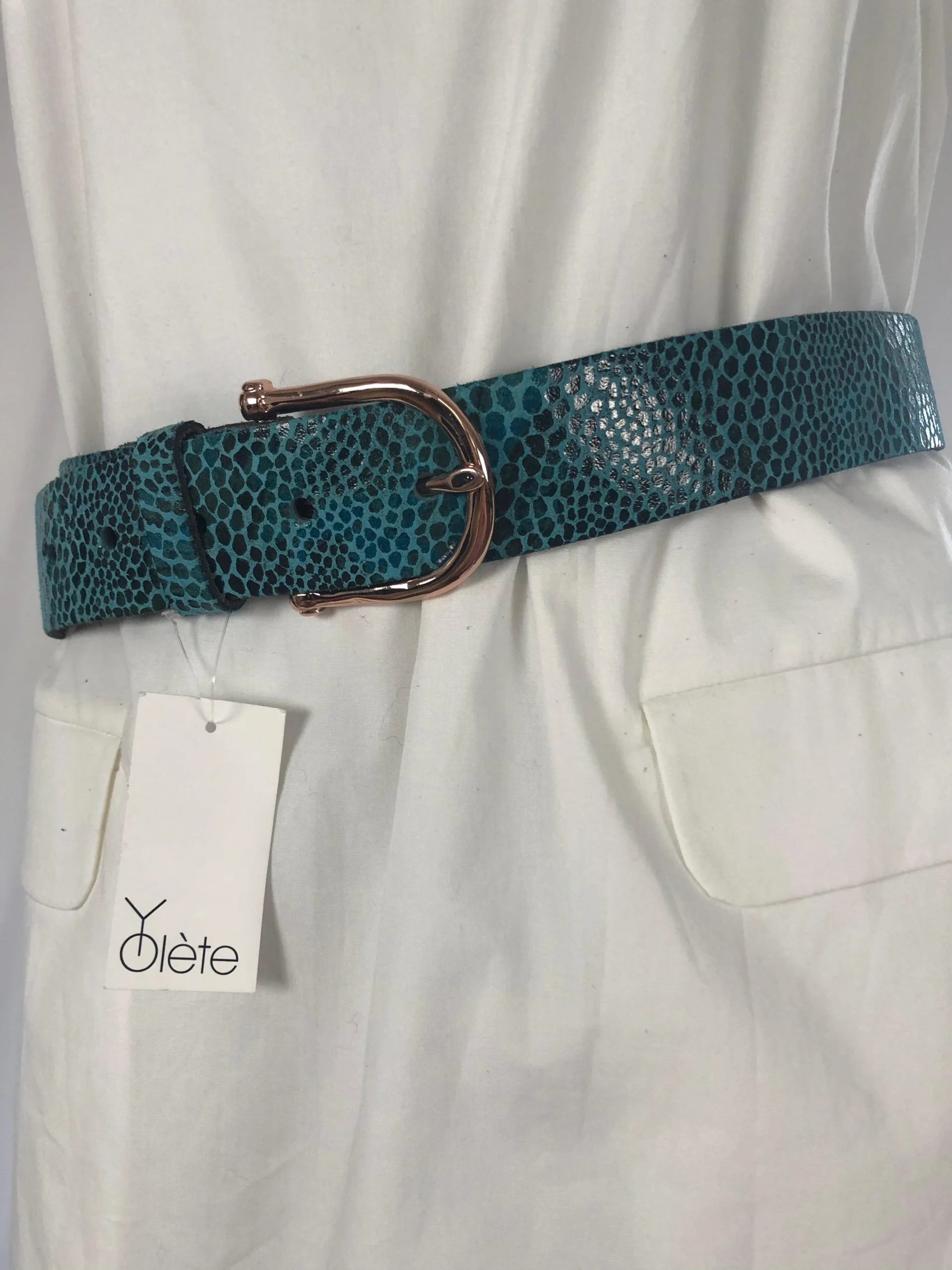 Très belle ceinture pour femme en cuir façon croco avec boucle cuivrée de la marque Yolète Tons vert turquoise Largeur 4 cm Valeur en boutique : 75 € Taille : 100 cm – Réf : 100AC791