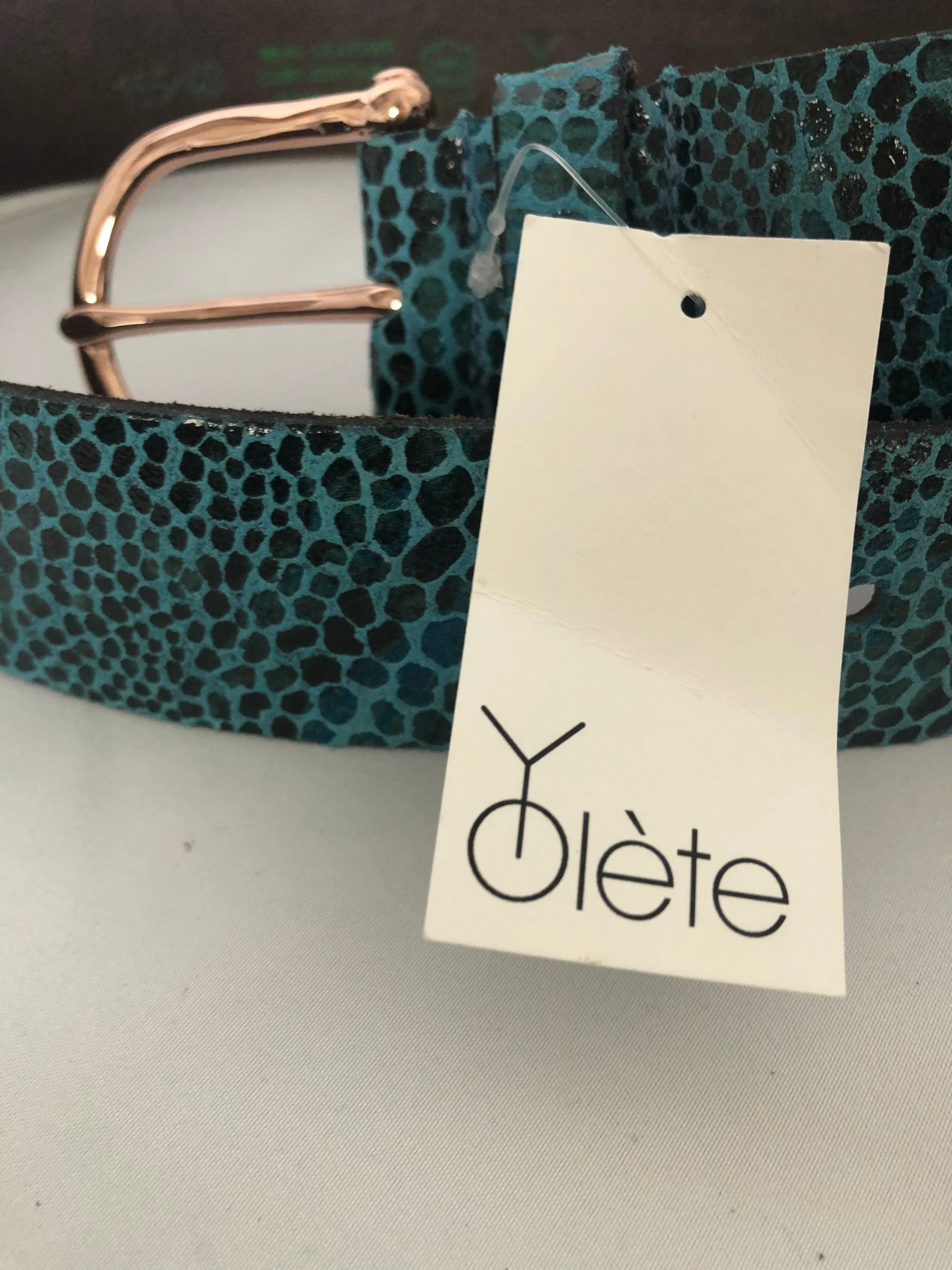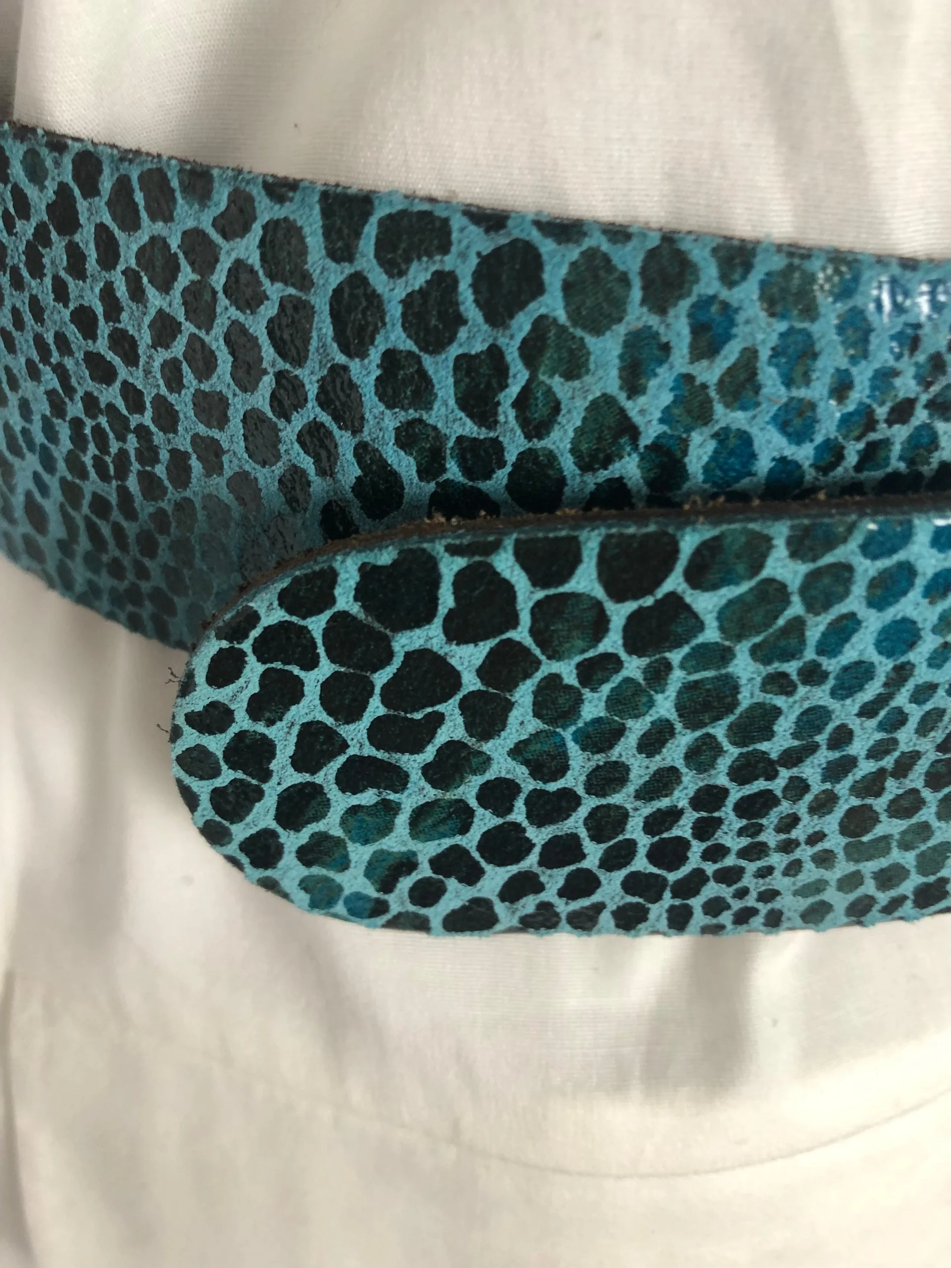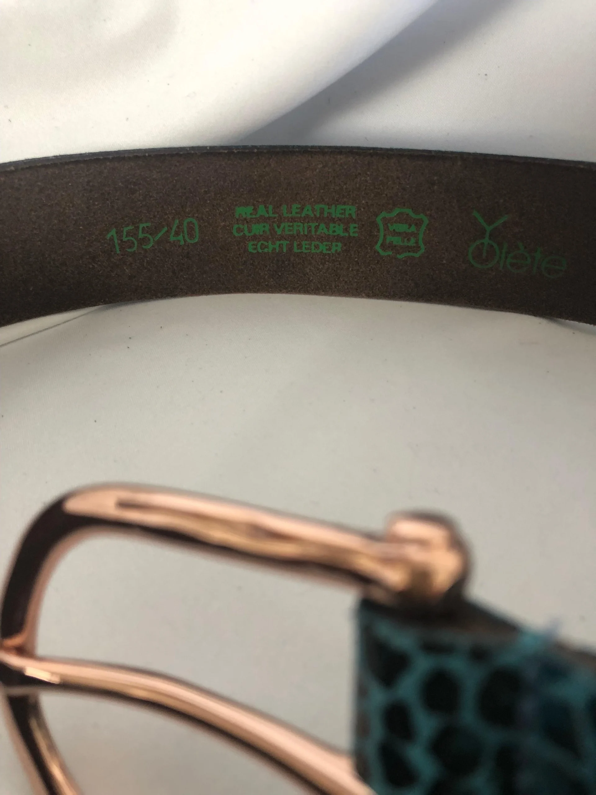 Très belle ceinture pour femme en cuir façon croco avec boucle cuivrée de la marque Yolète Tons vert turquoise Largeur 4 cm Valeur en boutique : 75 € Taille : 100 cm – Réf : 100AC791