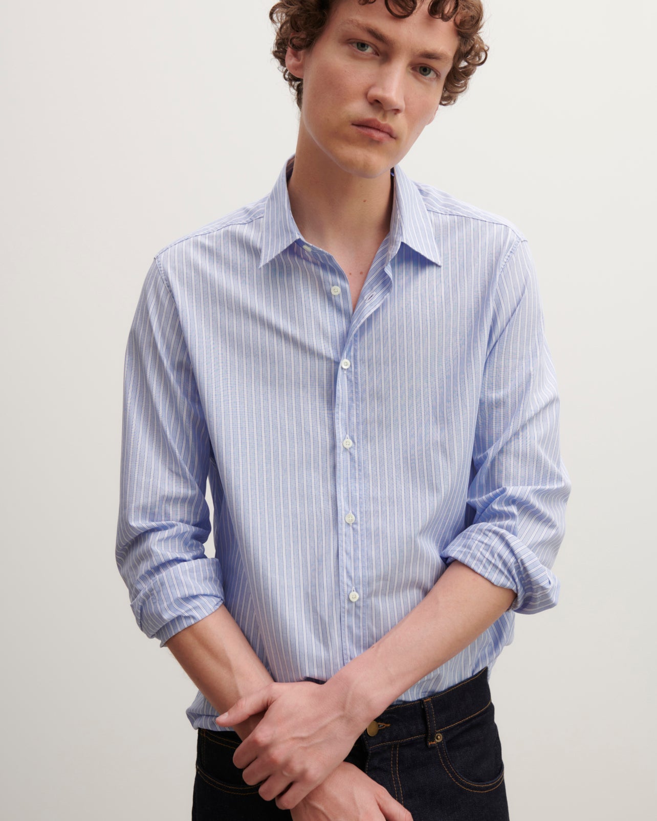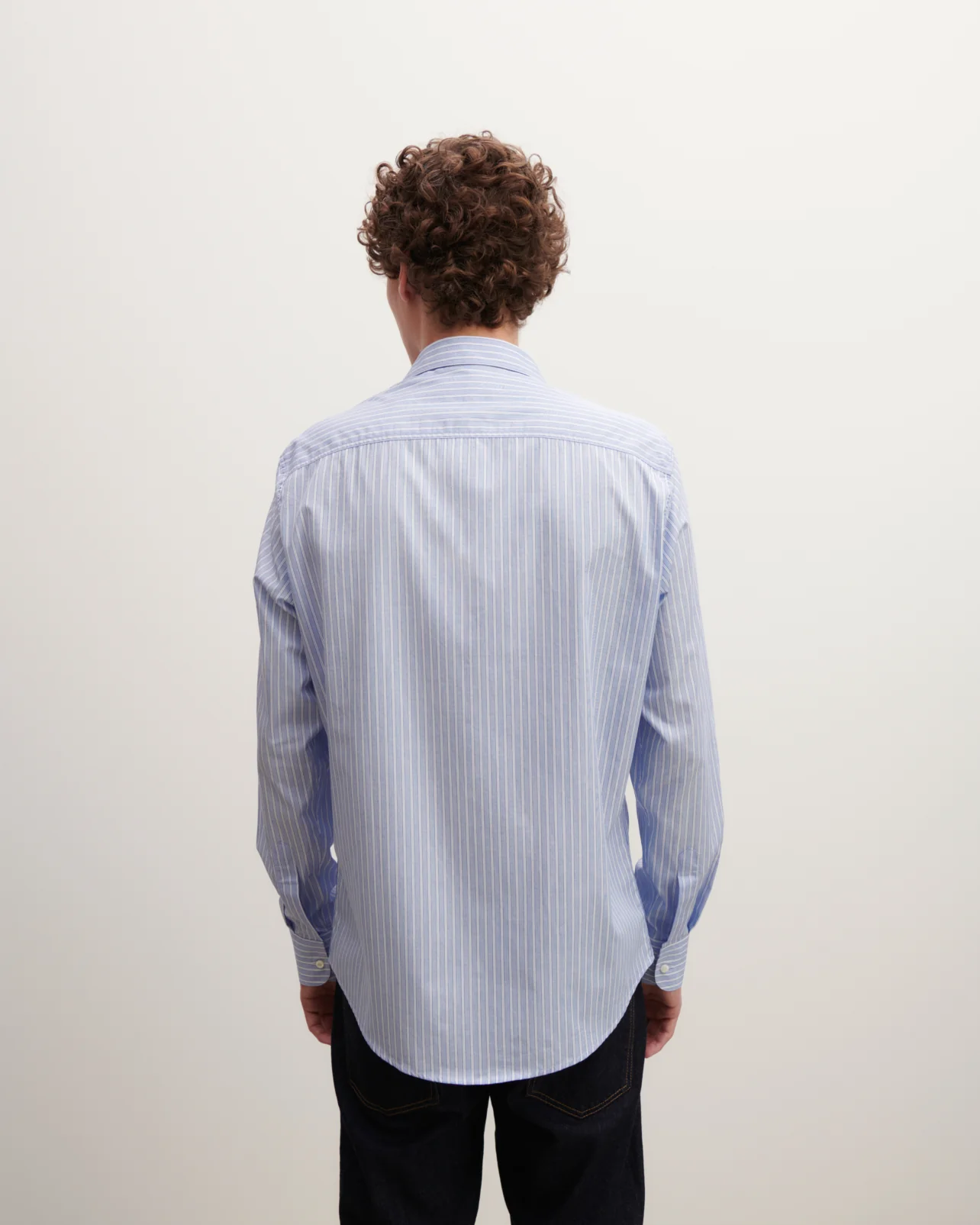 Chemise homme en coton rayé. Modèle à coupe décontractée. -Chemise rayée homme-Coupe ample et longue-Bas de la chemise arrondi -Emmanchure droite-Manches longues -11 boutons -Fines rayures blanches verticales-Monogramme EB brodé en bas à gauche -Pli central dos