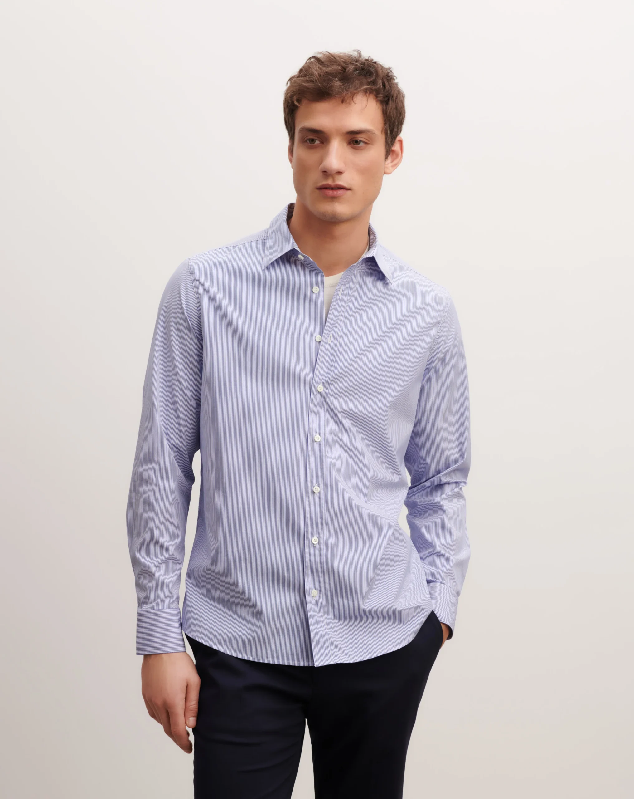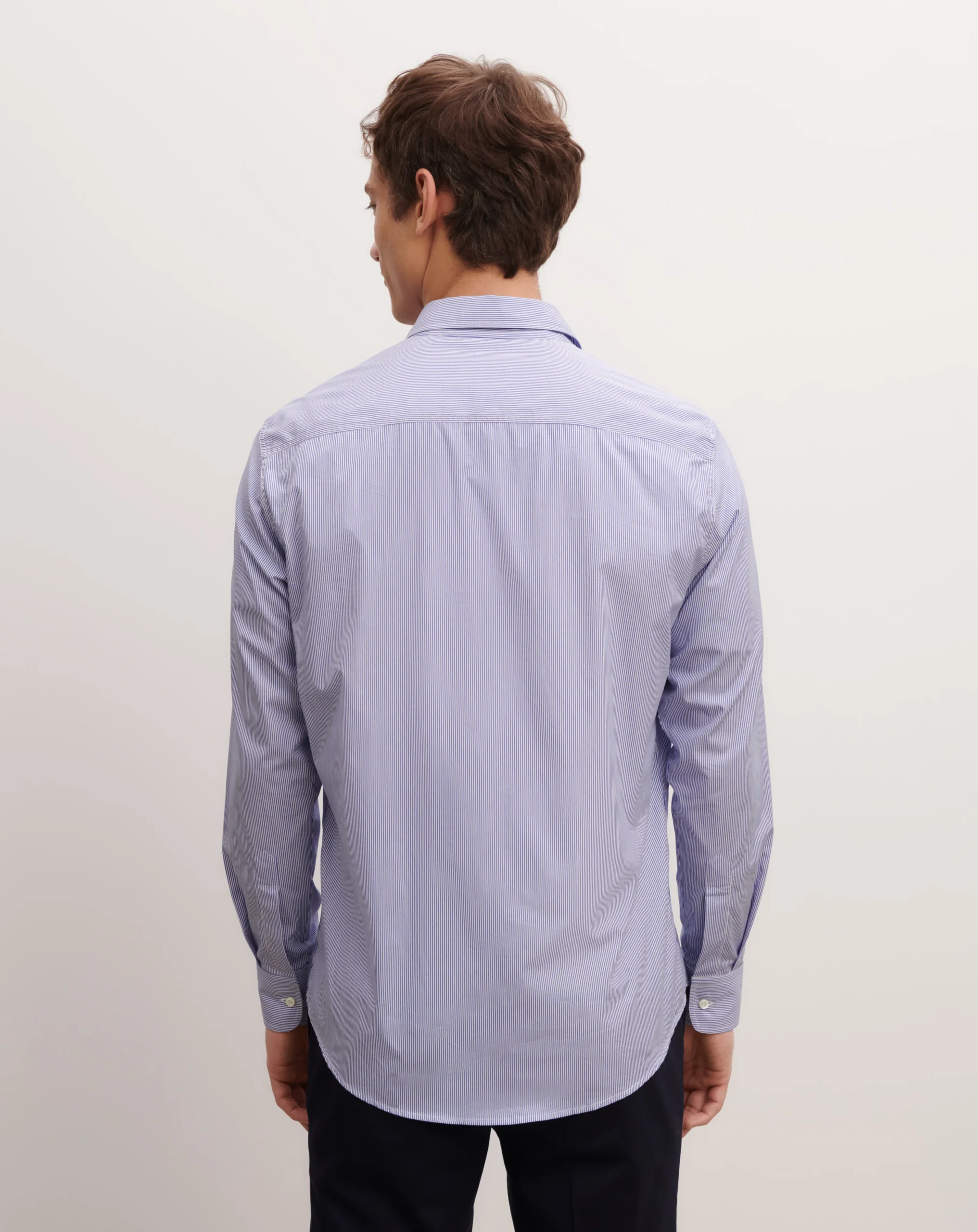 Chemise à fines rayures pour homme. Modèle à coupe droite décontractée, réalisé en pur coton.