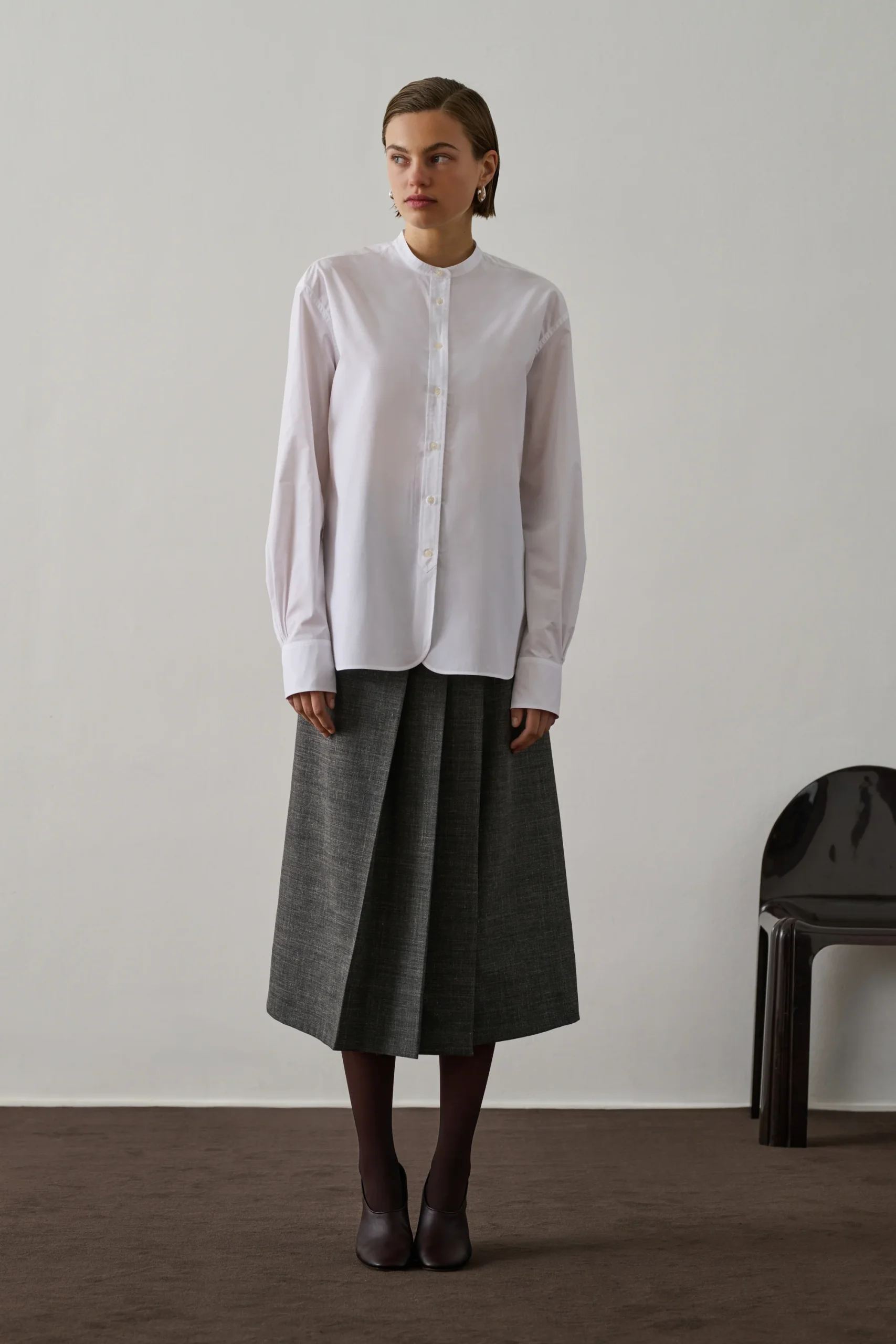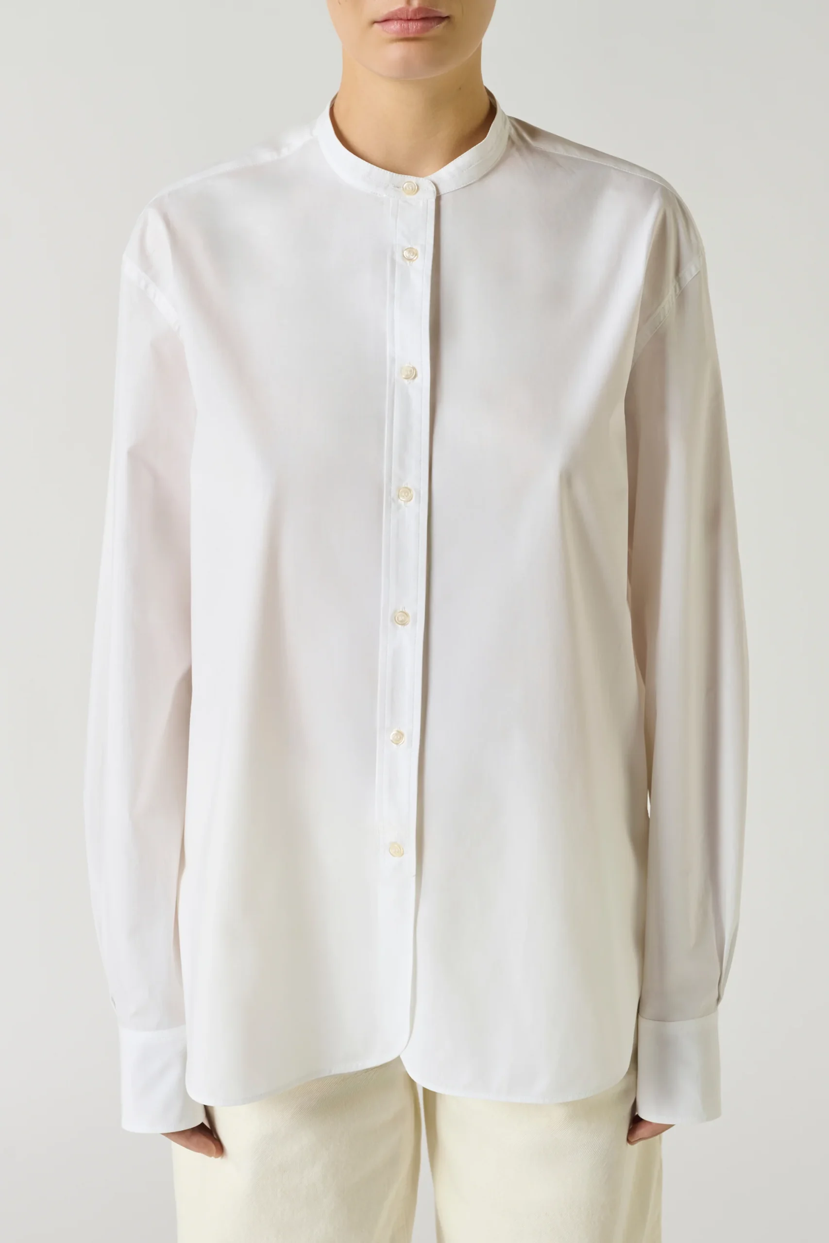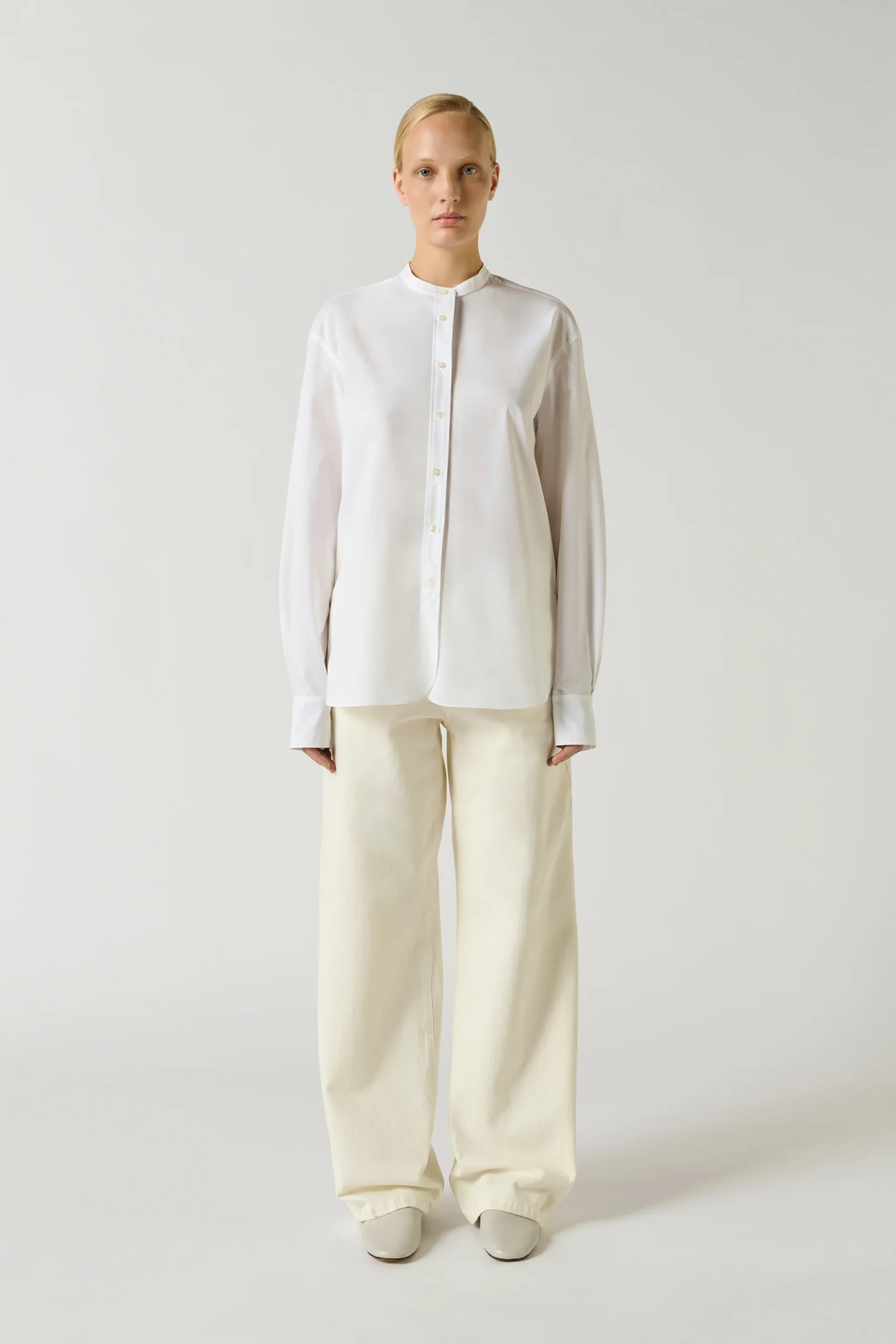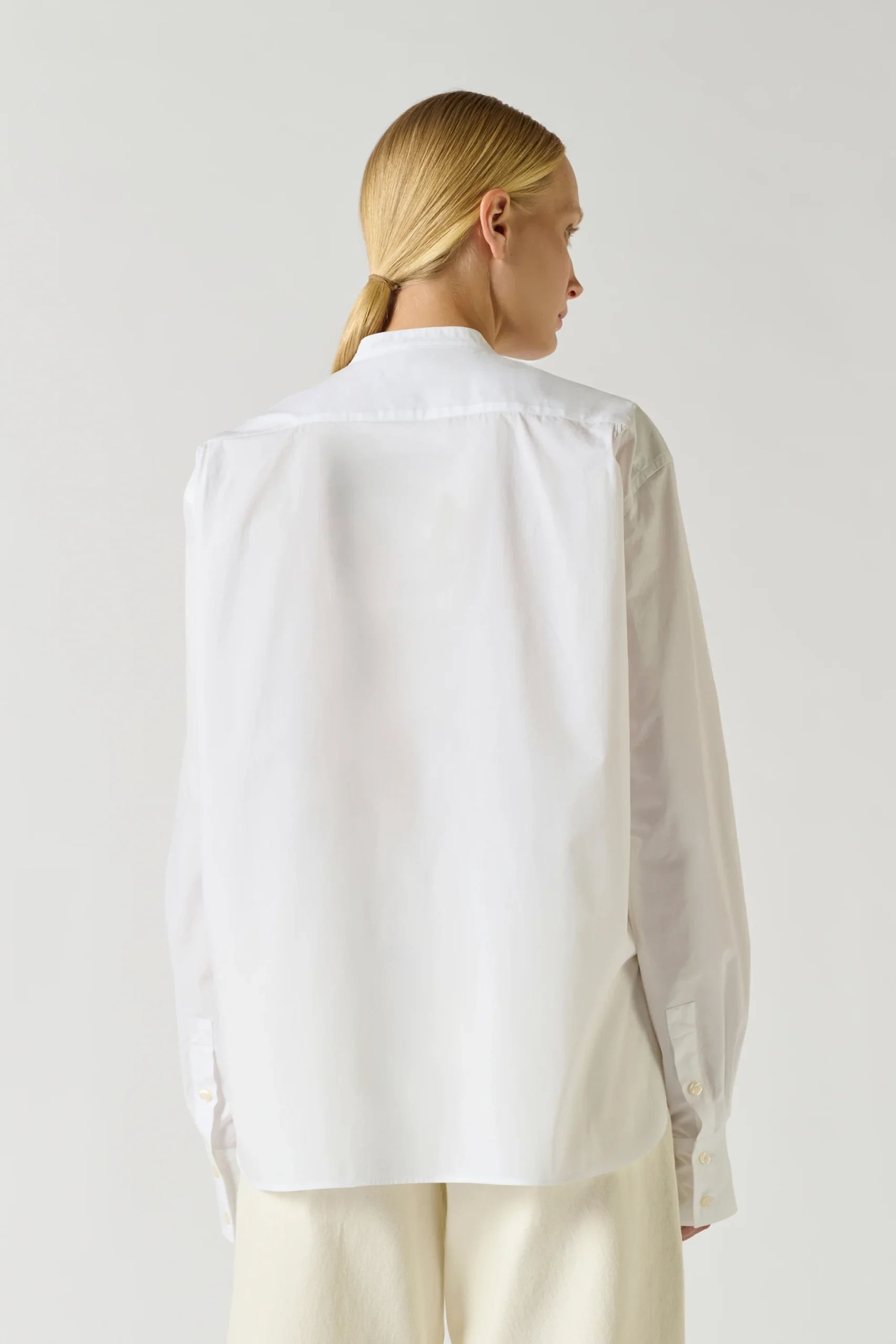 BERMUDES est une chemise sans col en popeline de coton biologique, à la coupe droite et oversize. Ses manches longues se terminent par des poignets boutonnés. L’ourlet liquette et la popeline légère en font un basique intemporel, aux finitions impeccables, indispensable au vestiaire.