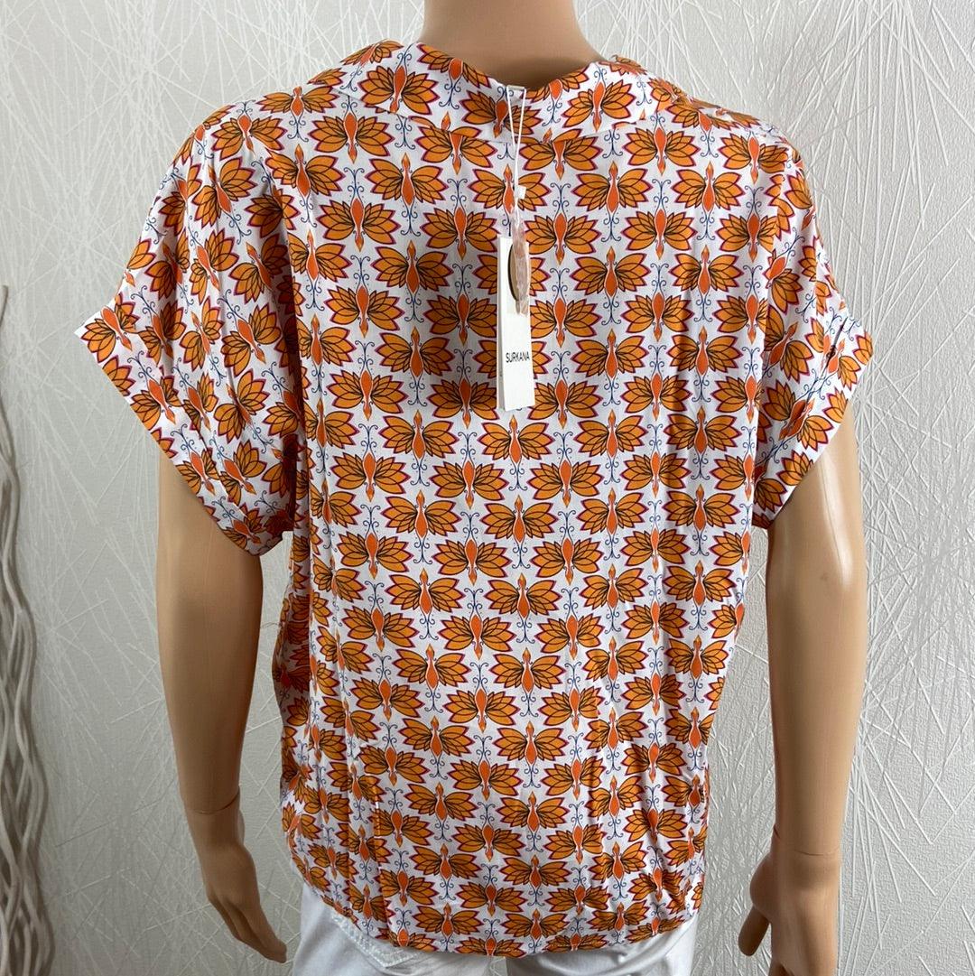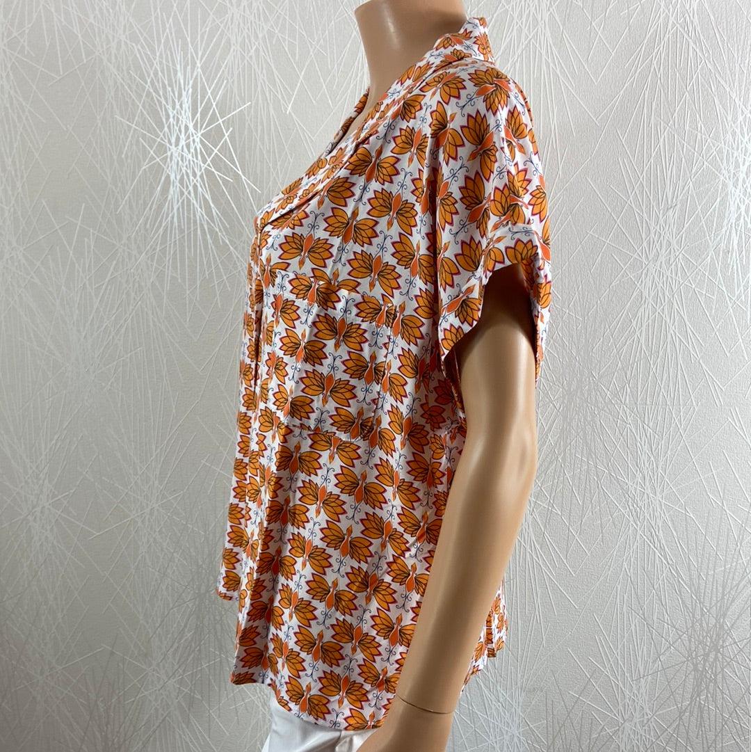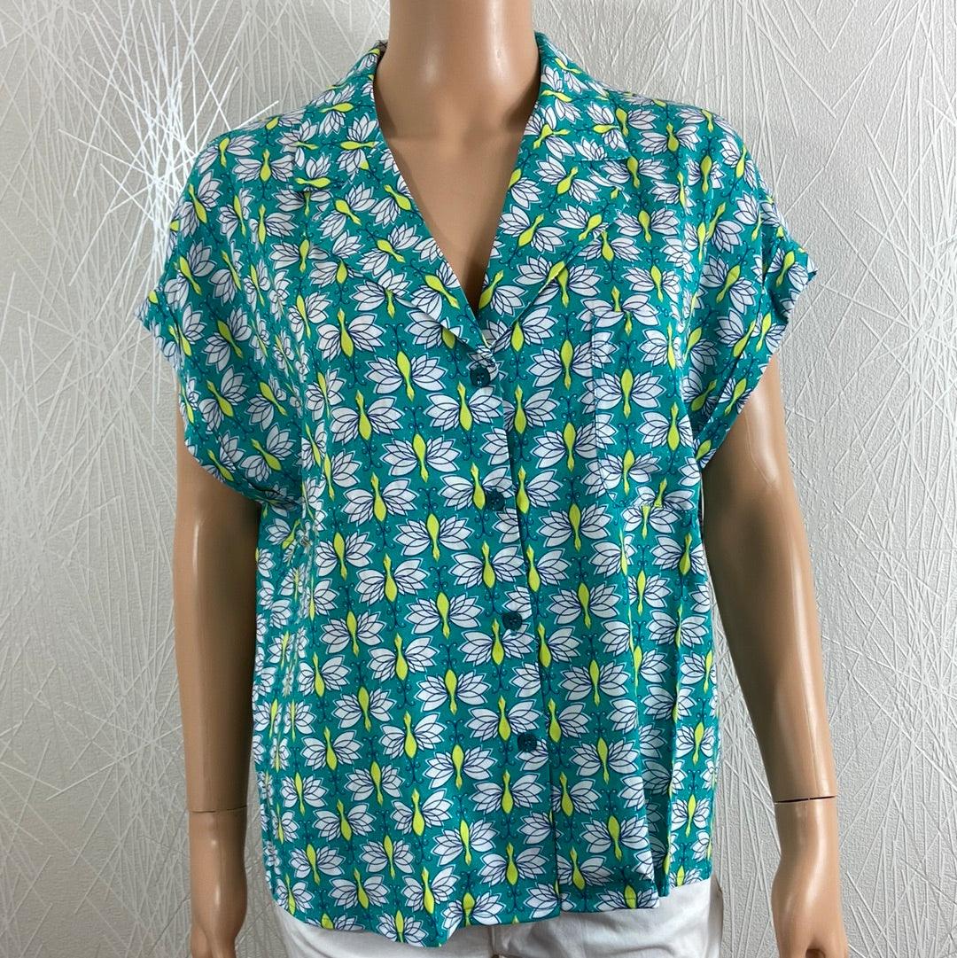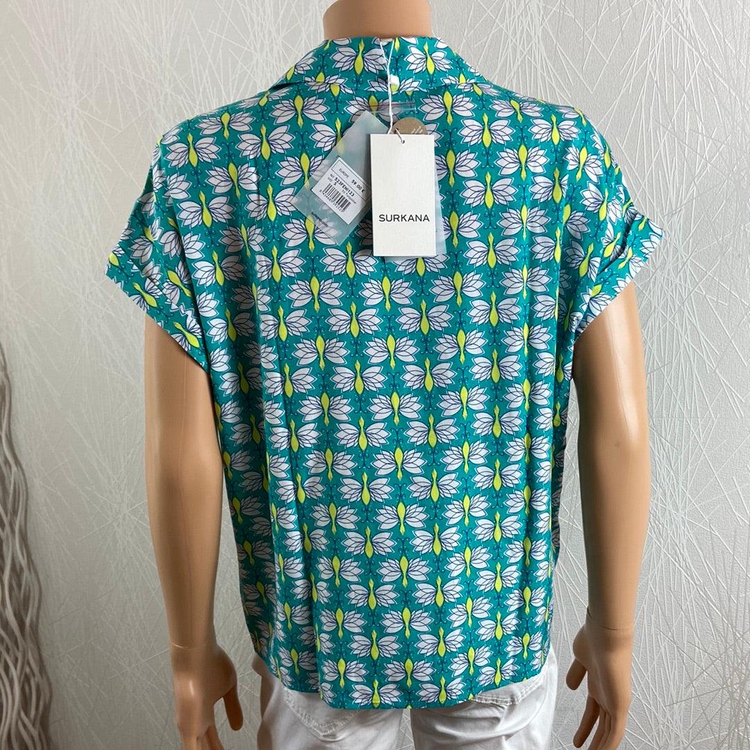 Chemise pour femme à motif vintage de la marque Surkana. Manches courtes, col chemise, encolure en V, poche sur la poitrine et entièrement boutonnée. Matière : 100% viscose Couleur : Bleu ou orange, au choix. Marque : Surkana Dimensions Taille 36 : Tour de poitrine : 114 cm ; longueur : 58 cm. Dimensions Taille […]