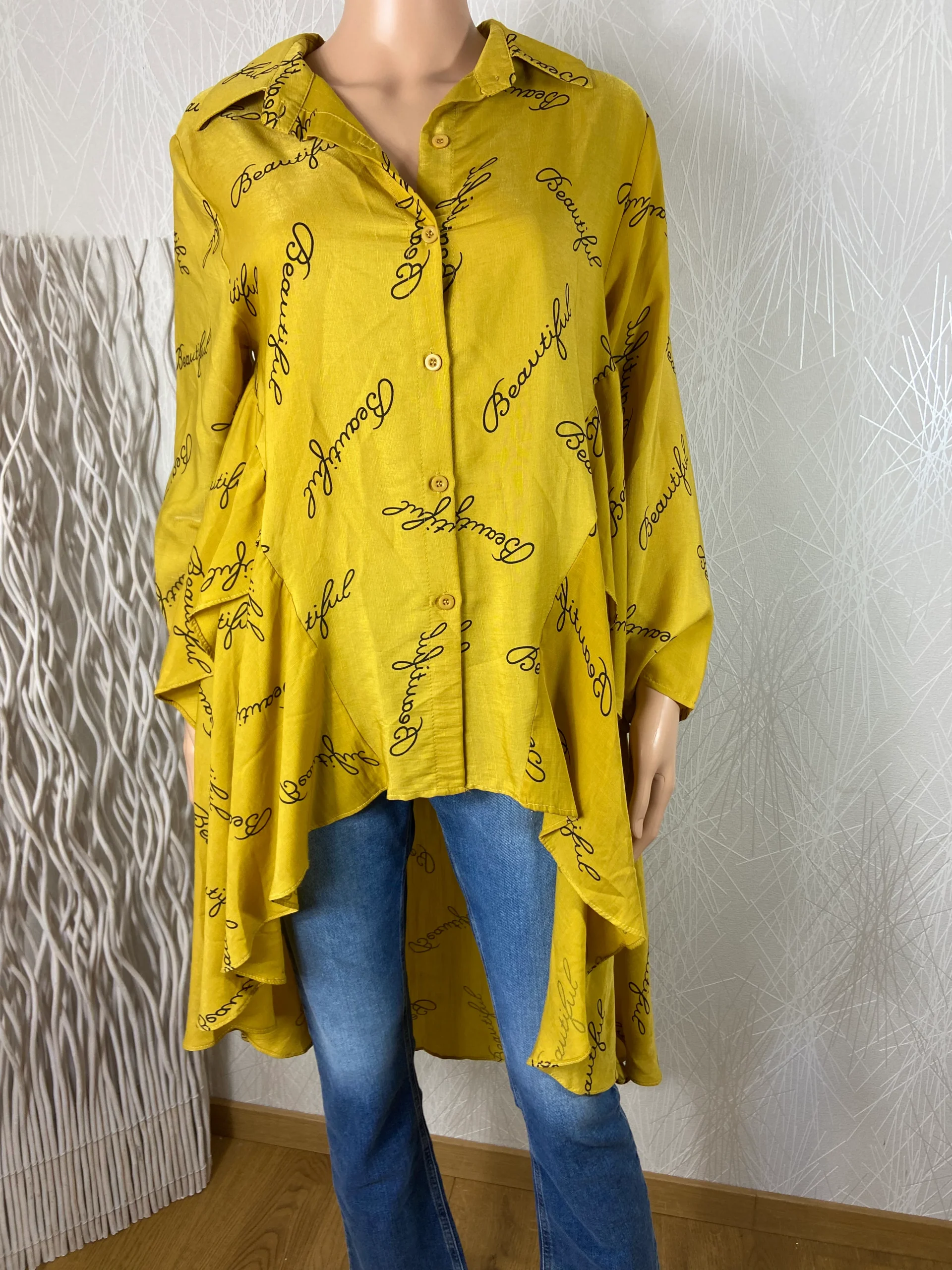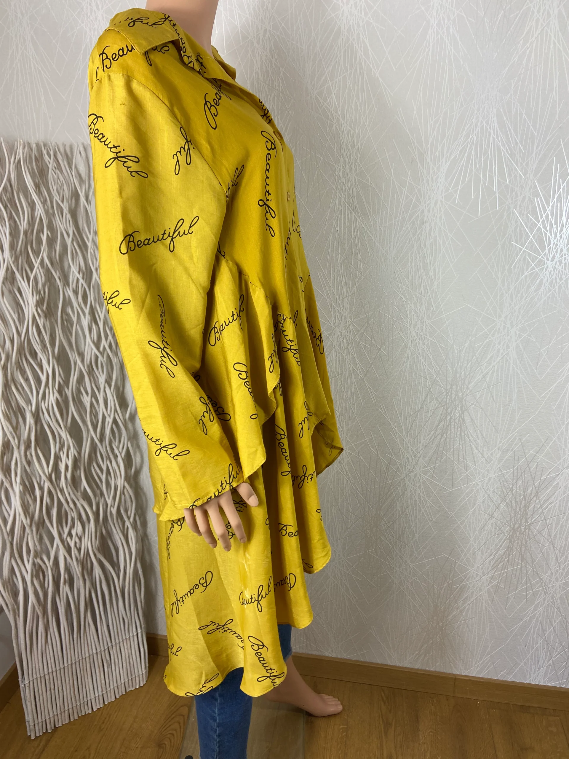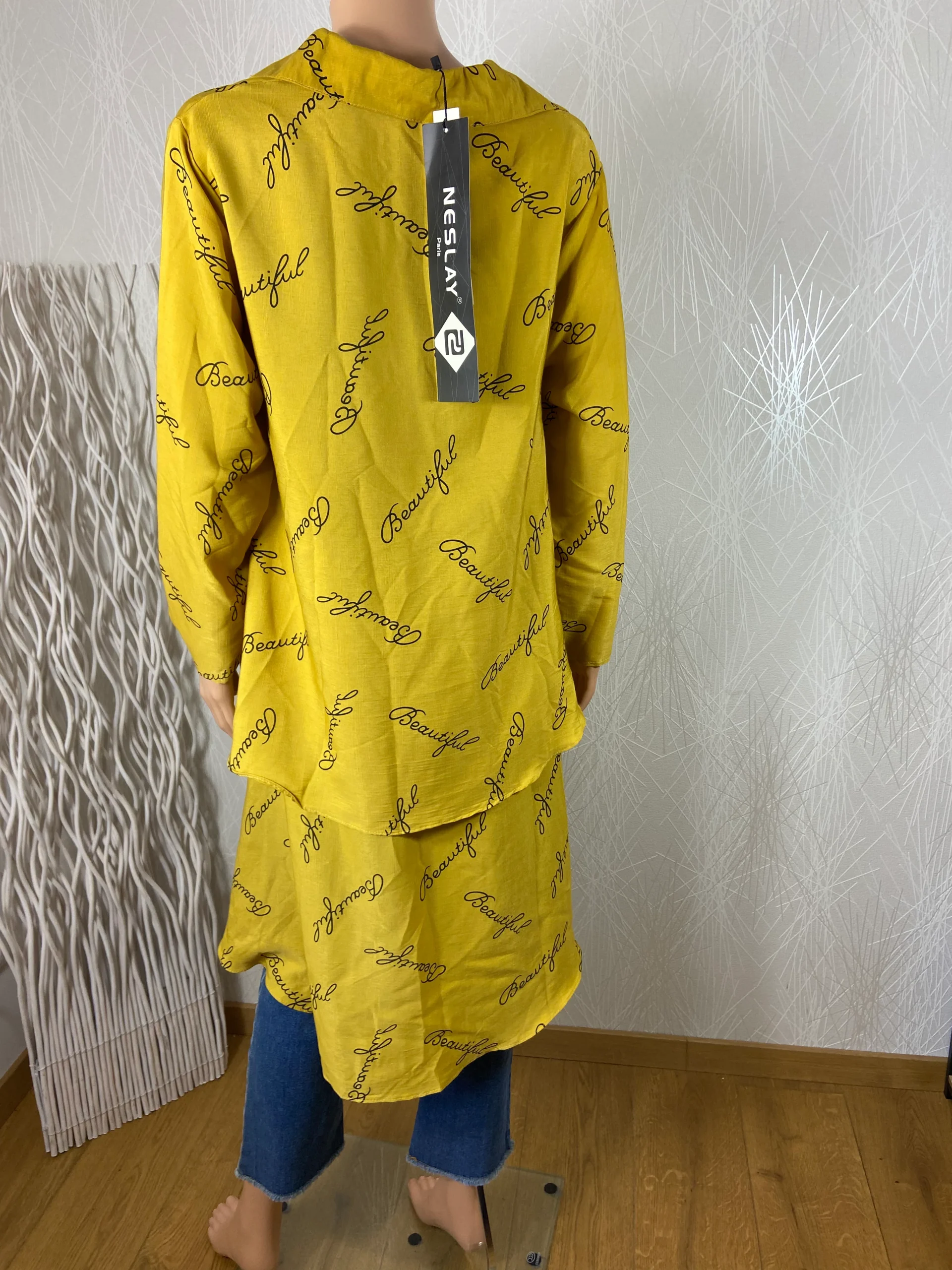 Chemisier jaune à manches 3/4 avec l’inscription « Beautiful » de la marque Neslay. Il est plus long devant que derrière avec un volant et se ferme avec des boutons.