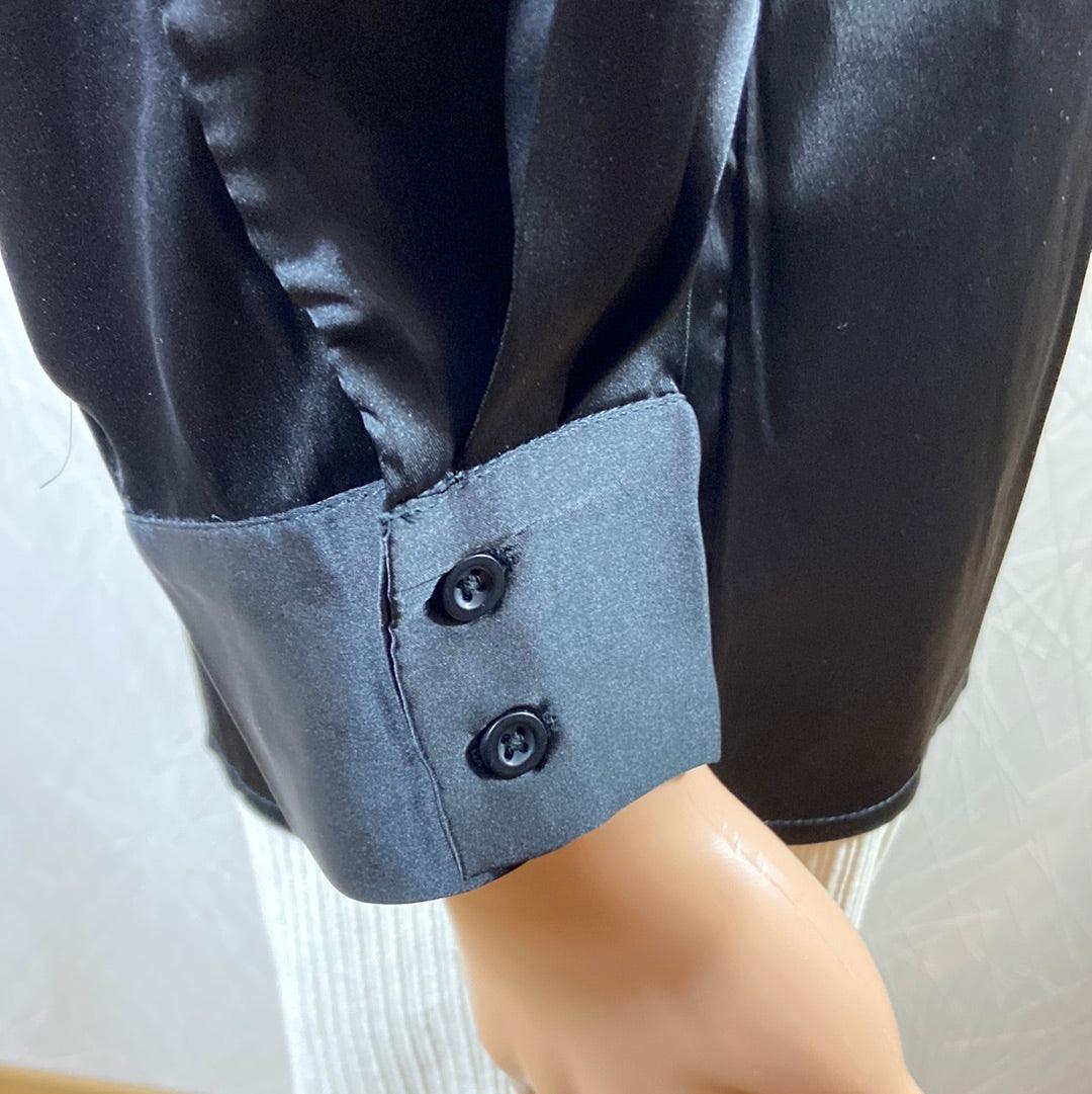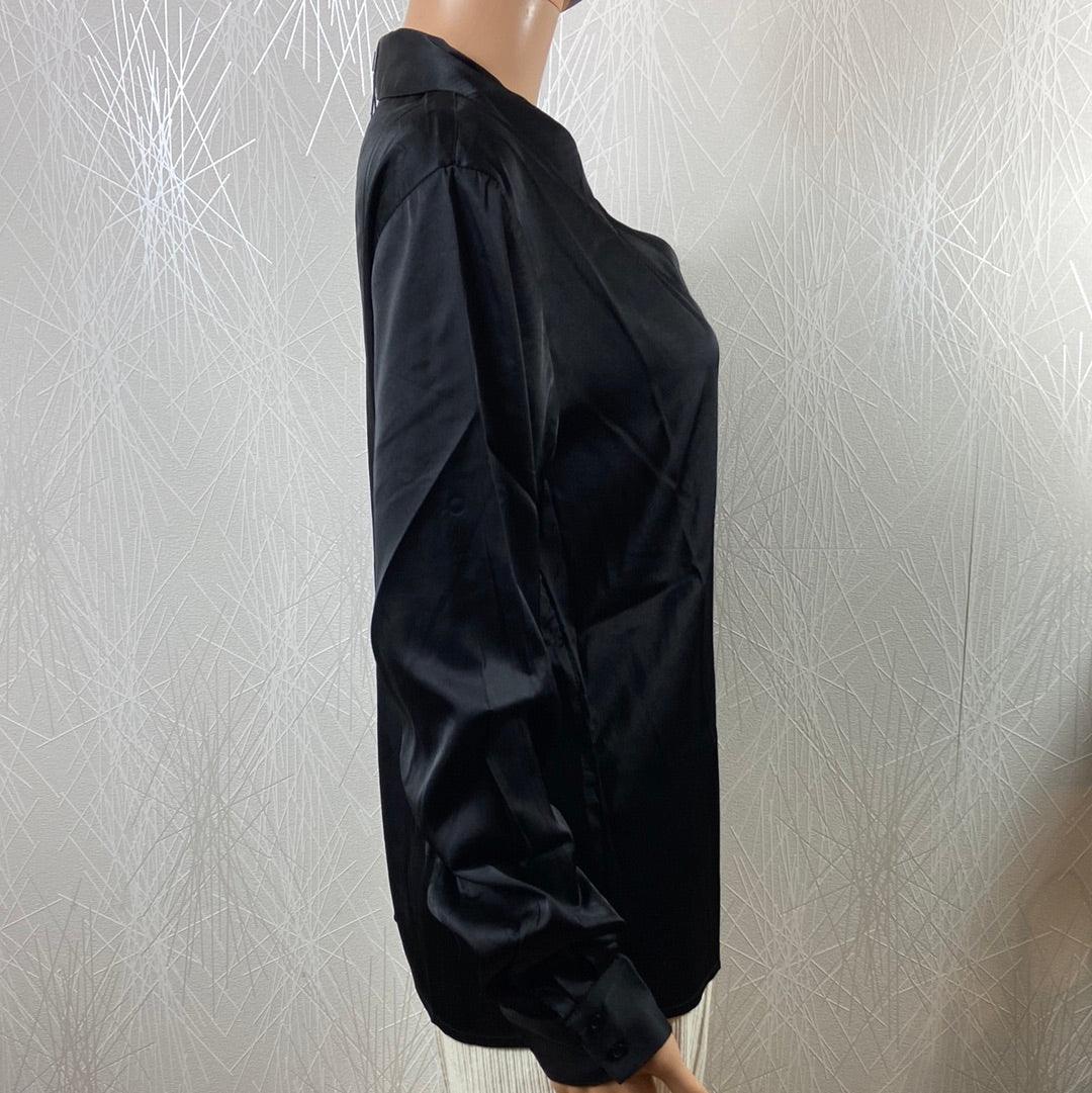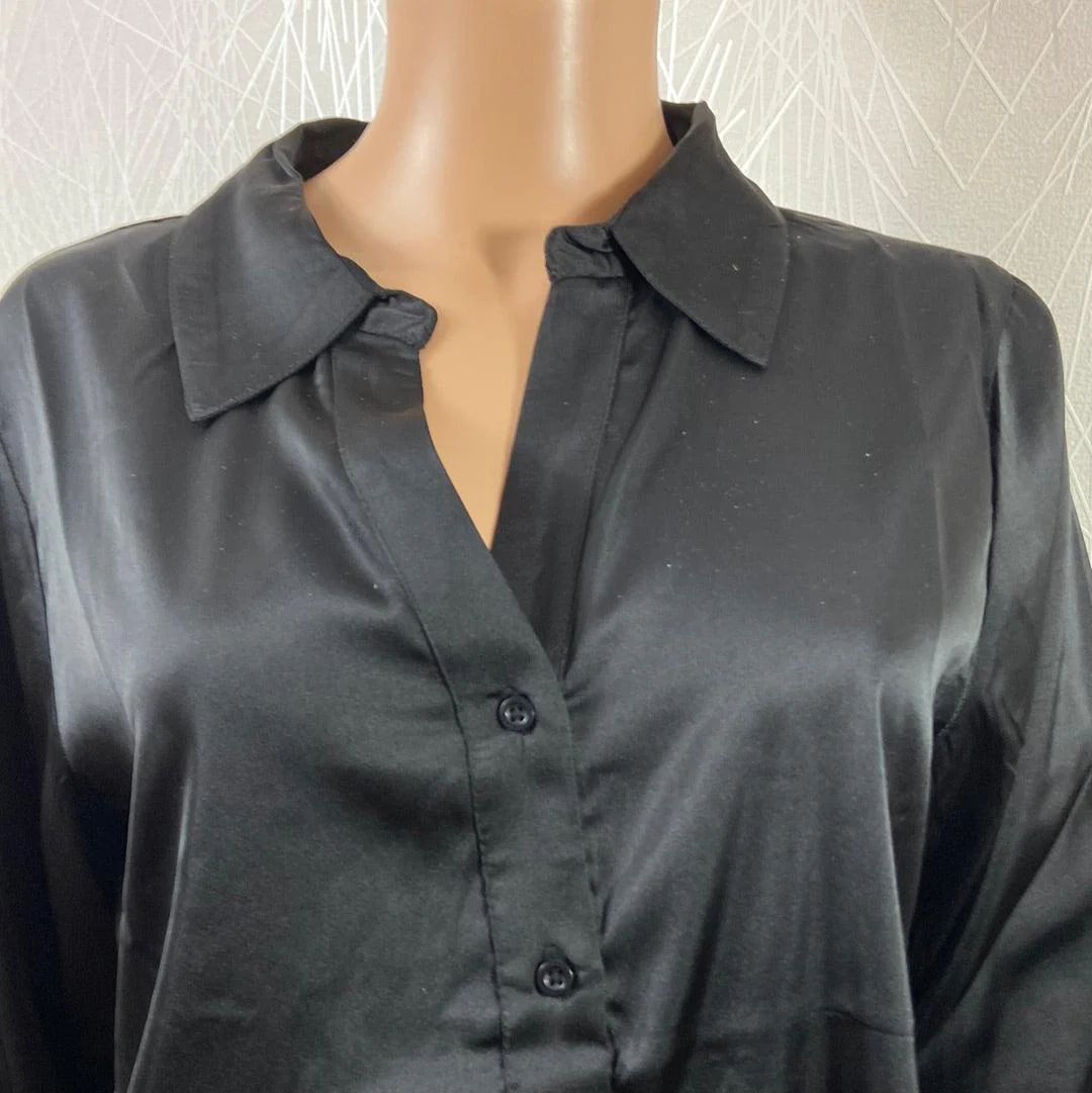 Manches longues avec boutons aux poignets, tissu satin, col chemise, coupe droite et entièrement boutonnée.