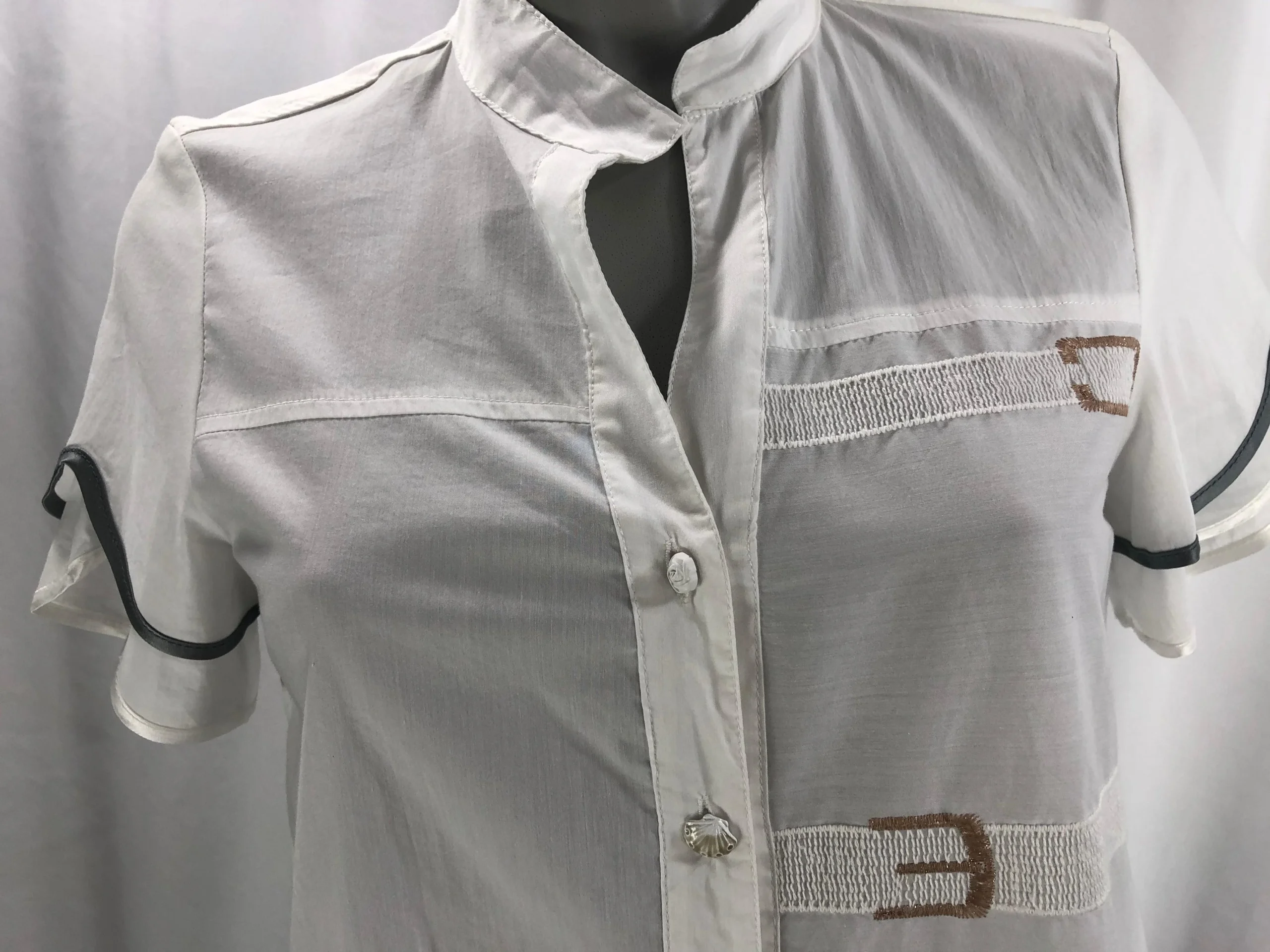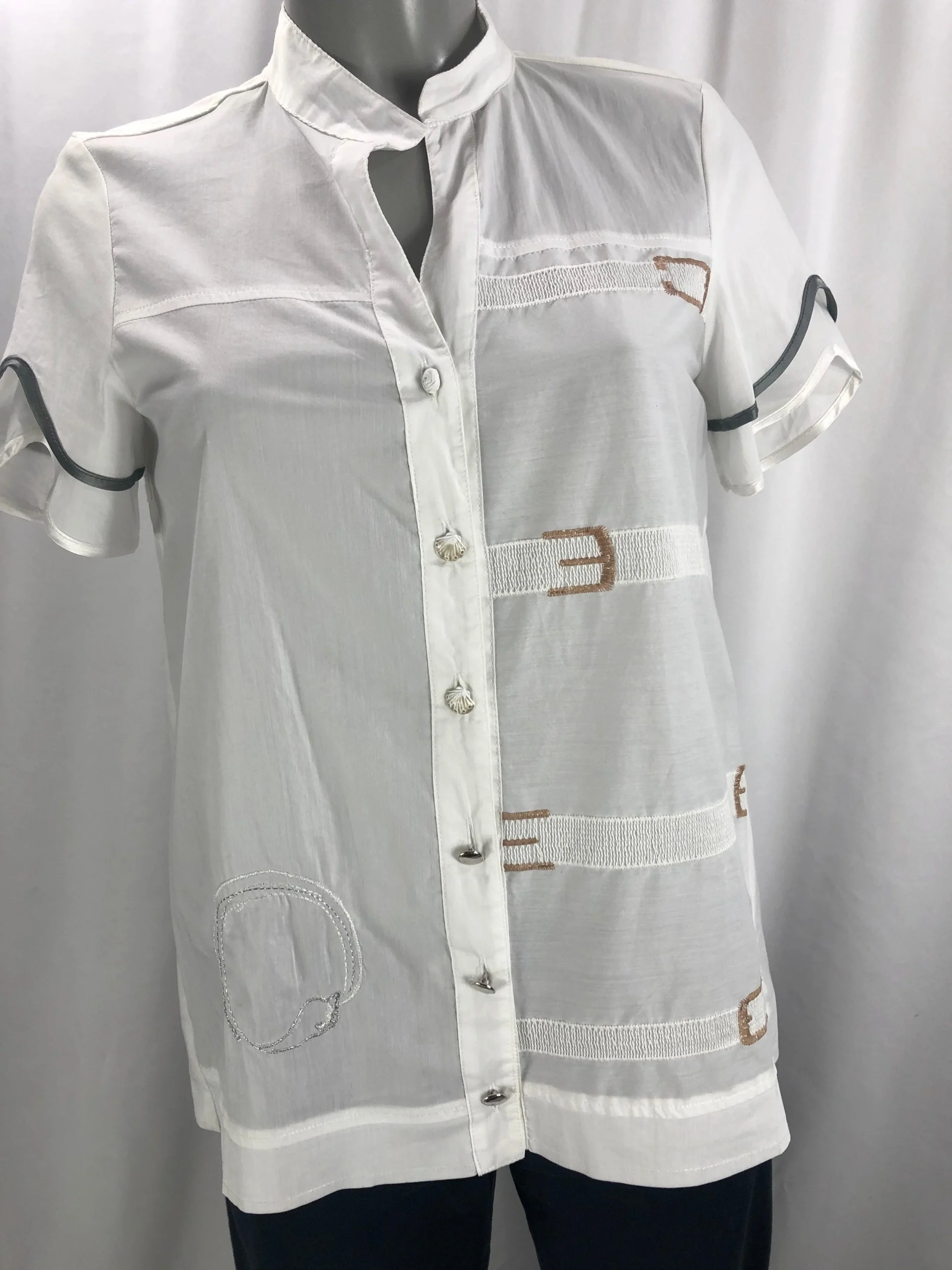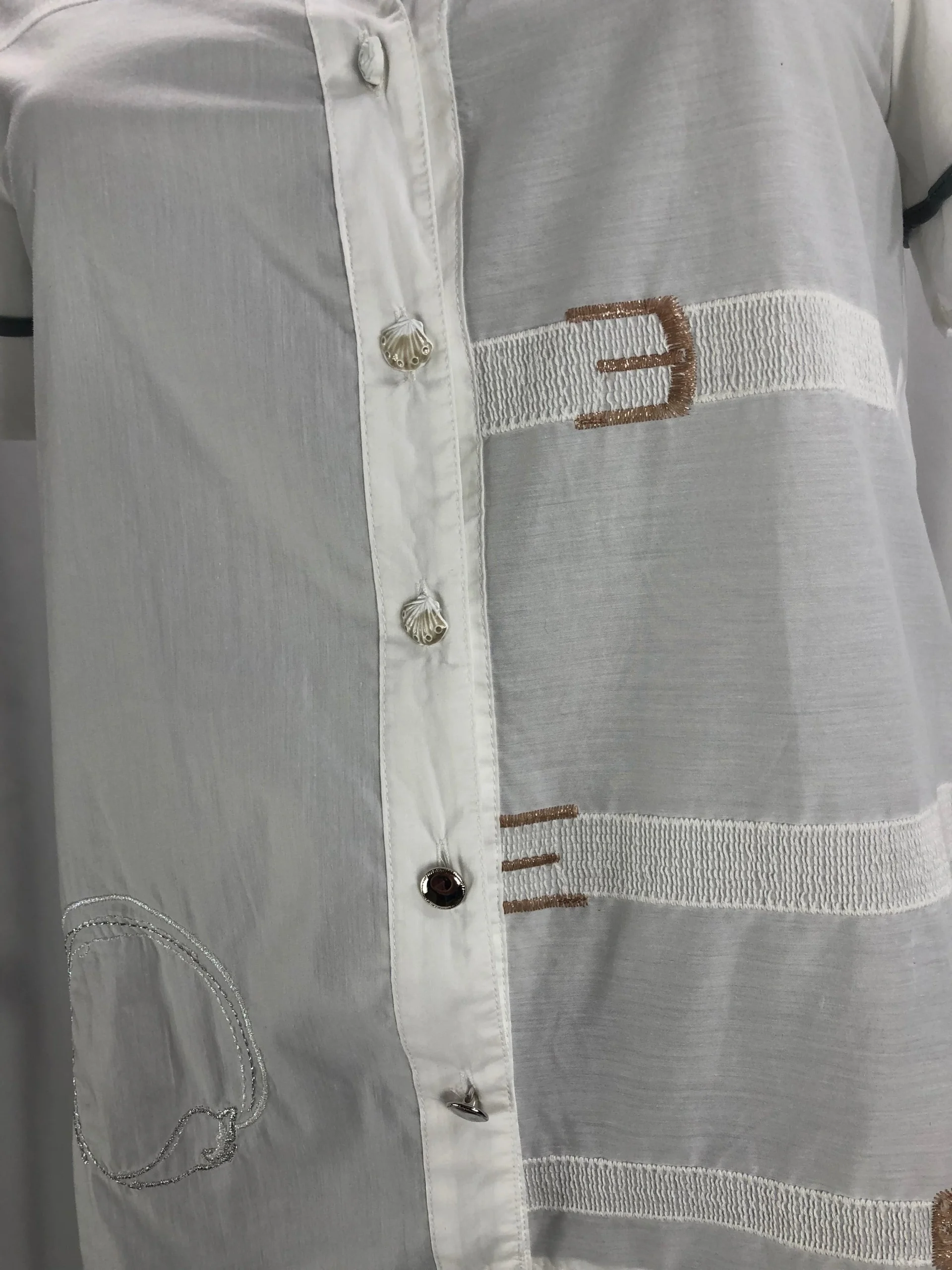 Joli chemisier blanc pur haut de gamme pour femme, à coupe droite, par la styliste Elisa Cavaletti. Encolure col remontant sur l’arrière du cou, écharpée en V sur le devant. Manches courtes, finition fantaisie, liseré de style à cordon de couleur contrastée et motifs dorés. Décoration de boucles dorées et boutons bijoux. Belle fabrication de […]