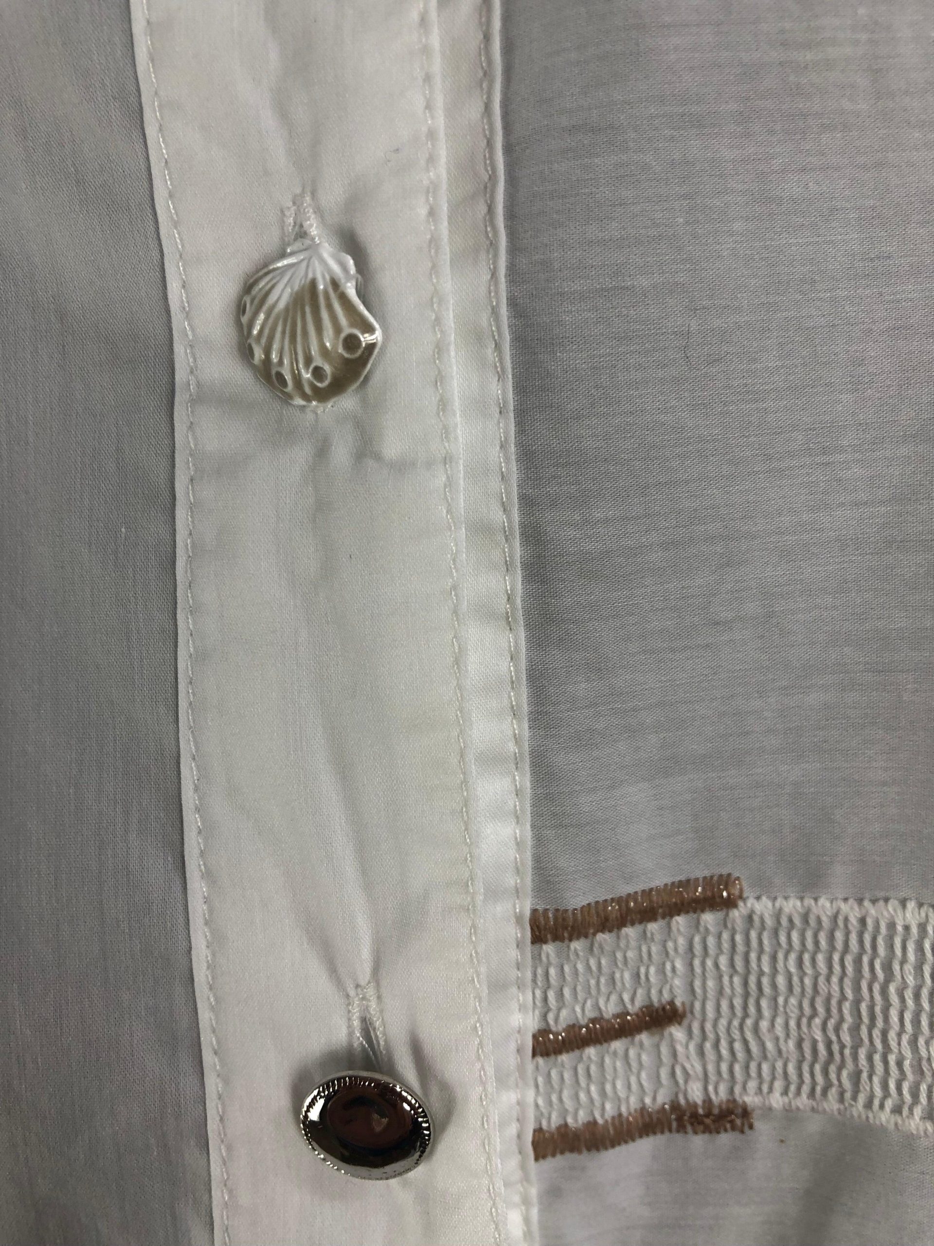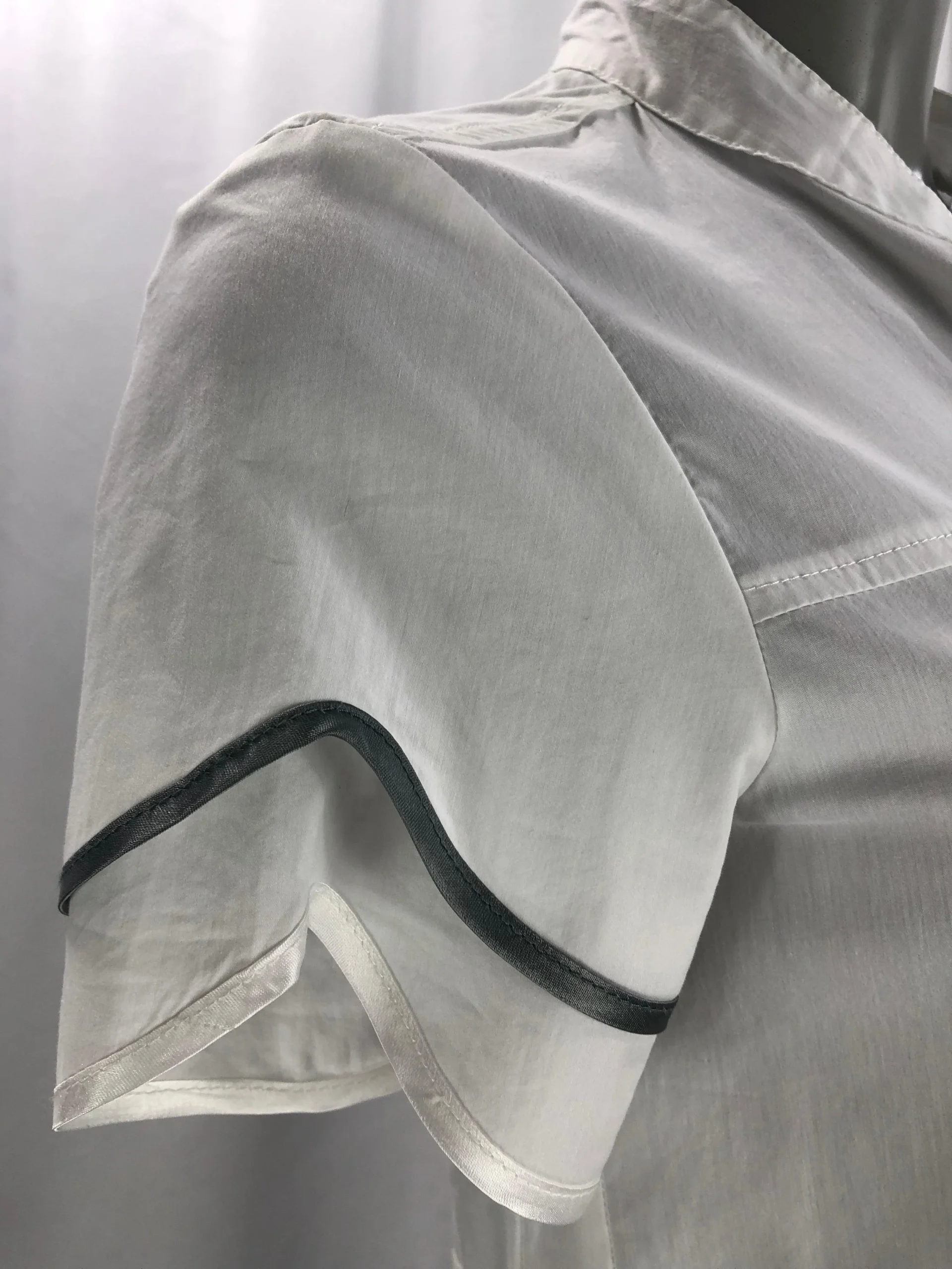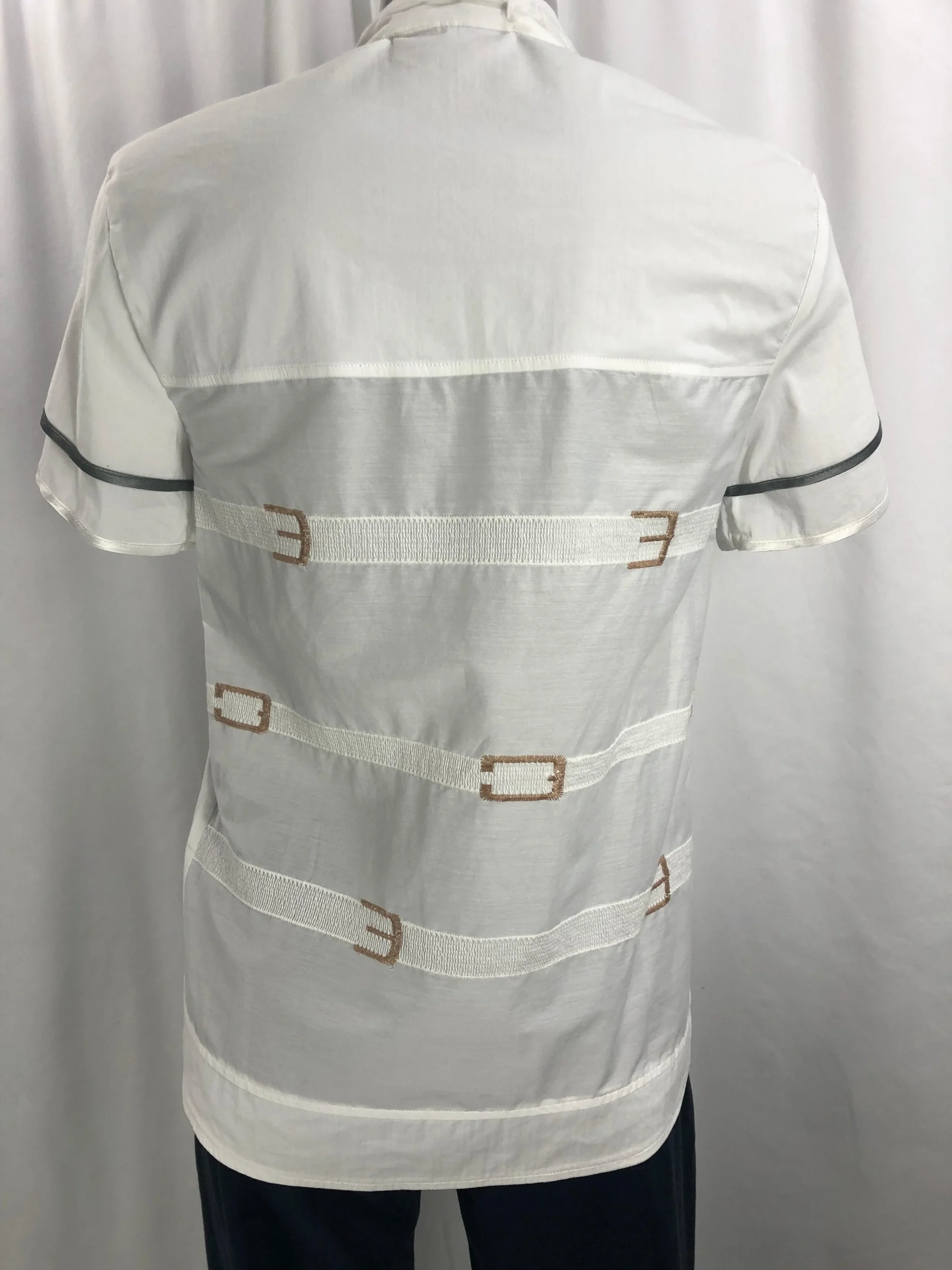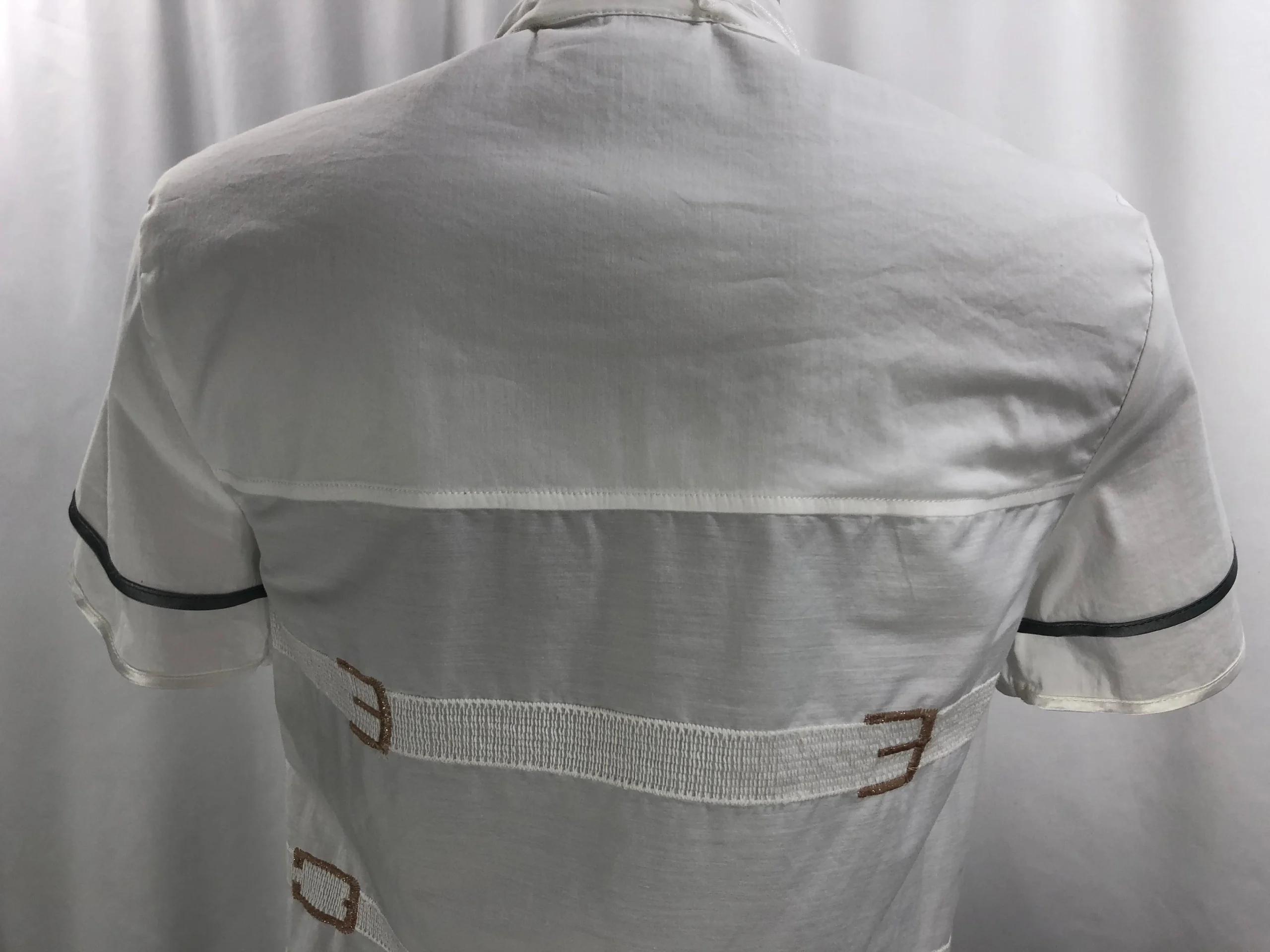 Joli chemisier blanc pur haut de gamme pour femme, à coupe droite, par la styliste Elisa Cavaletti. Encolure col remontant sur l’arrière du cou, écharpée en V sur le devant. Manches courtes, finition fantaisie, liseré de style à cordon de couleur contrastée et motifs dorés. Décoration de boucles dorées et boutons bijoux. Belle fabrication de […]