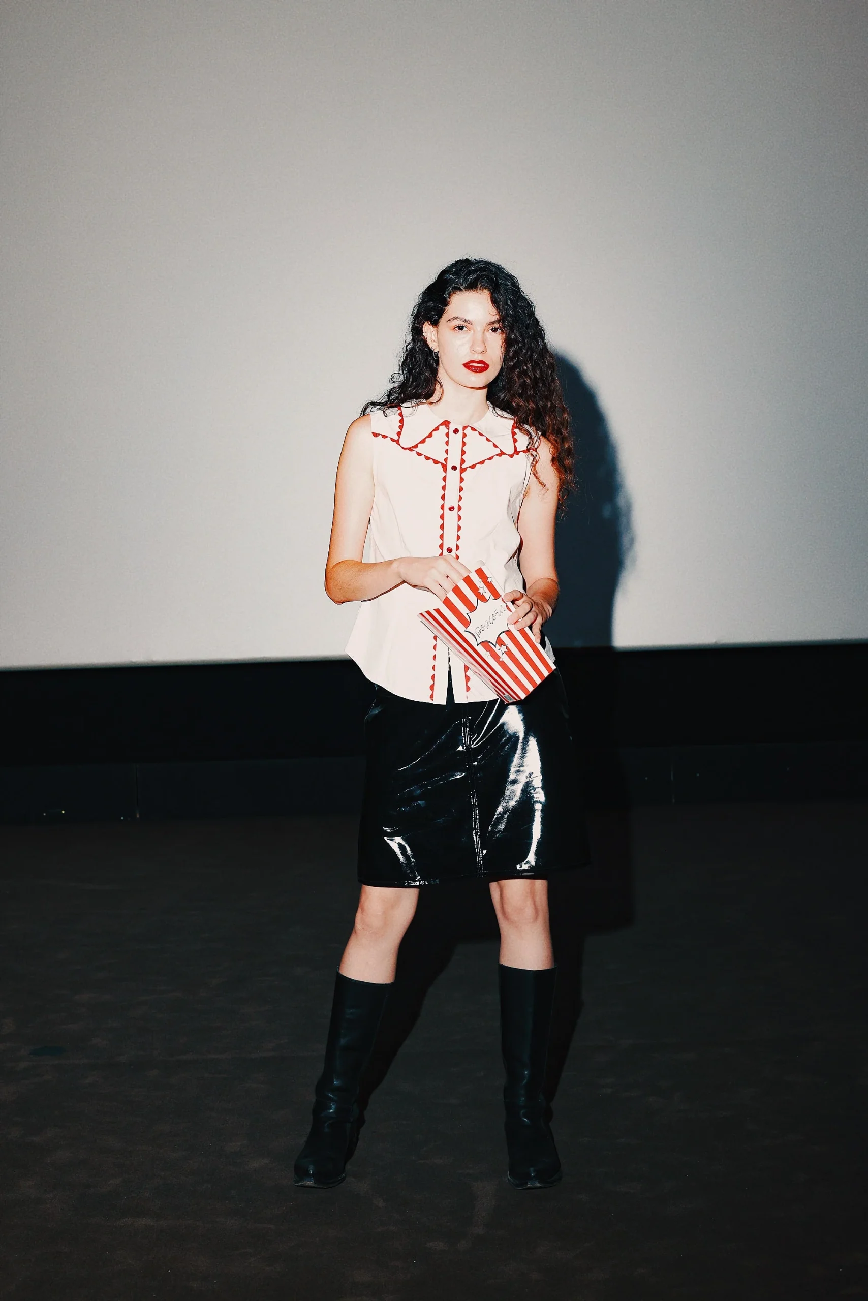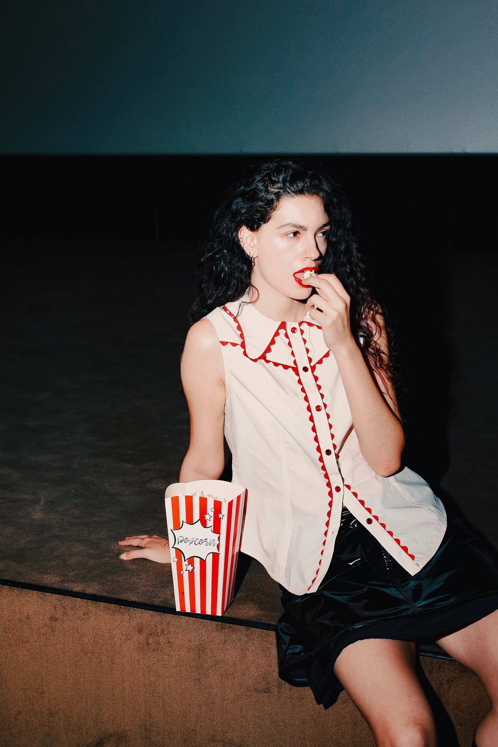 Chemisier sans manche en popeline de coton italienne. Détails croquet rouge, finitions biais vichy. Coupe ajustée, esprit western raffiné. Fabriqué à la main à Bourges.