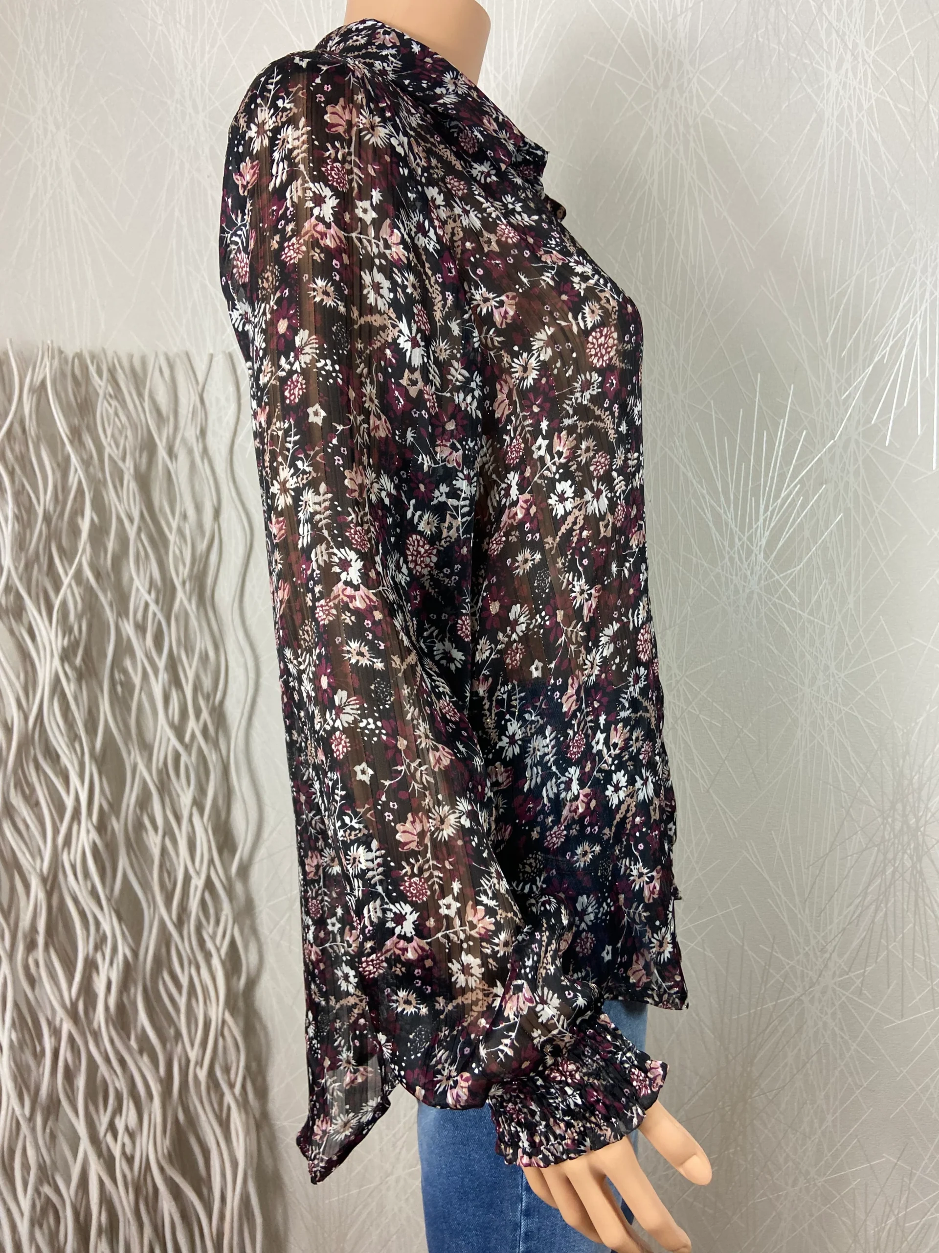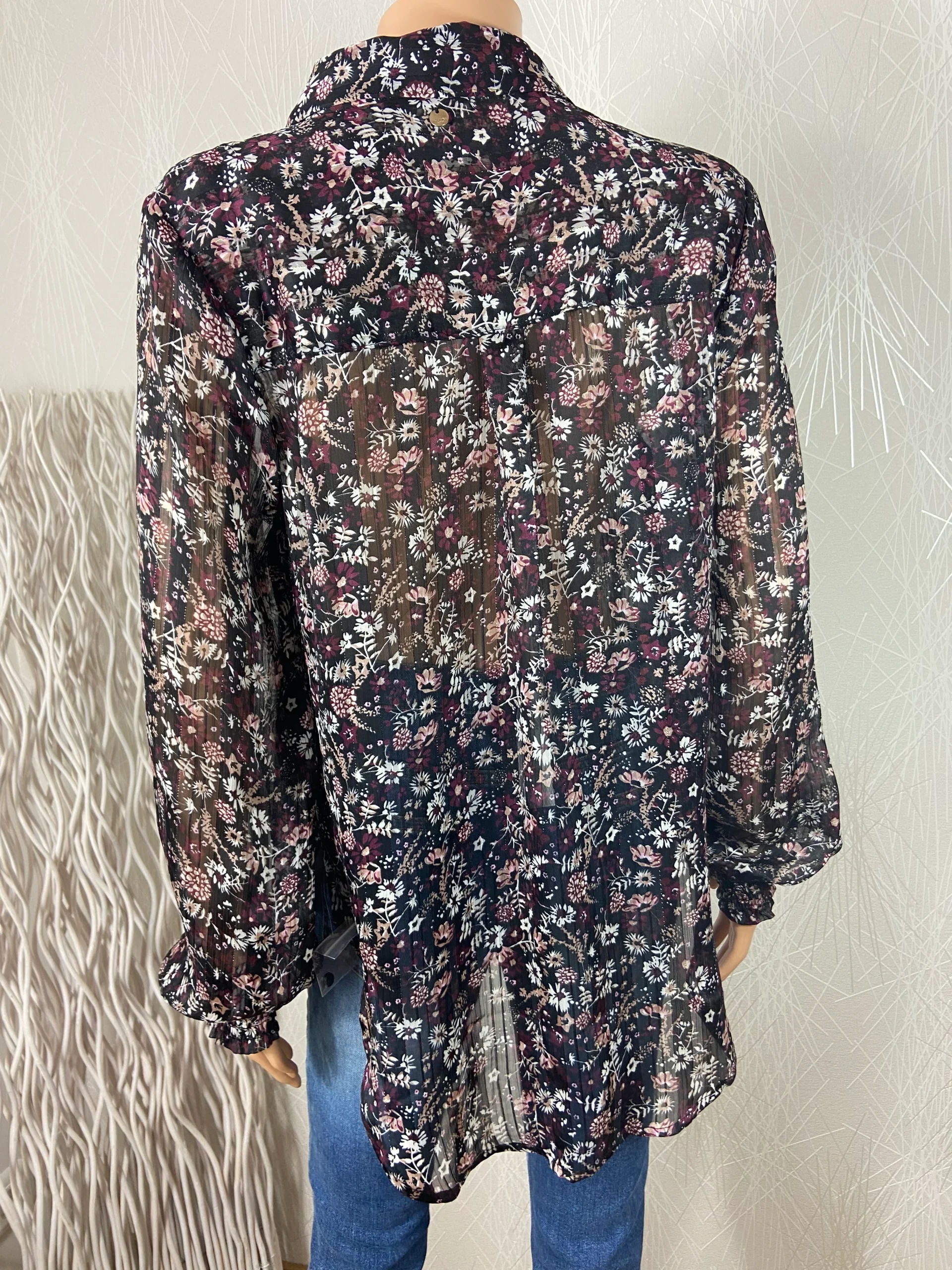 Tissu imprimé floral, rayures en jacquard et fils dorés, coupe droite, plus long à l’arrière et manches longues avec stretch aux poignets.