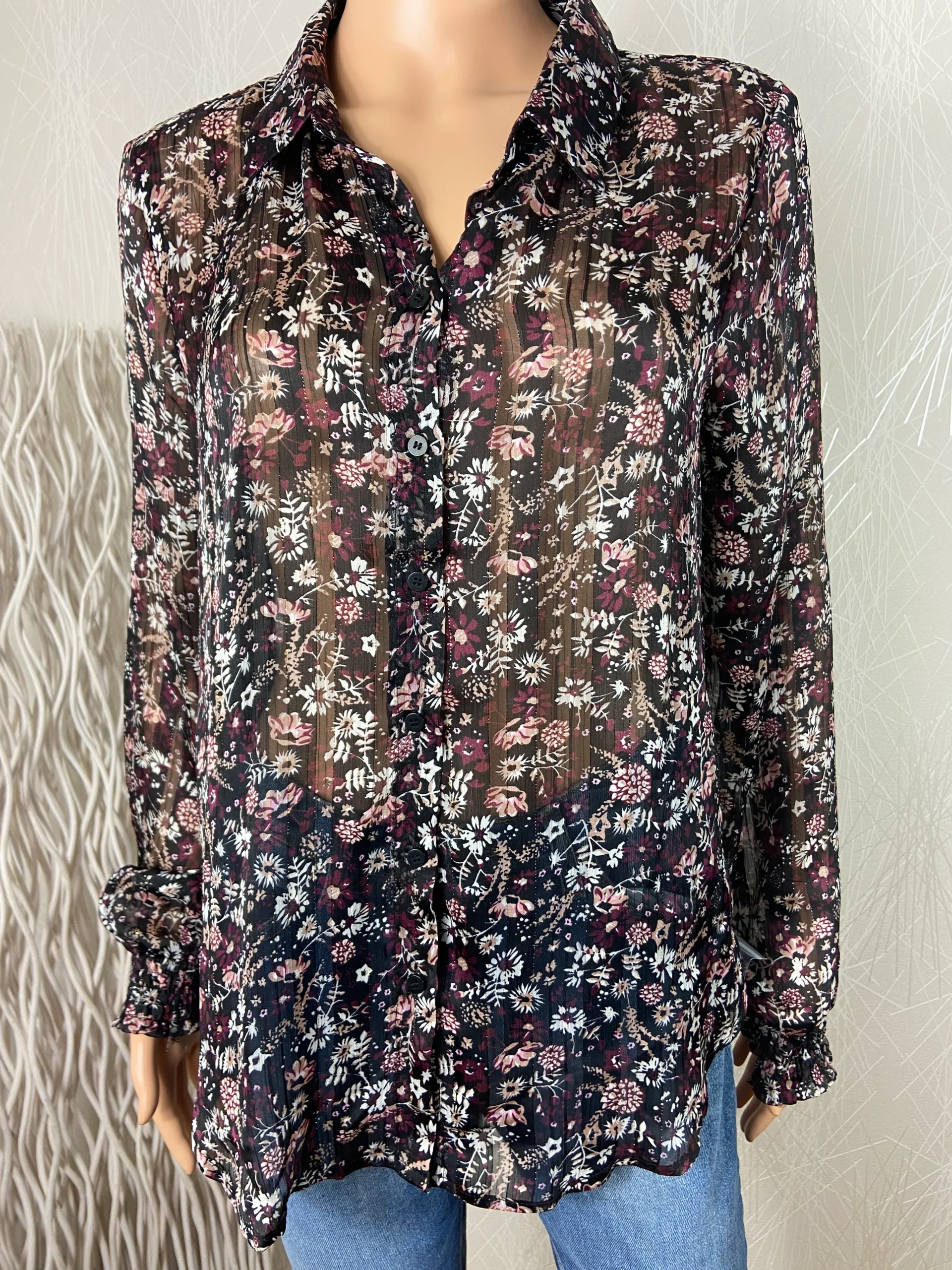 Joli chemisier pour femme légèrement transparent de la marque Deeluxe. Tissu imprimé floral, rayures en jacquard et fils dorés, coupe droite, plus long à l’arrière et manches longues avec stretch aux poignets. Matière : 100% polyester. Couleur : Noir avec des tons crème, vieux rose, bordeaux et des fils dorés. Maque : Deeluxe Taille : […]