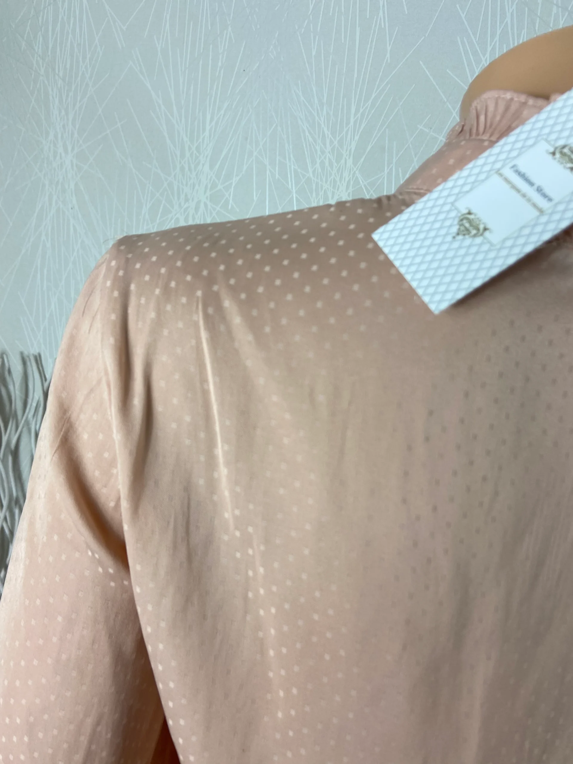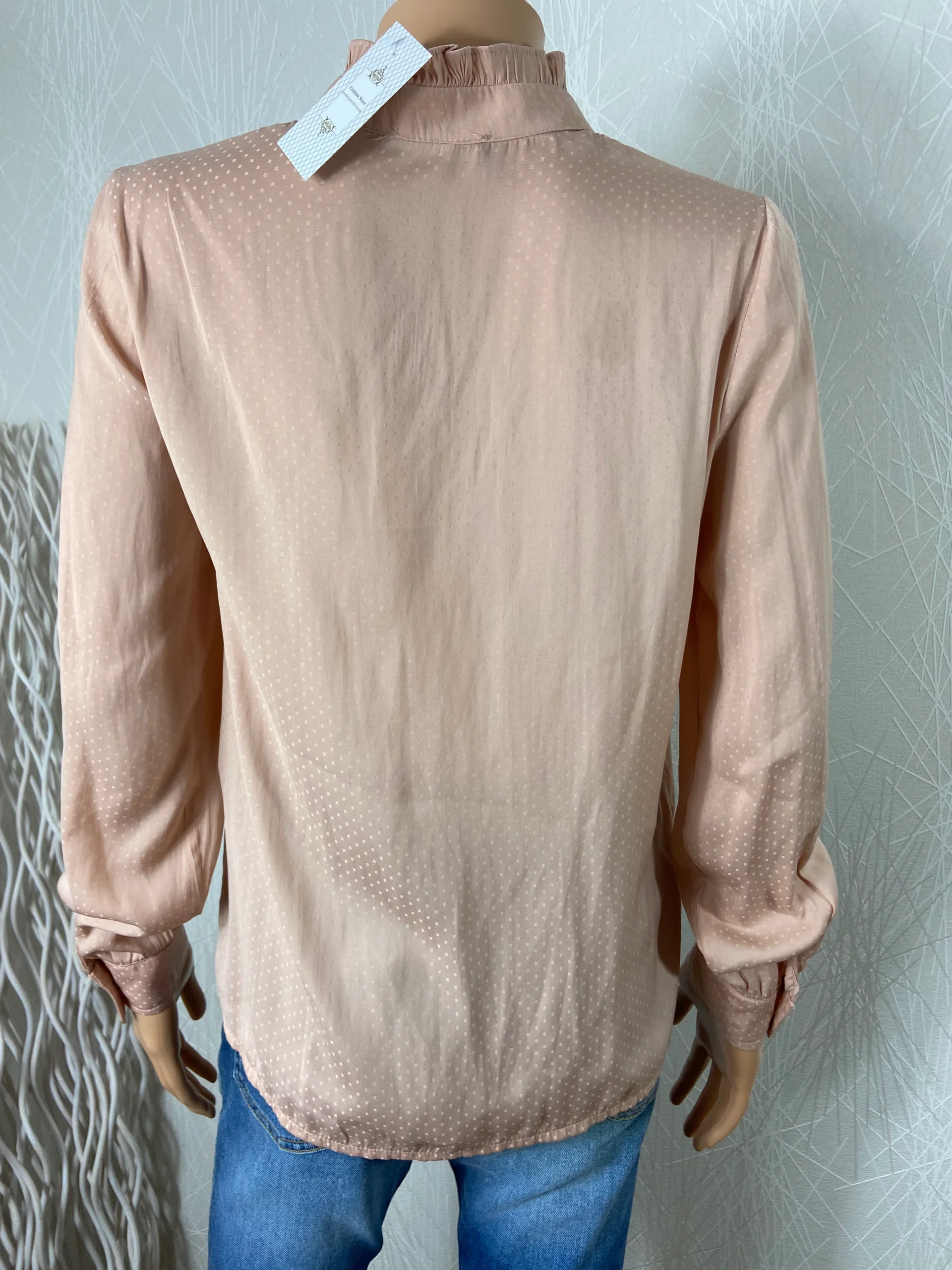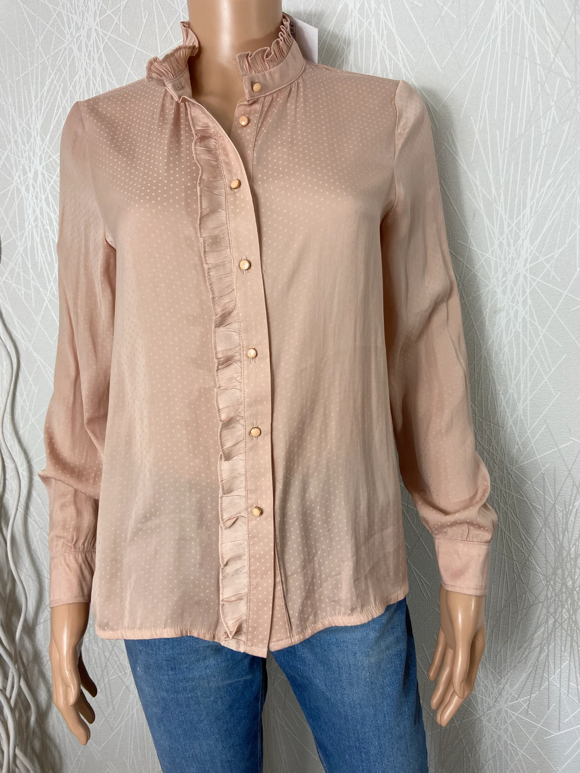 Chemisier à manches longues de la marque Sweed Paris. Entièrement boutonné, boutons aux poignets, encolure ras du cou et légèrement transparent. Matière : 100% polyester. Couleur : Vieux rose. Taille : S / 36 – Réf : 36MC1780 Dimensions : Largeur épaule : 36 cm ; tour de poitrine : 96 cm ; longueur : […]
