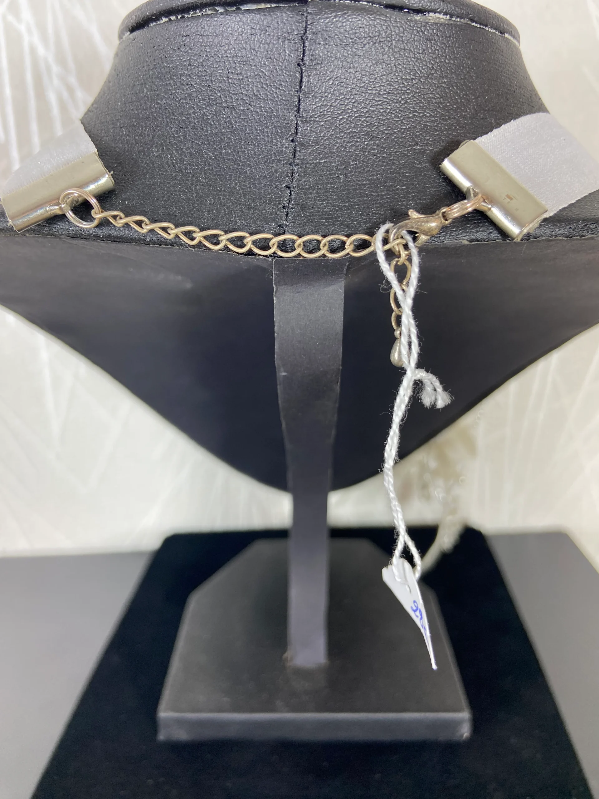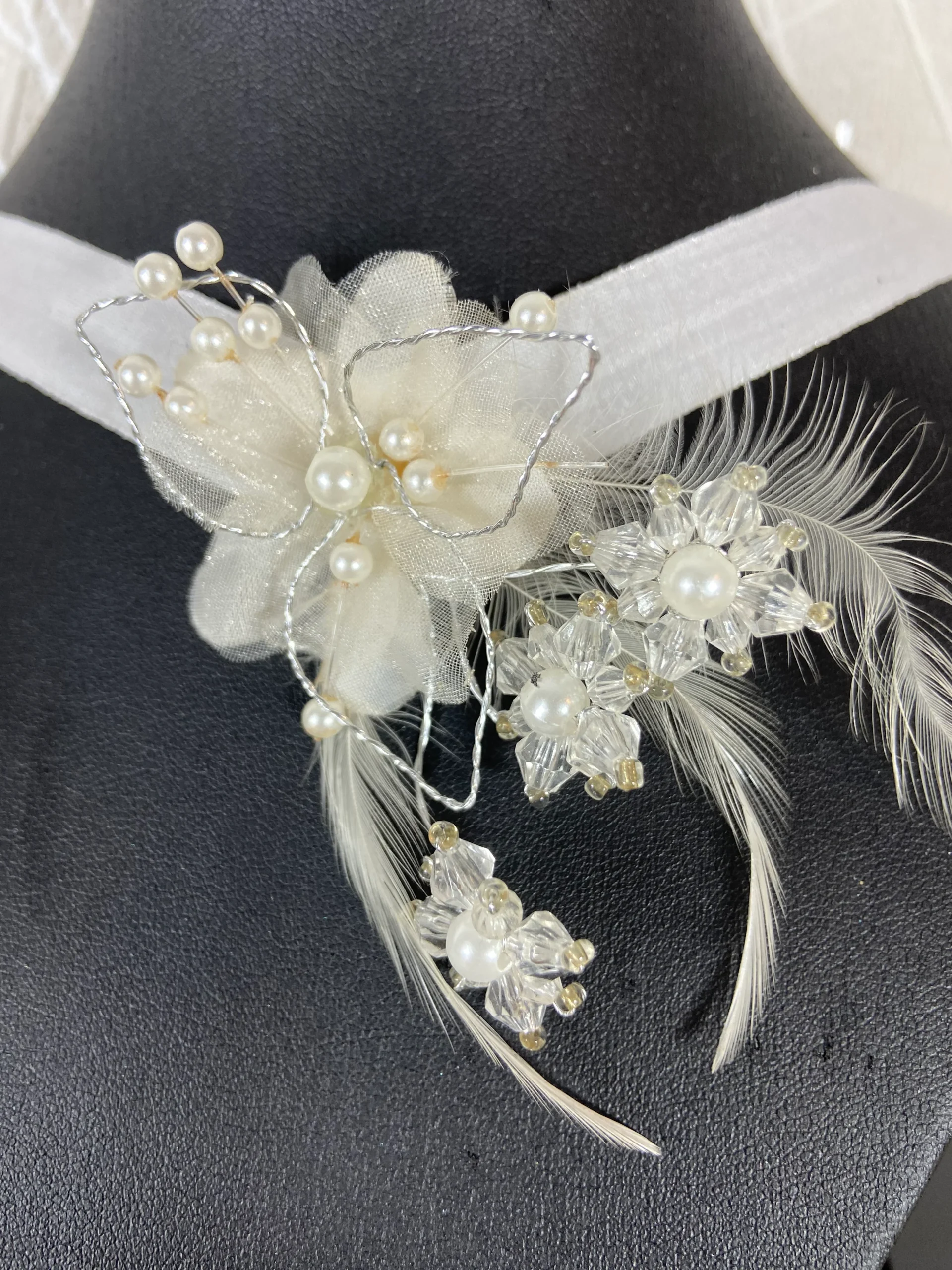 Collier de mariage avec fleurs en perles et plumes sur ruban blanc. Parfait pour compléter une tenue de mariage ou de cérémonie. Très bel effet. Couleur : Blanc Réf : COT5942 Dimensions : Longueur : de 43 à 48 cm. Valeur en boutique 28 €.