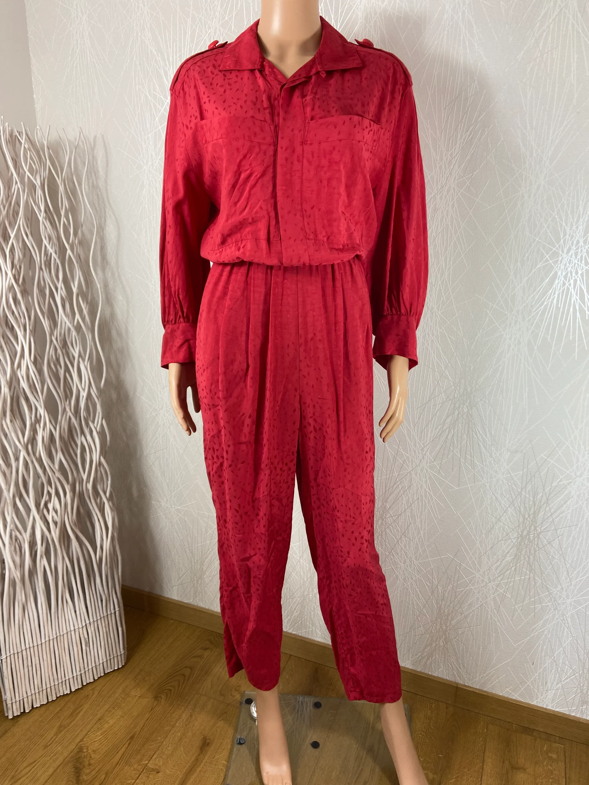Combinaison pantalon modèle Jude de la marque Jane Wood. Fluide, manches longues, élastique à la taille, 2 poches et 2 poches à la poitrine. Matière : 100% viscose. Couleur : Rouge. Dimensions Taille 38 : Largeur épaule : 48 cm ; tour de poitrine : 116 cm ; longueur : 153 cm ; longueur entrejambe […]
