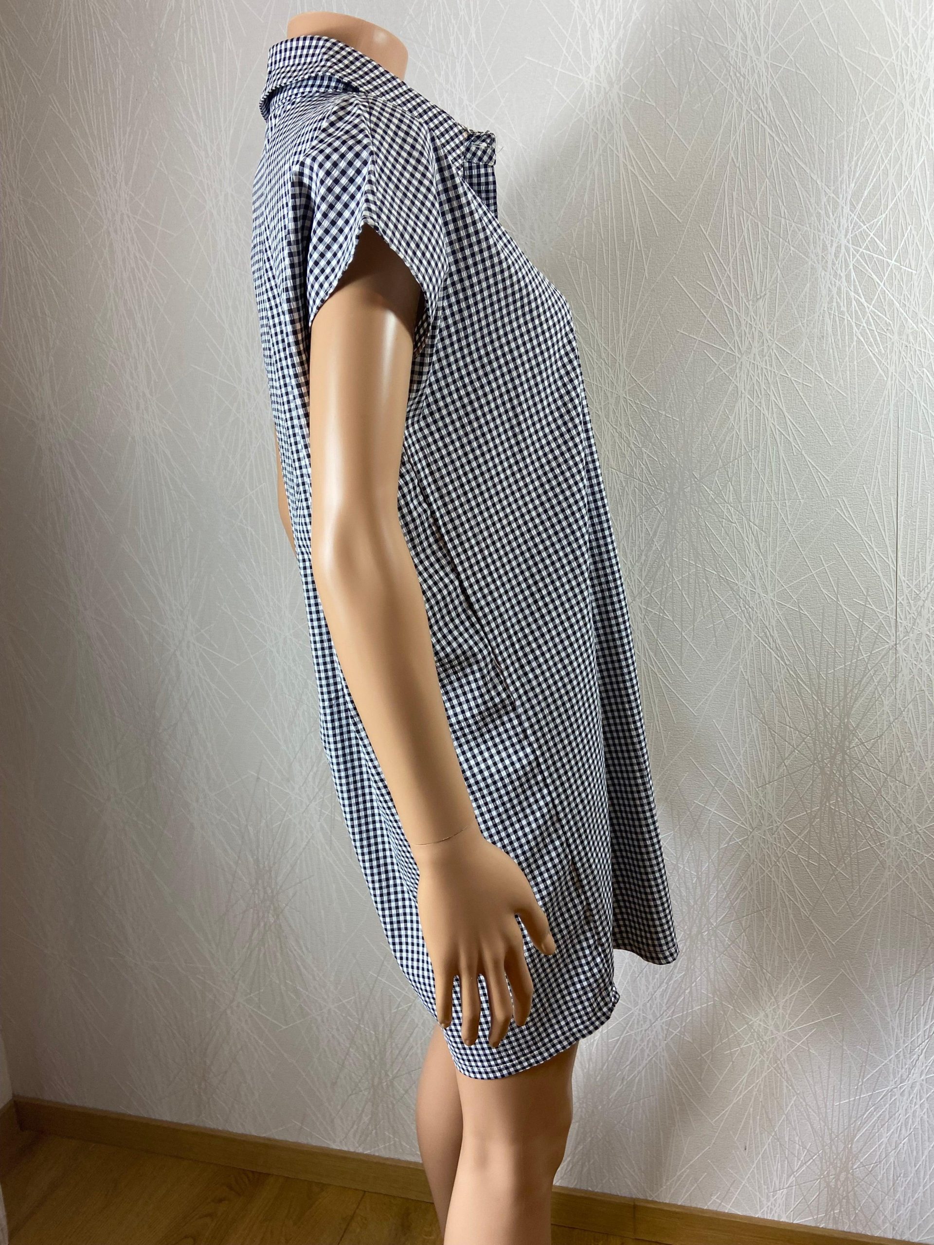 Manches courtes, avec col, boutonné, tissu à petits carreaux et coupe droite.