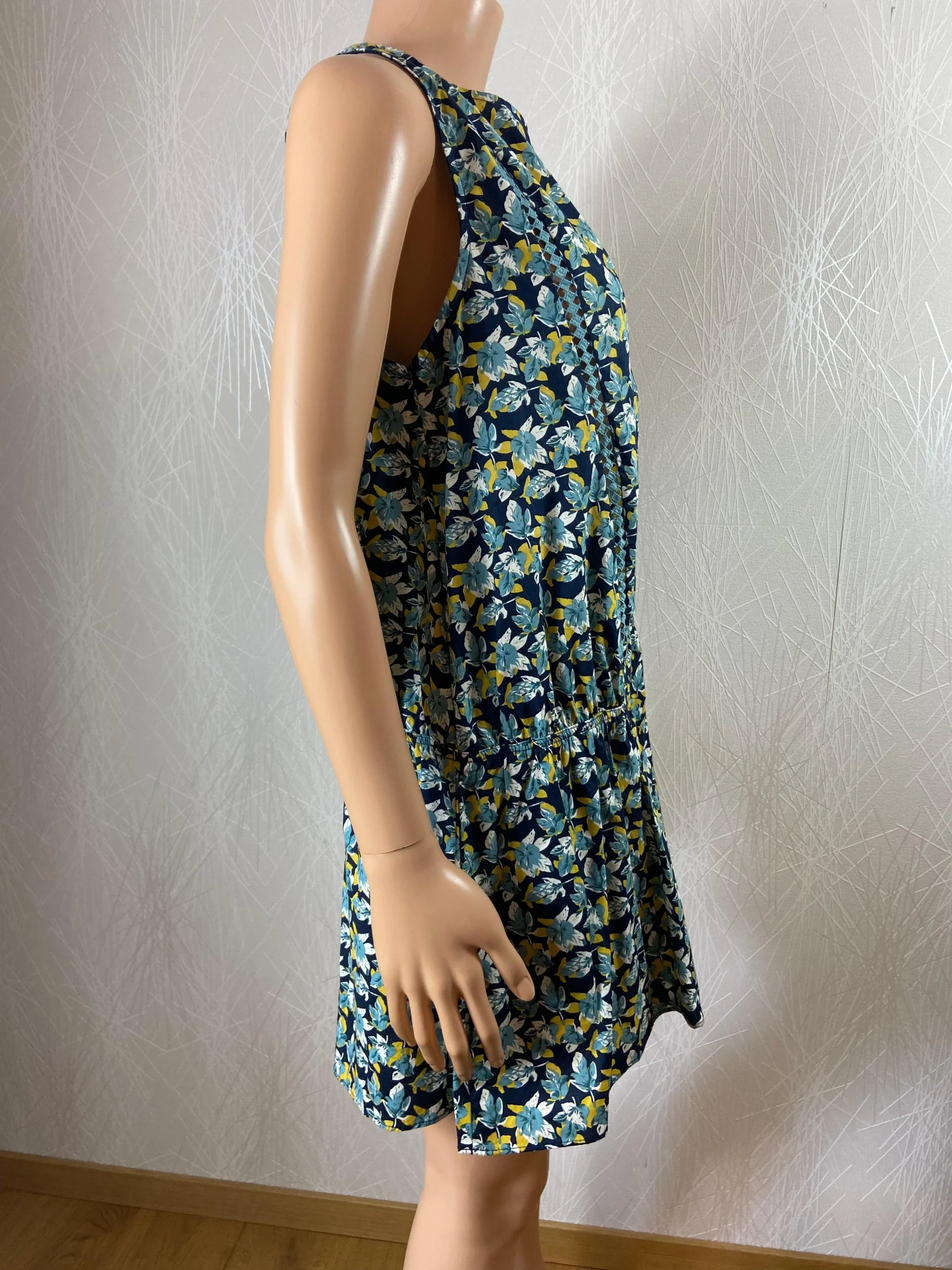 Tissu à motif fleuri multicolore, doublé en bas, fermeture goutte d’eau à l’arrière et échancré dans le dos.