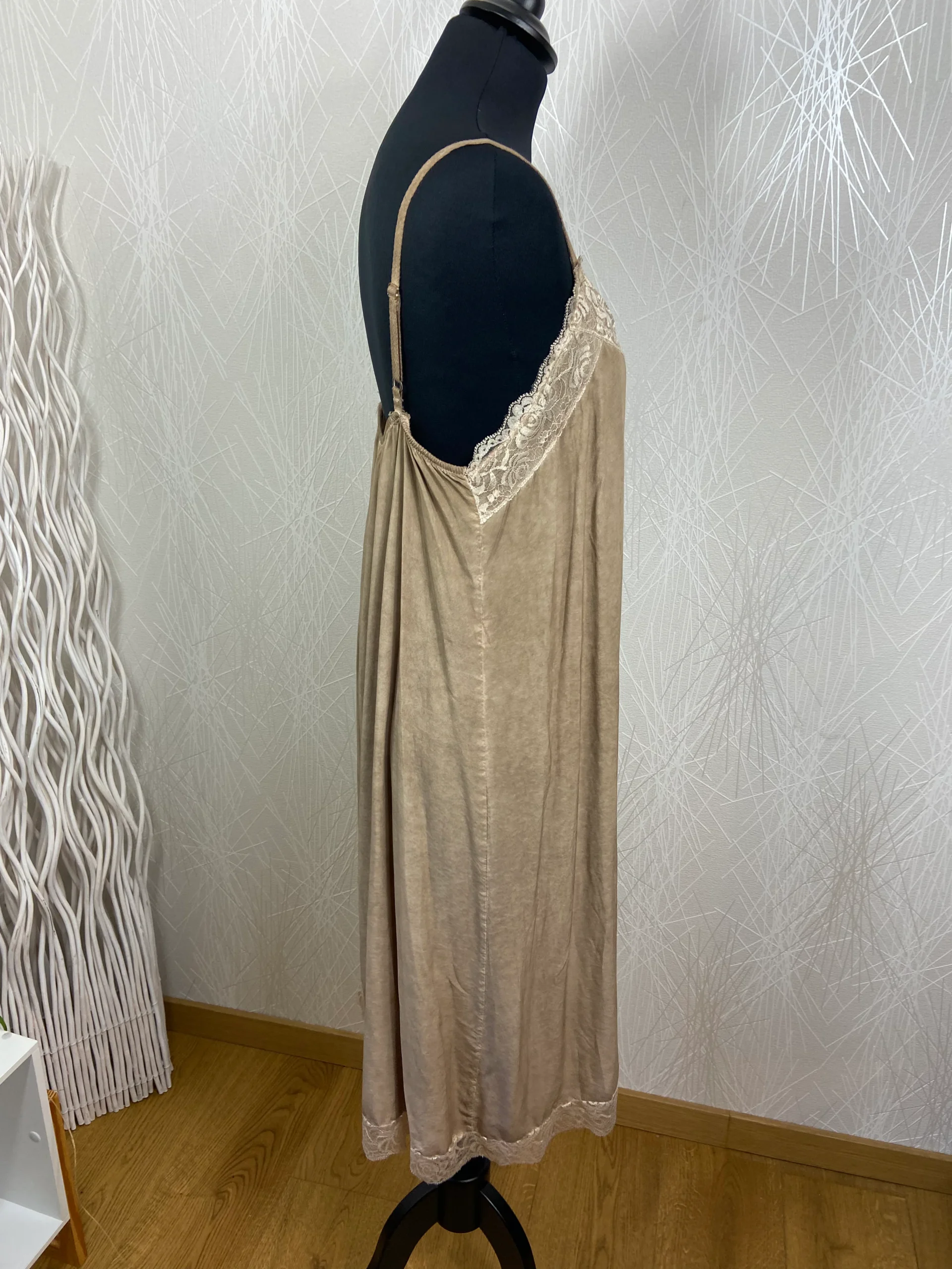 Bretelles réglables, encolure ronde avec dentelle et bas du dessous de robe en dentelle.