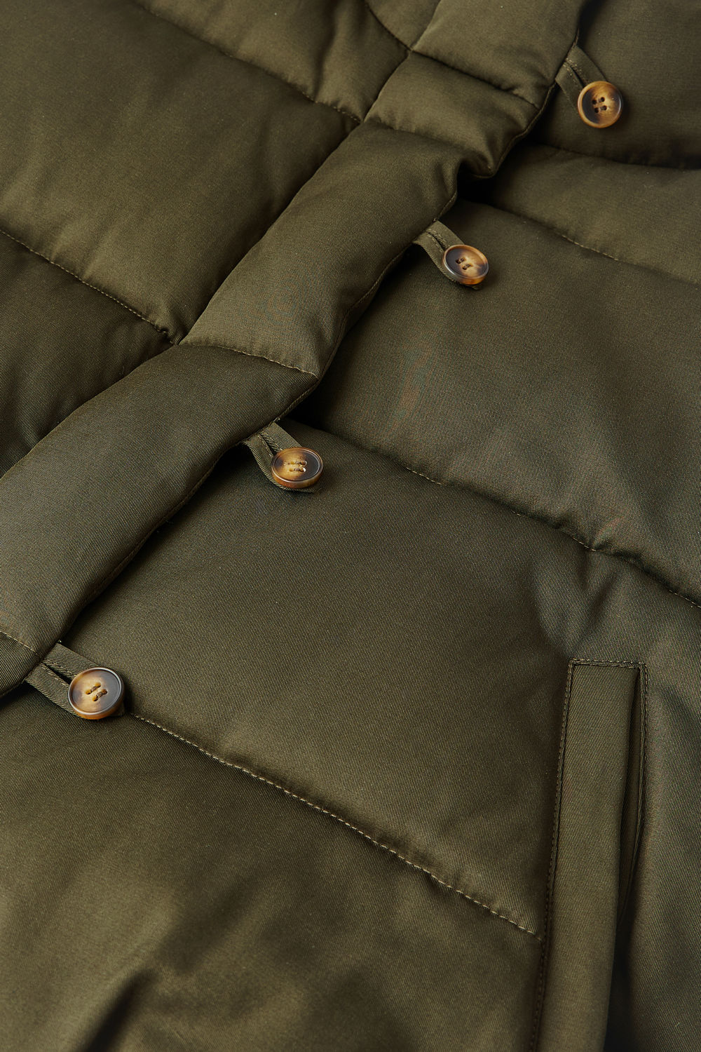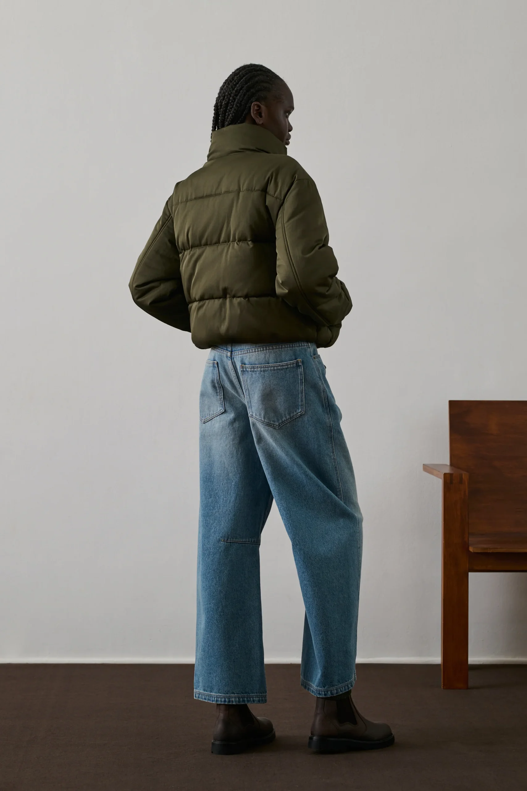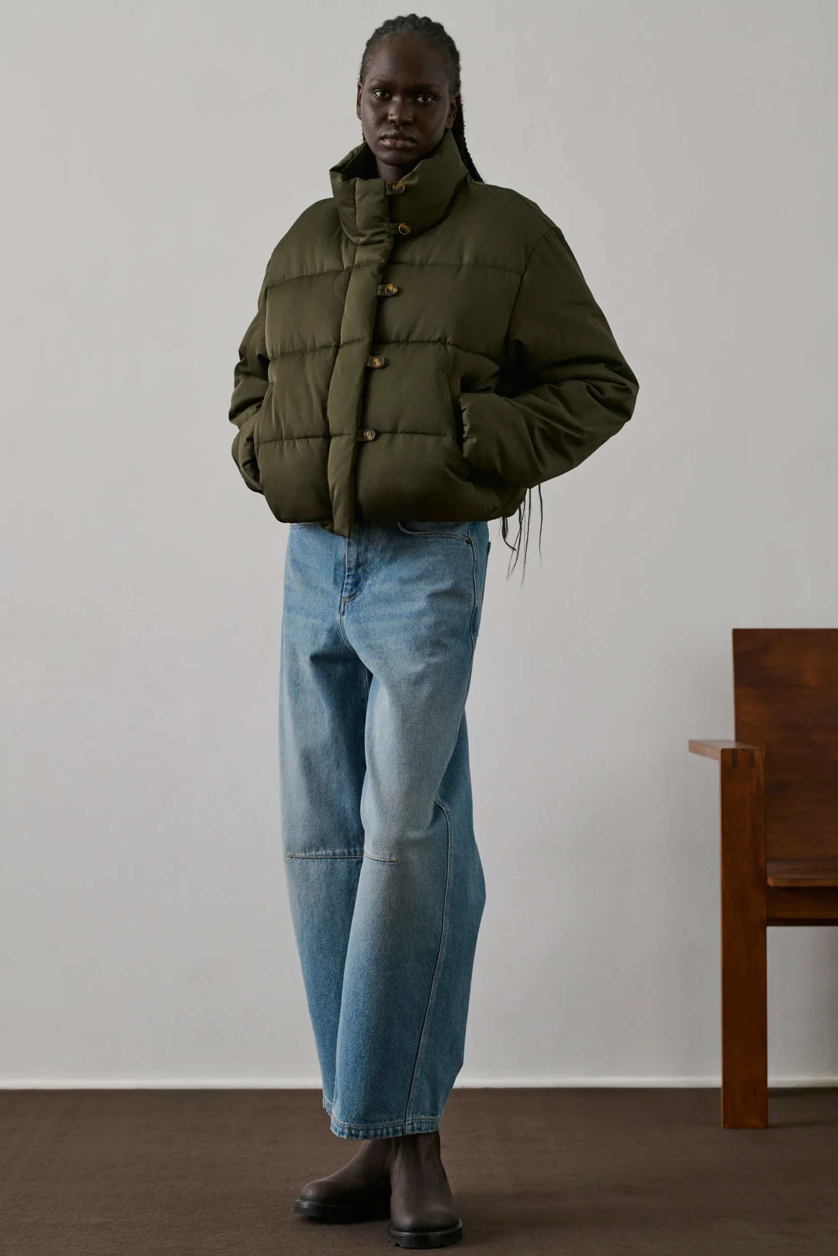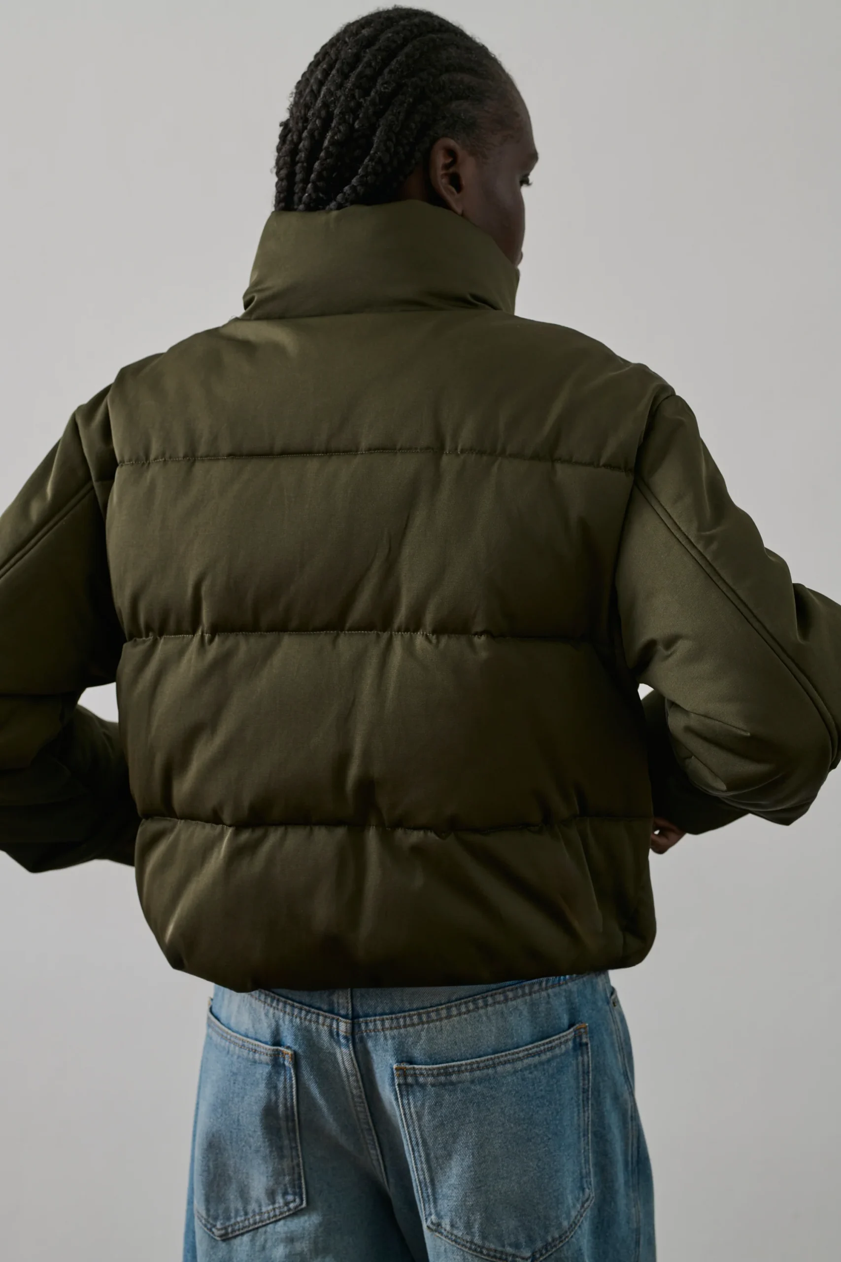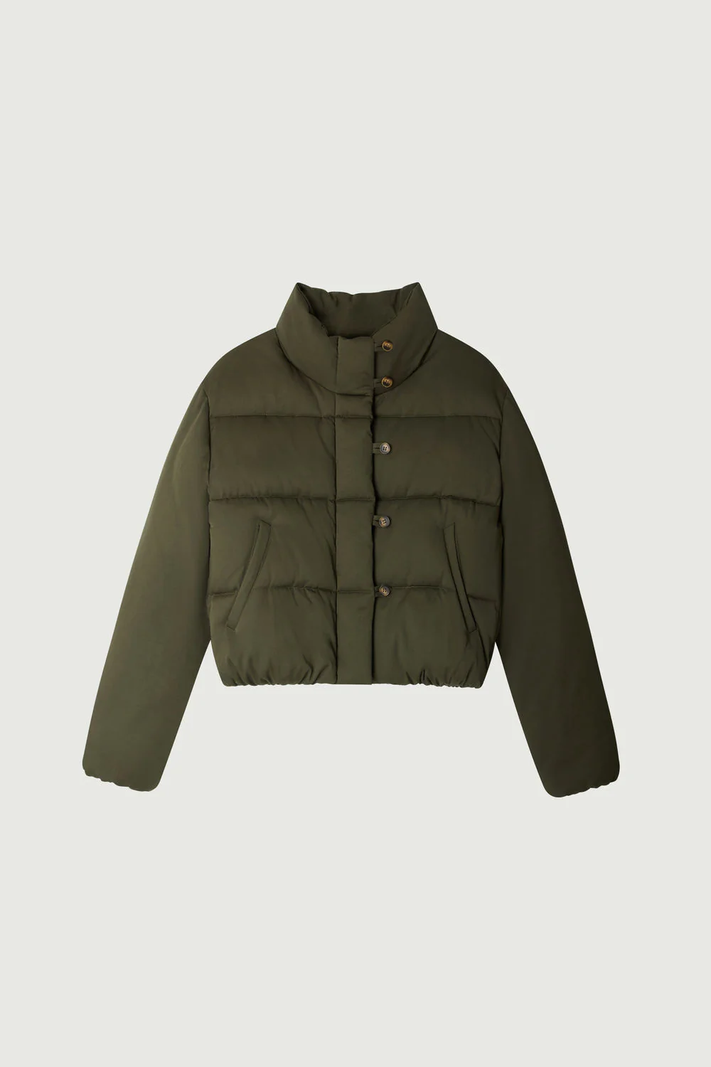 FLORE est une doudoune courte kaki à la coupe ample et boule. Son col montant et son ouverture boutonnée lui confèrent une allure moderne. Les poches passepoilées ajoutent une touche de style. Le bas élastiqué renforce l’effet arrondi. En coton déperlant, elle assure chaleur et protection en hiver.