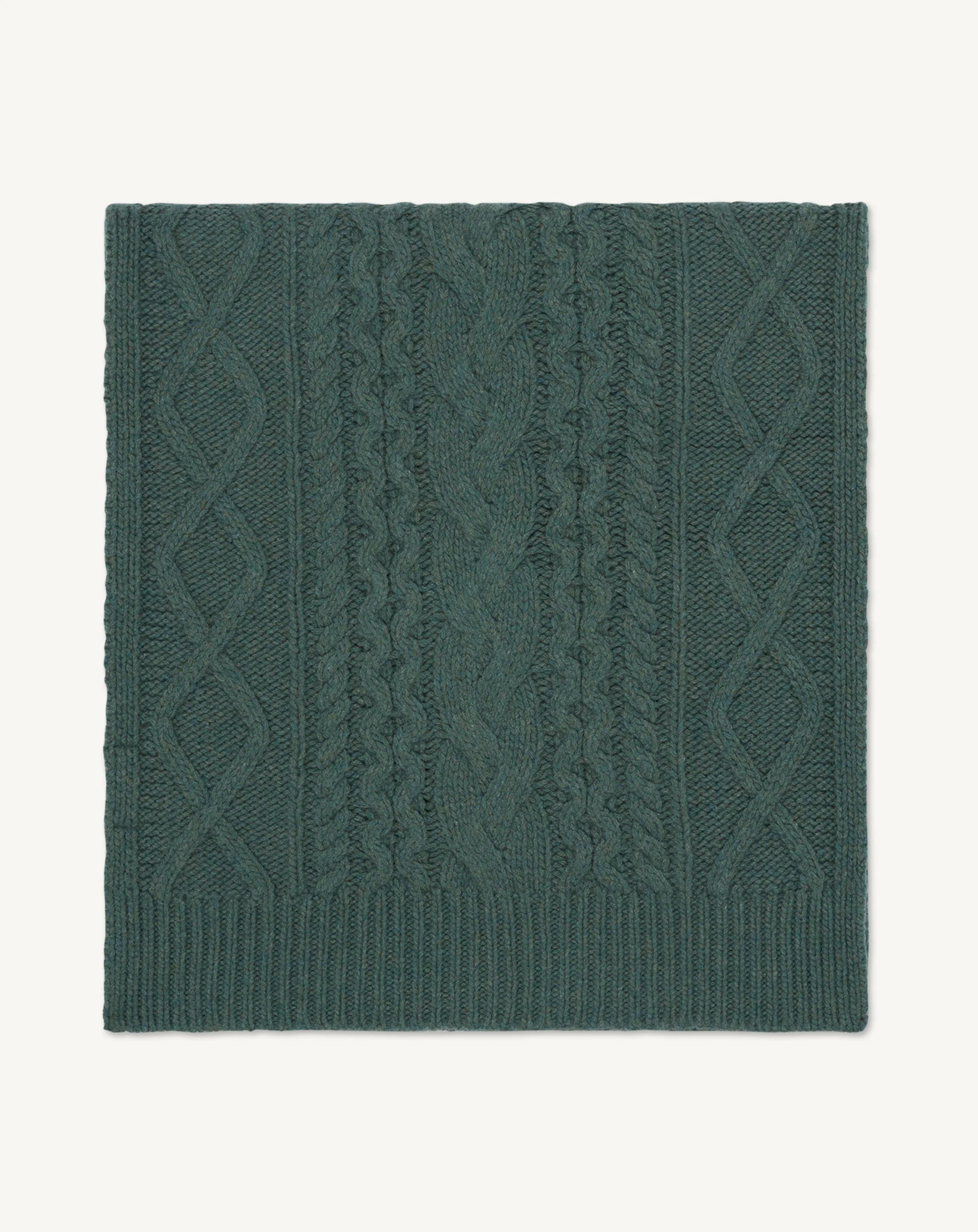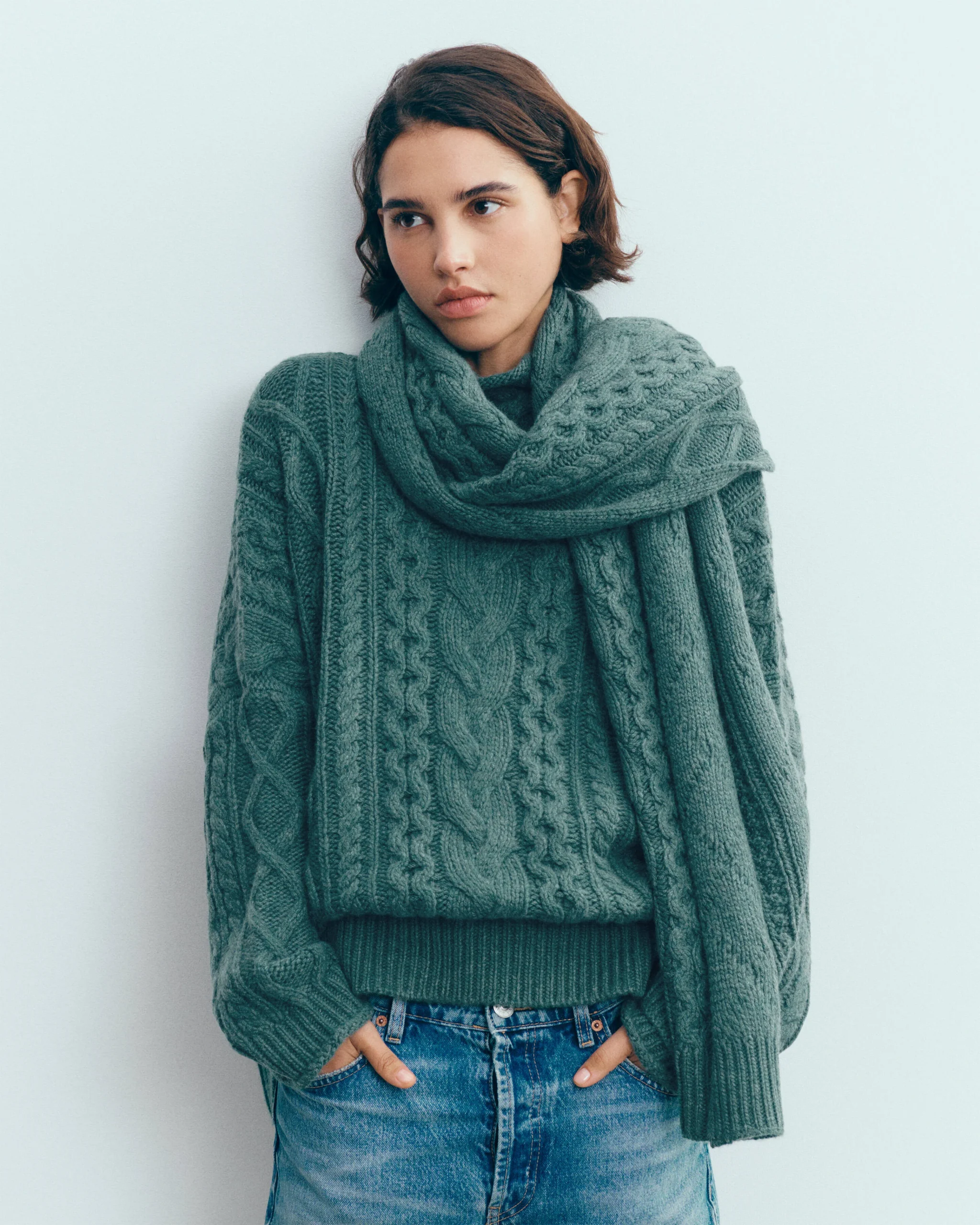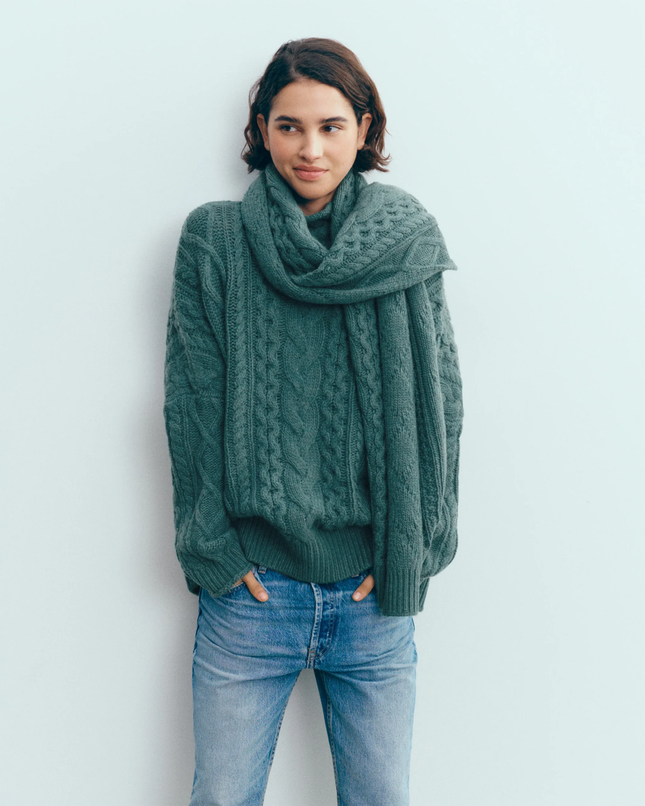 Écharpe à torsades tricotée en cachemire. Ce modèle s’inscrit dans la collection capsule des quarante ans de la Maison Bompard, célébrant la couleur et le savoir-faire torsadé.
