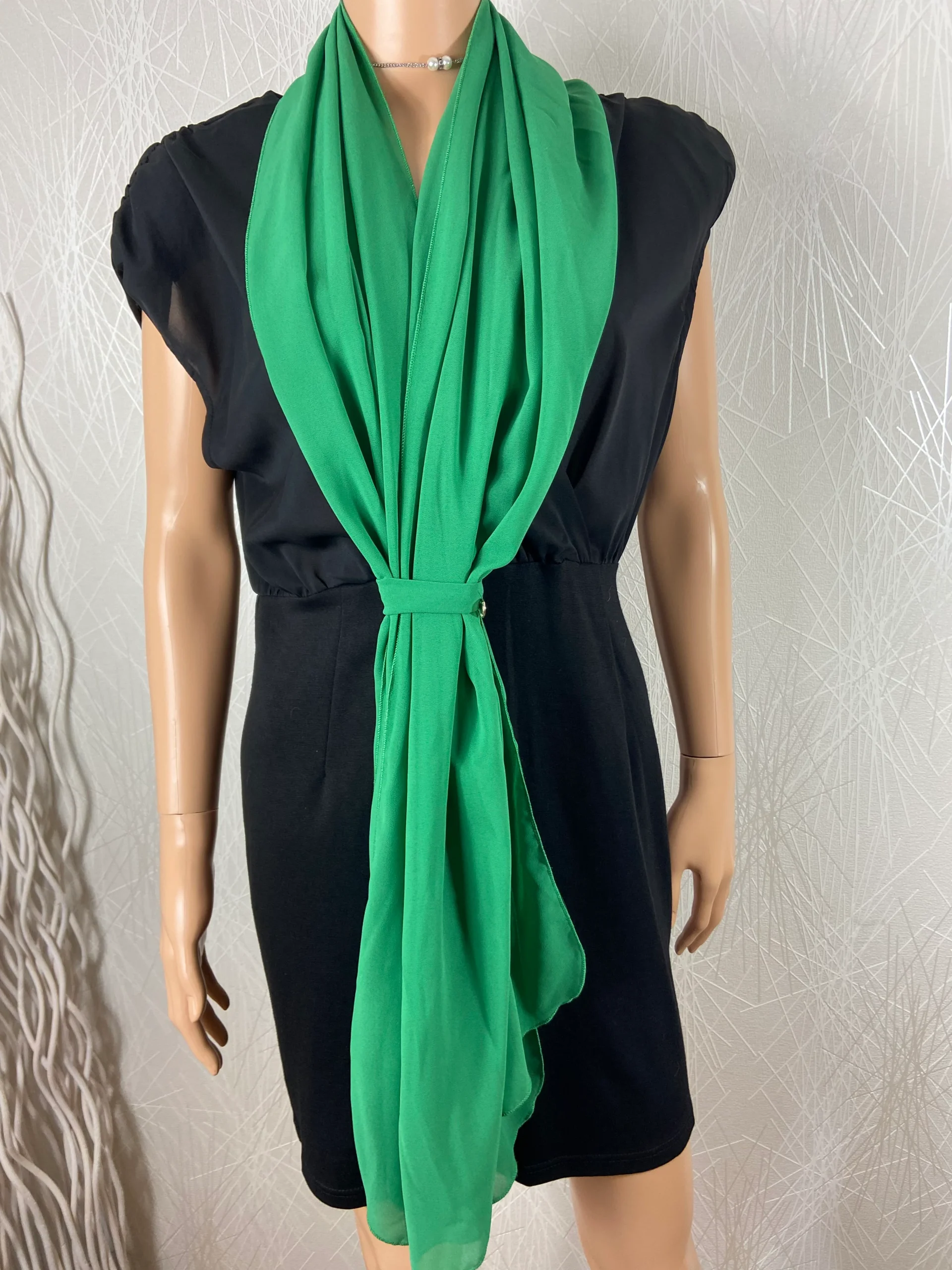 Écharpe en voile vert de style cravate de la marque Rinascimento. Matière : 100% polyester Couleur : Vert Marque : Rinascimento Taille unique – Réf : TUSE5973 Dimensions : Longueur : 180 cm ; largeur : 65 cm. Valeur en boutique : 45€