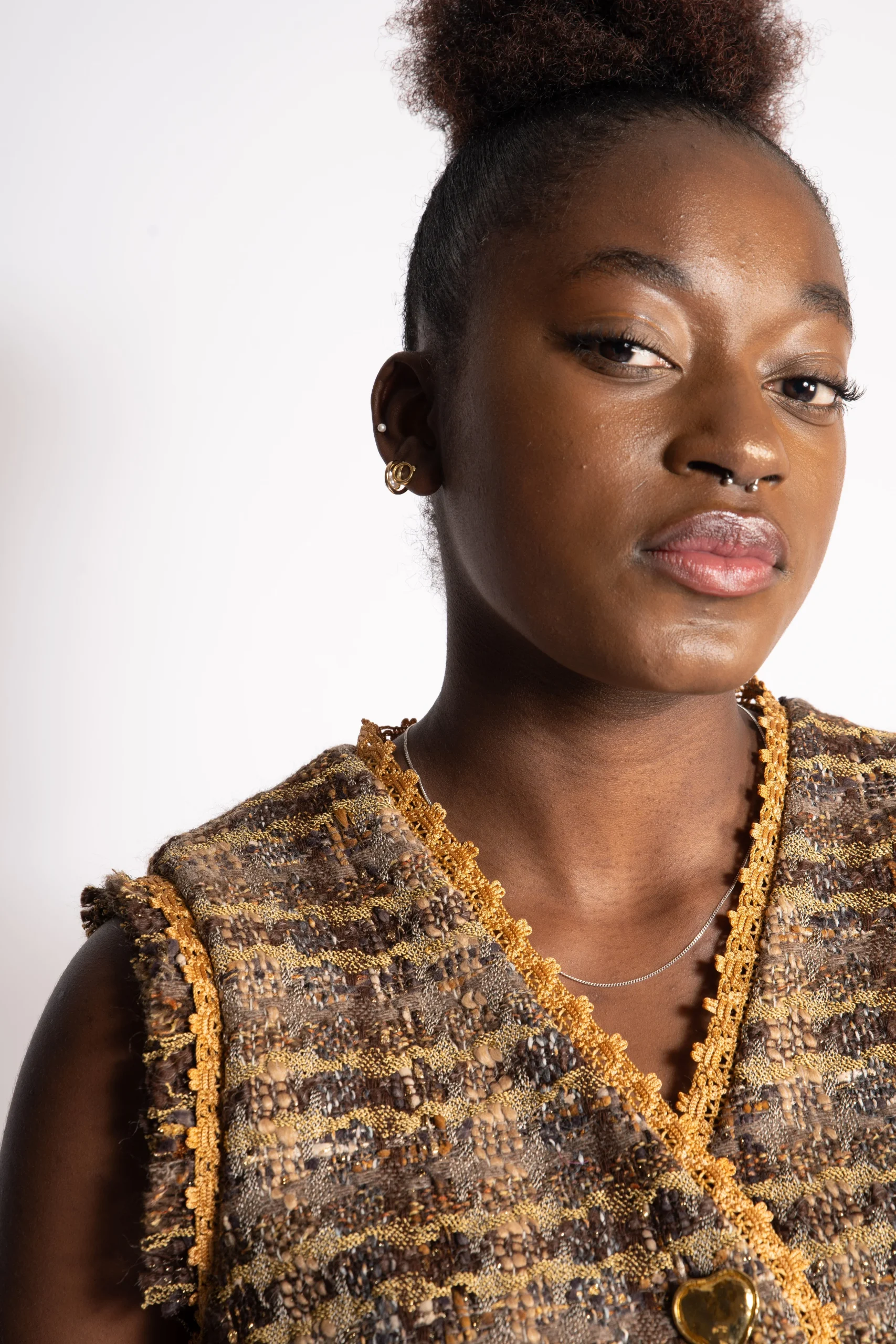Veste sans manches en tweed français laine, coton et lurex. Doublure de qualité, bouton vintage selon les disponibilités. Détails galon doré, esprit western raffiné. Le mannequin porte une taille 38. Fabriquée en France.