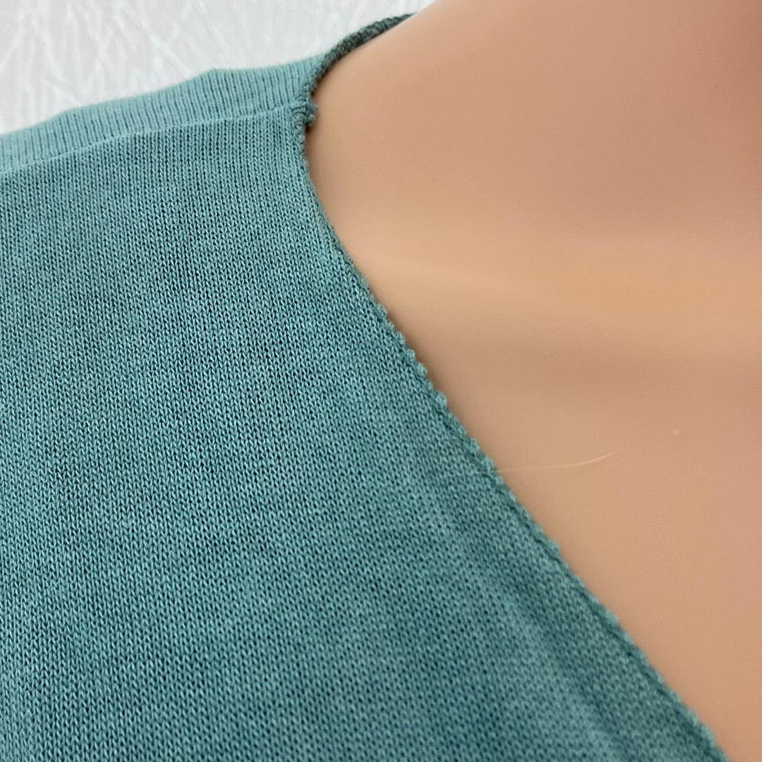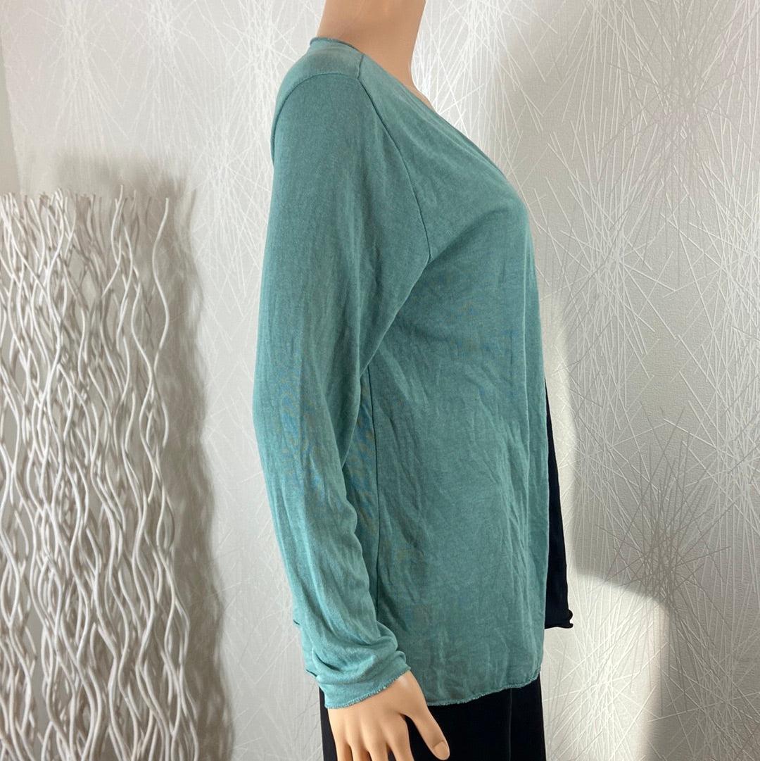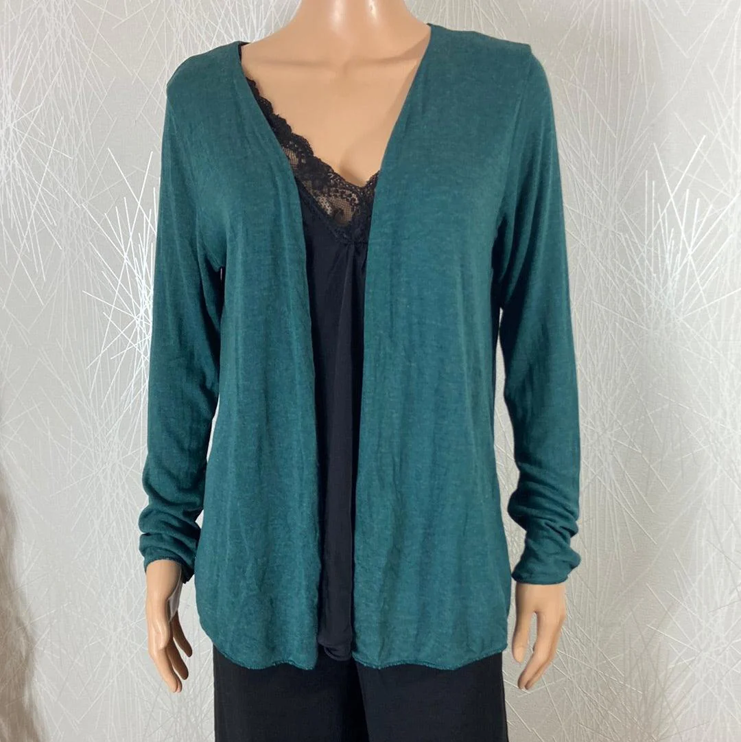 Gilet à manches longues et maille fine pour femme. Matière : 70% viscose – 25% polyester – 5% elasthanne Couleur : Vert eau ou bleu canard (très proche du vert) Taille Unique Dimensions : Largeur épaule : 40 cm ; tour de poitrine : 104 cm ; longueur : 65 cm.