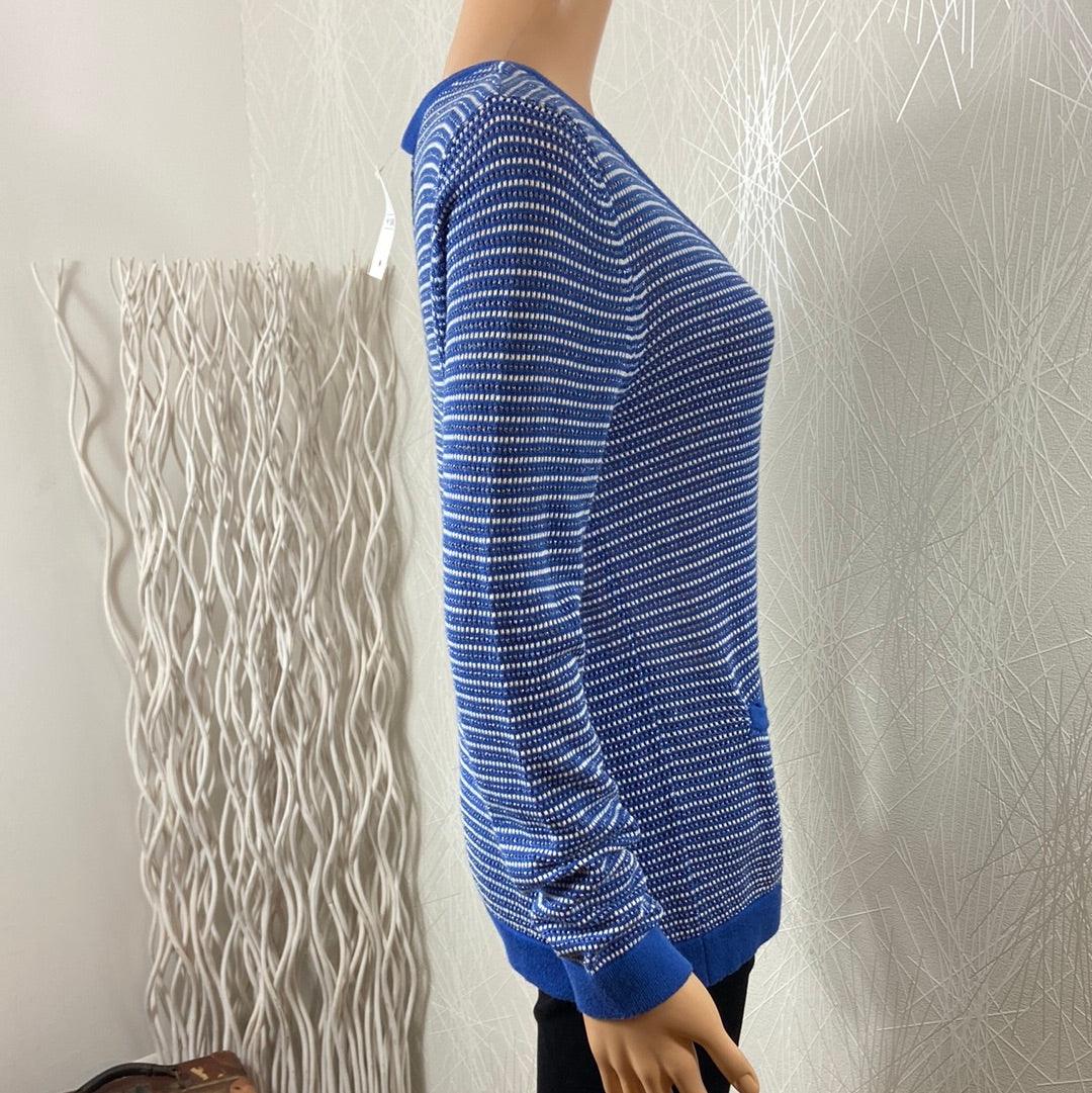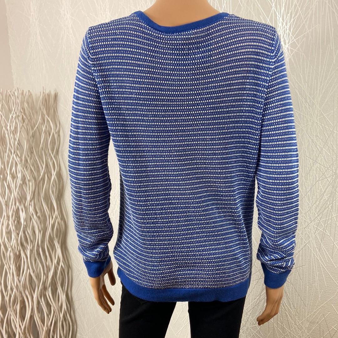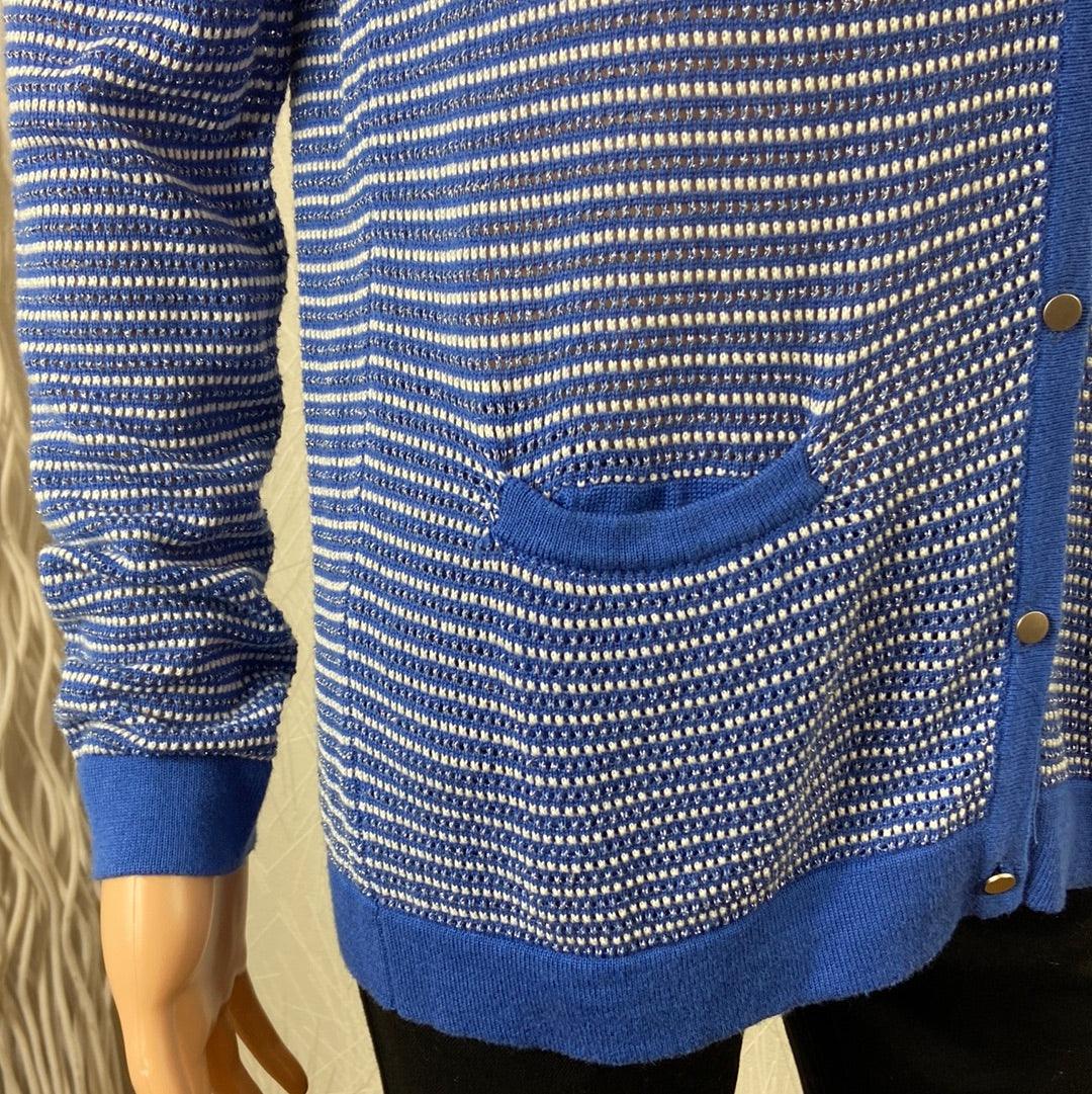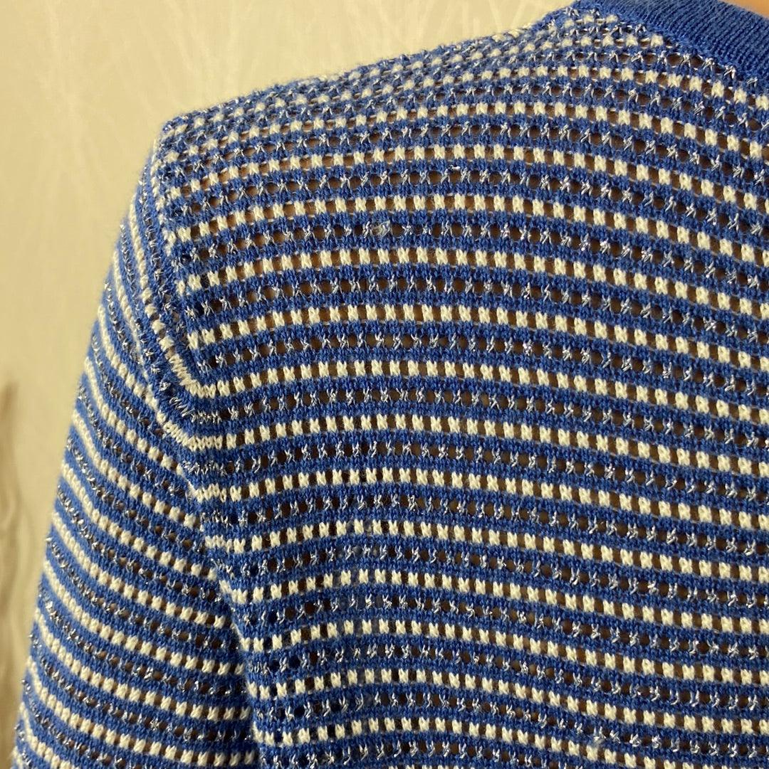 Gilet rayé bleu, blanc avec fils argéntés pour femme de la marque Grace & Mila.