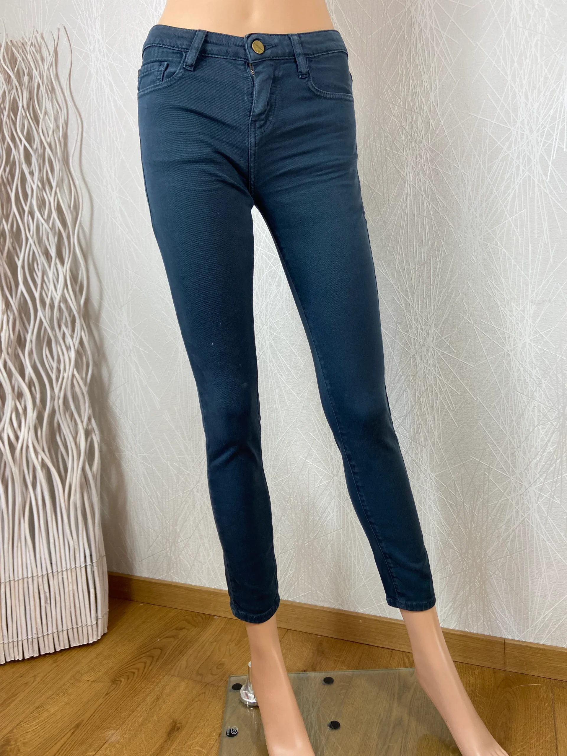 Jean pour femme de la marque Acquaverde. Coupe slim, fermeture par zip et boutons, passants pour ceinture et 5 poches. Matière : 98,5% Coton – 1,5% Elasthanne Couleur : Bleu pétrole Marque : Acquaverde. Valeur en boutique : 135 €