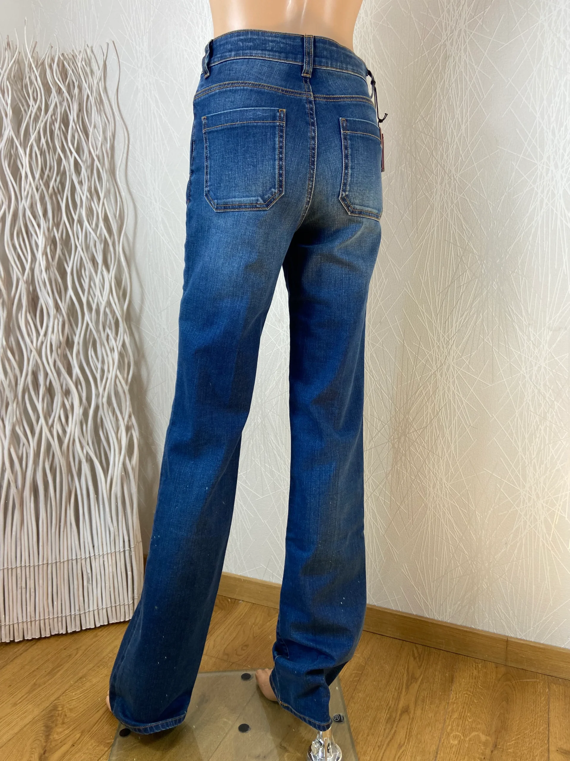 Taille haute, coupe droite, 2 poches à l’avant, 2 poches à l’arrière